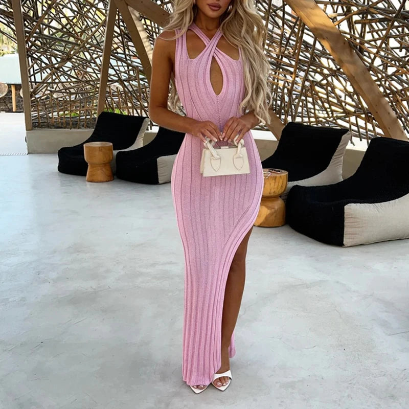 MQTIME - Hot Women Cross Pit Striped Halter Evening Dress Sexy Bag Hips One Piece Solid Party Dress Elegant Hollow Out Vacation Dress