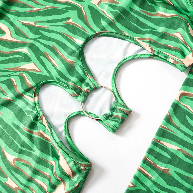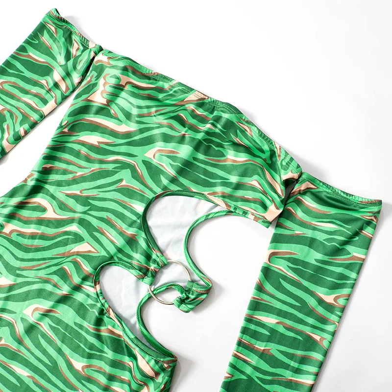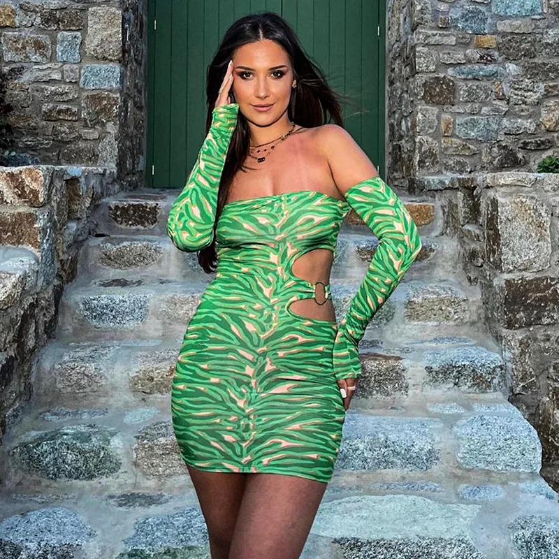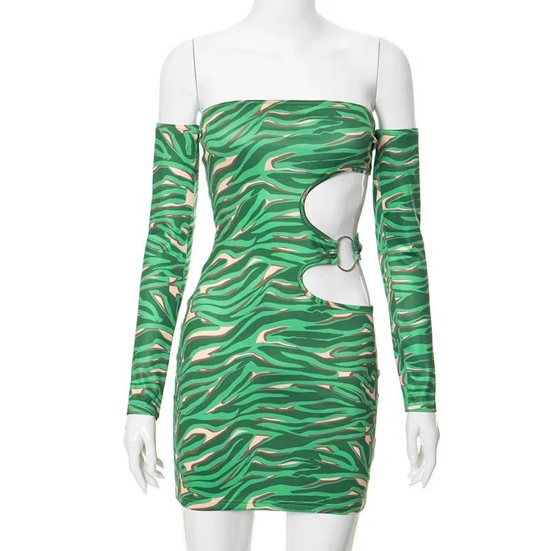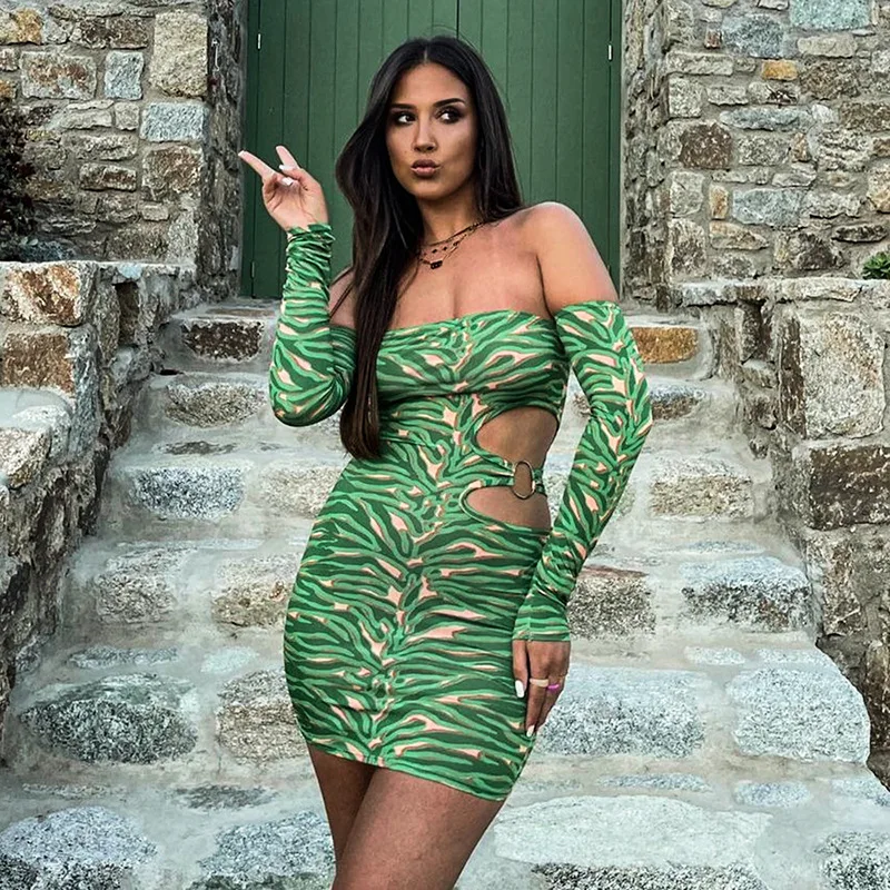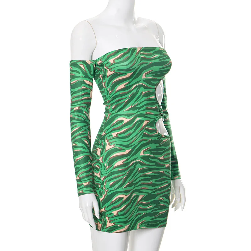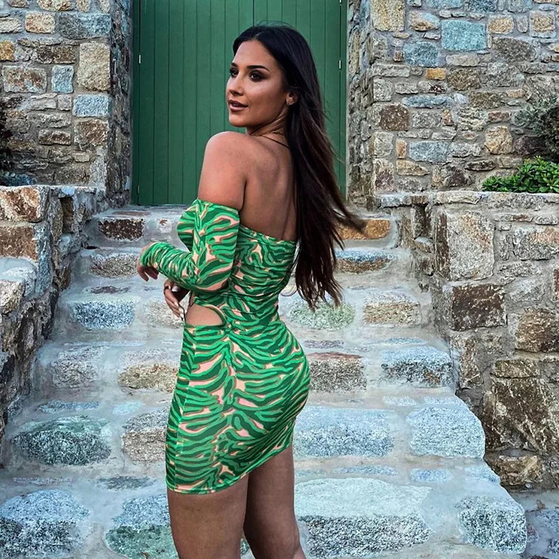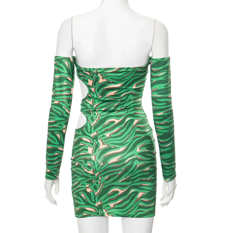 MQTIME - 2024 Spring Hollow Out Printed Women Bodycon Mini Dress Fashion Sexy Strapless Off Shoulder Long Sleeve Backless Party Clubwear