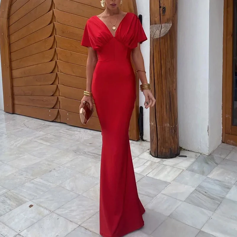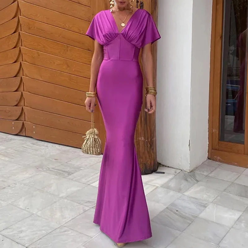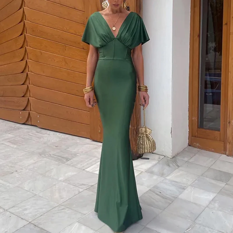 MQTIME - Elegant Satin High Waist Slim Evening Dress Fashion Lady V-neck Short Sleeve Mermaid Dress 2024 New Solid Bodycon Long Dresses