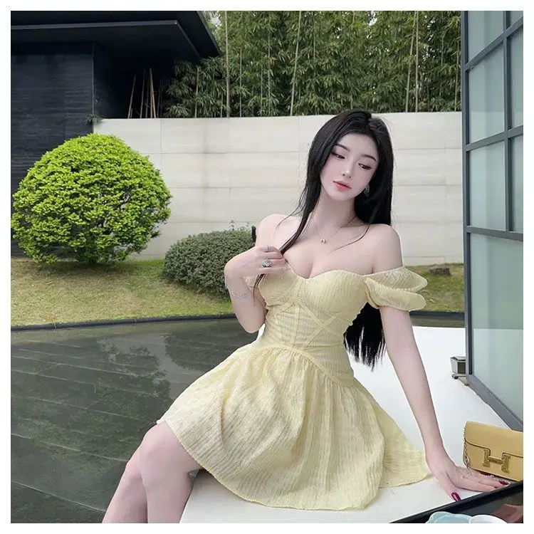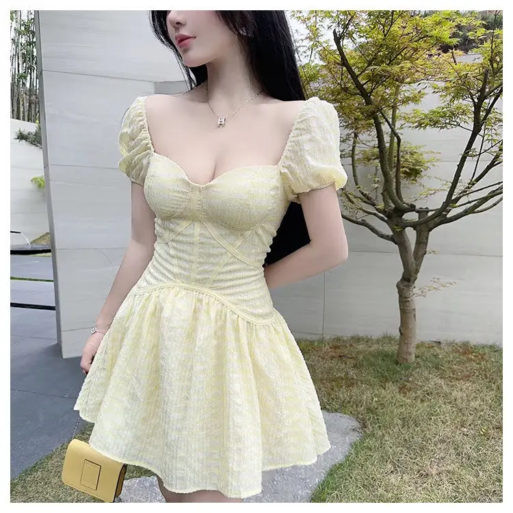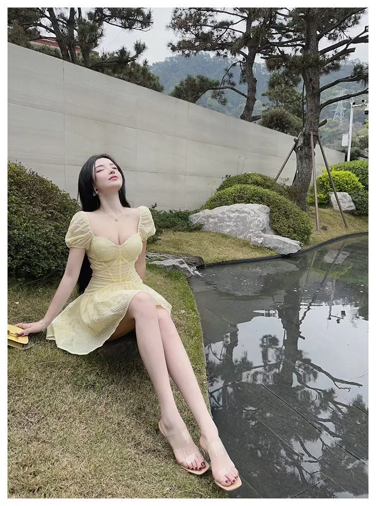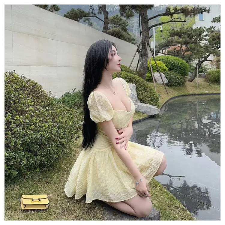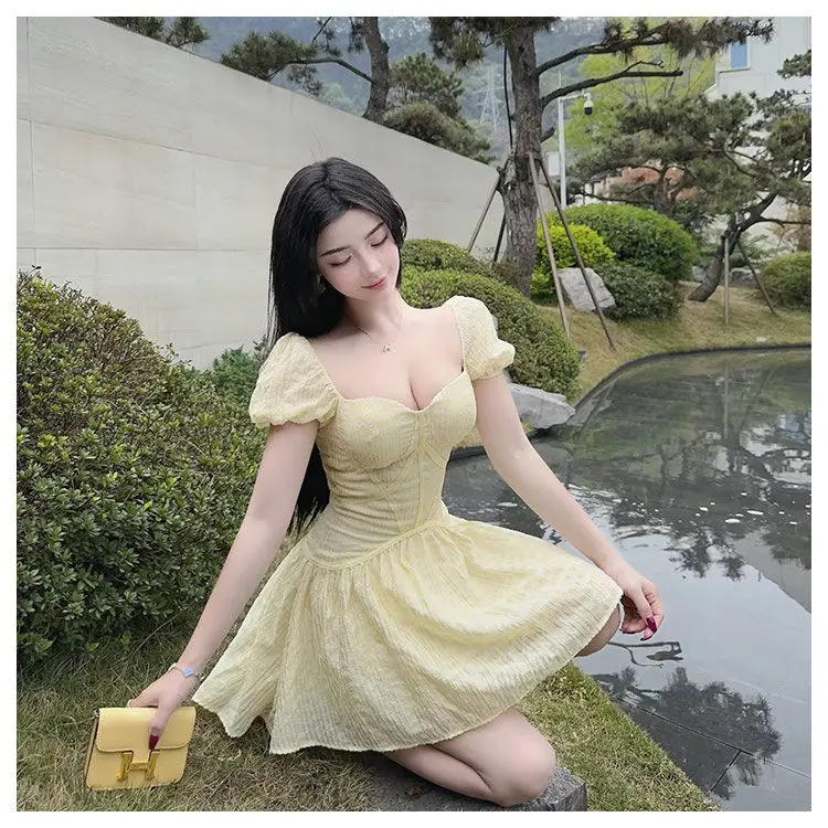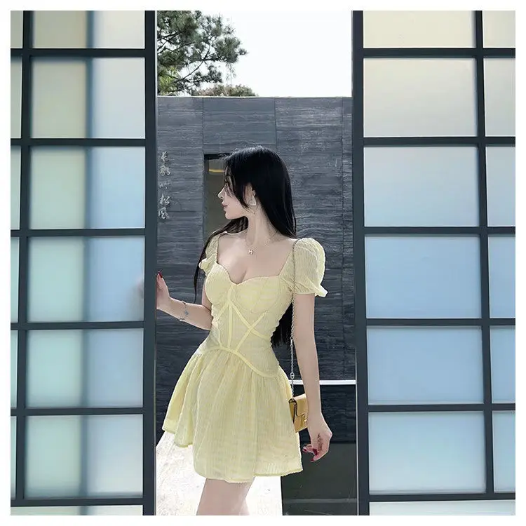 MQTIME - Mini Sweet Dress Yellow Sexy V-neck Bodycon Dresses For Women Summer Korean Elegant Mini Club Party Dress Evening Outfits