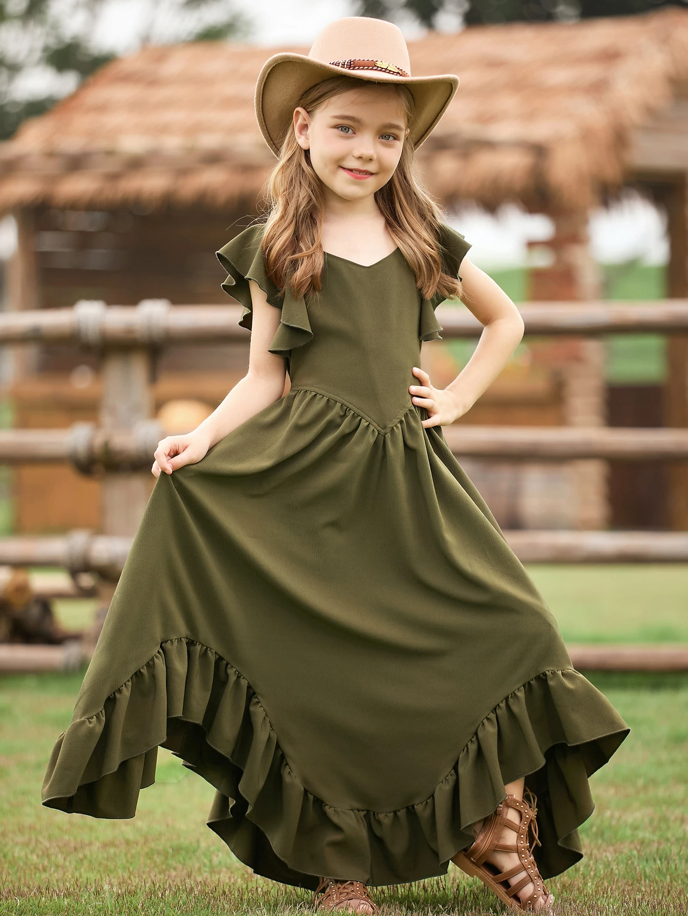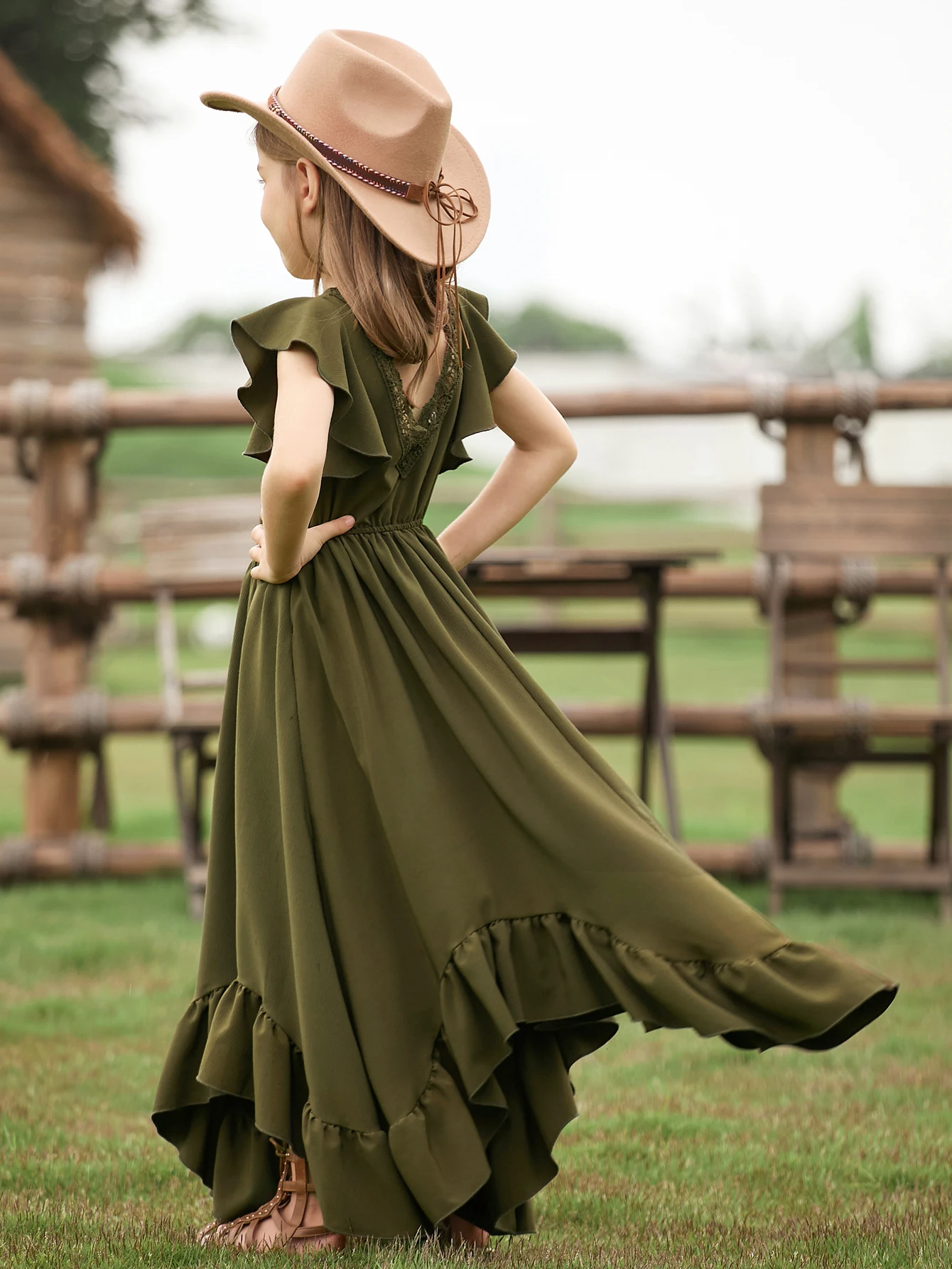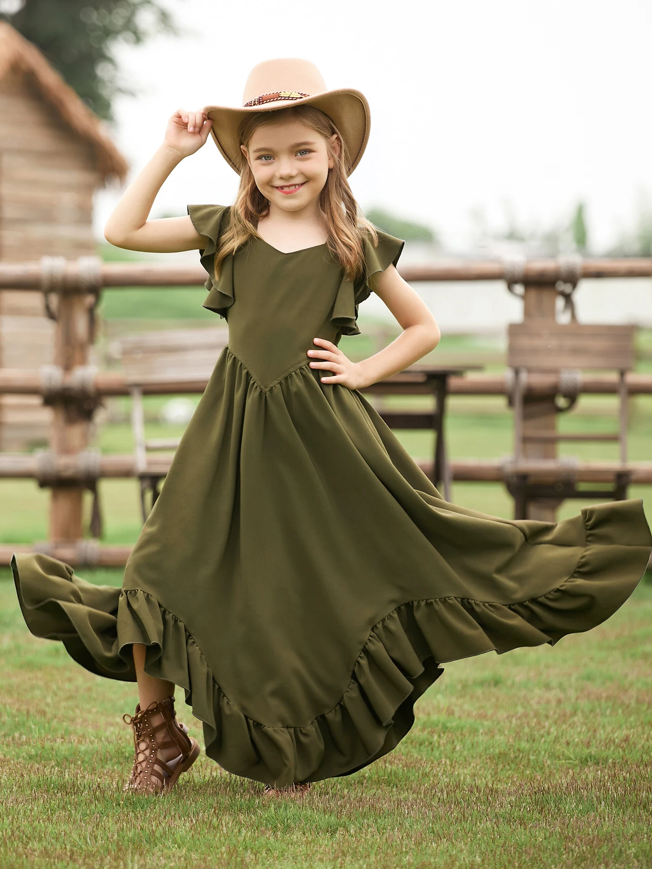 MQTIME - New Christmas Style Solid Color Ruffle Edge Irregular Skirt Lace Fly Sleeves Fashionable V-Neck Dress for Teenage Girls