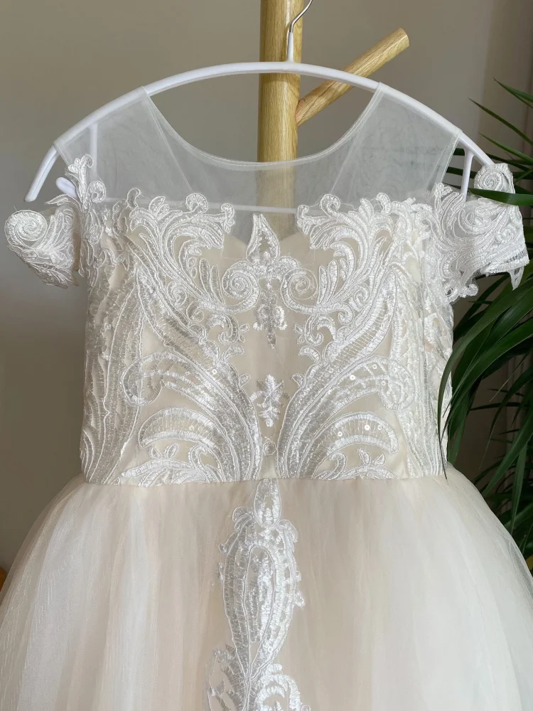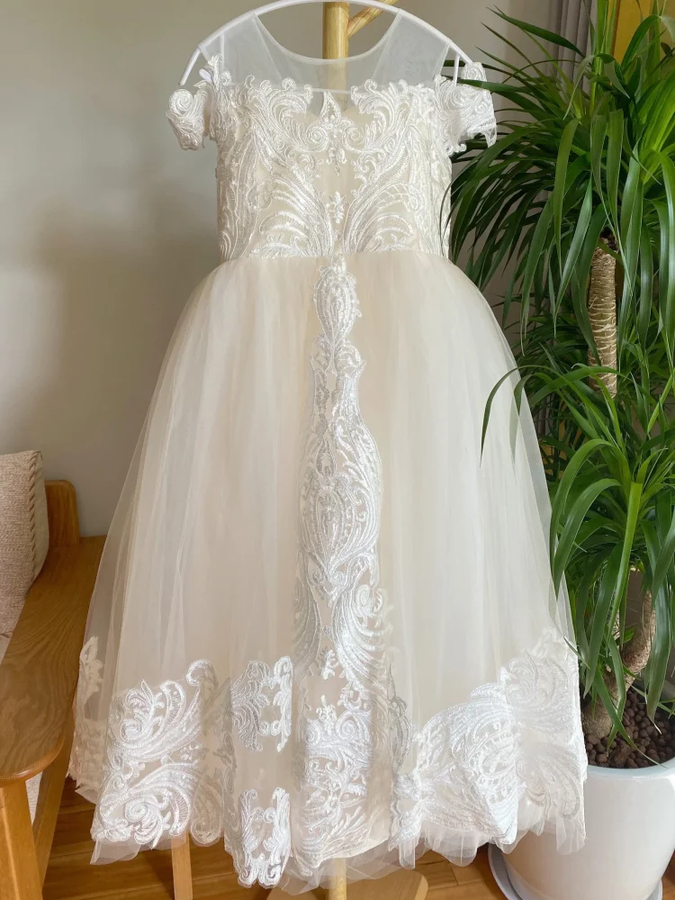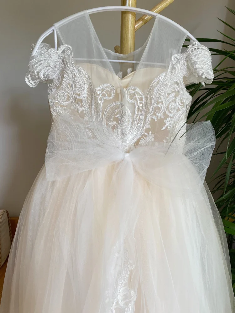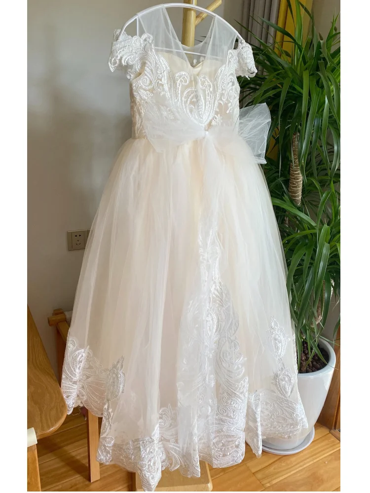 MQTIME - Ivory Flower Girl Dresses Tulle White Pattern Applique With Bow Sleeveless For Wedding Birthday Party First Communion Gowns