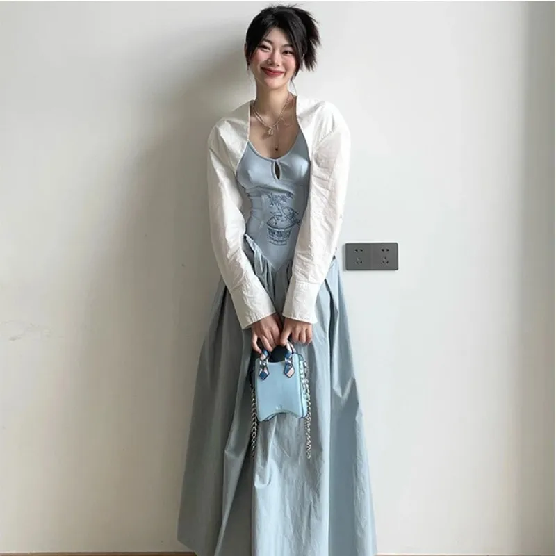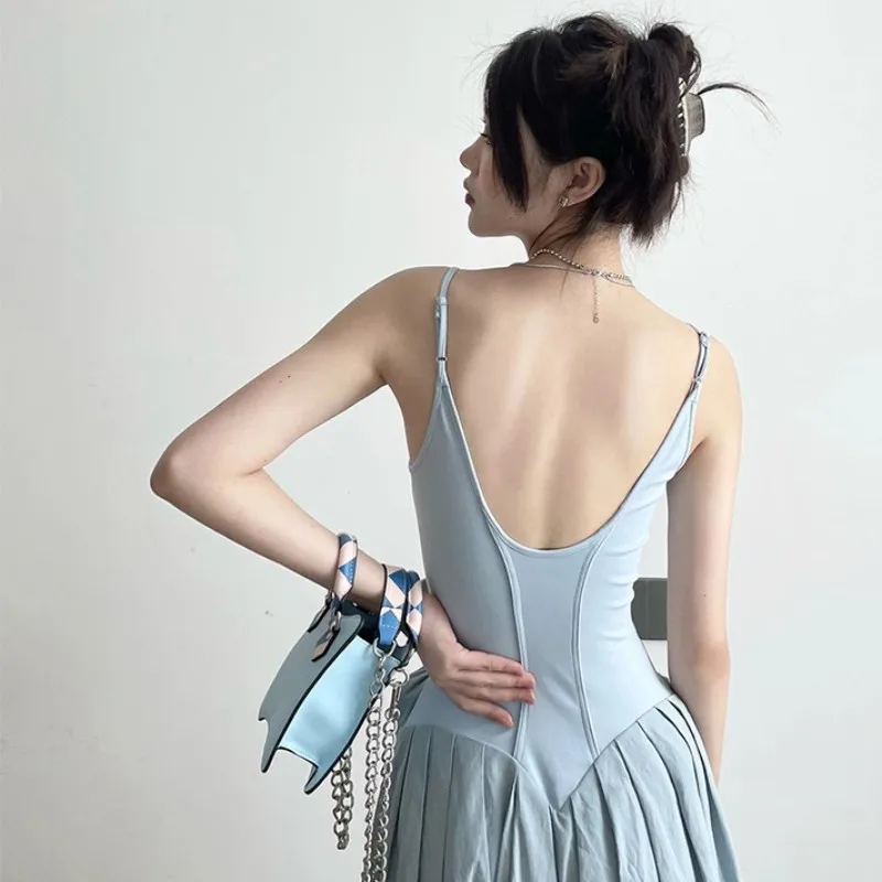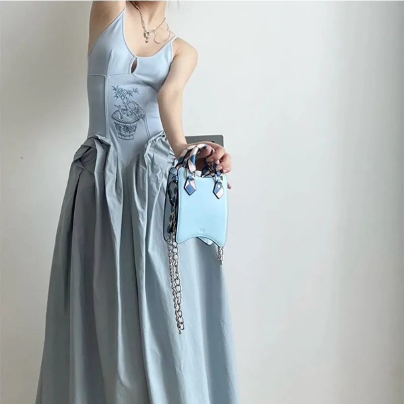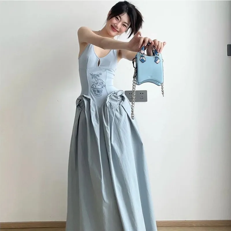MQMITE - Knitted And Spliced Suspender Dress, Women'S Summer New Chinese Style Hollowed Out Embroidery And Splicing, Waist Closing And Ve
