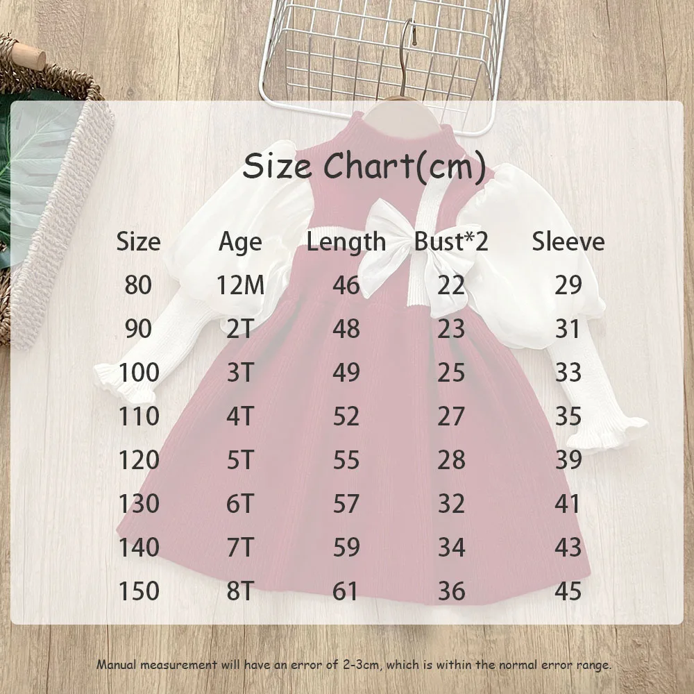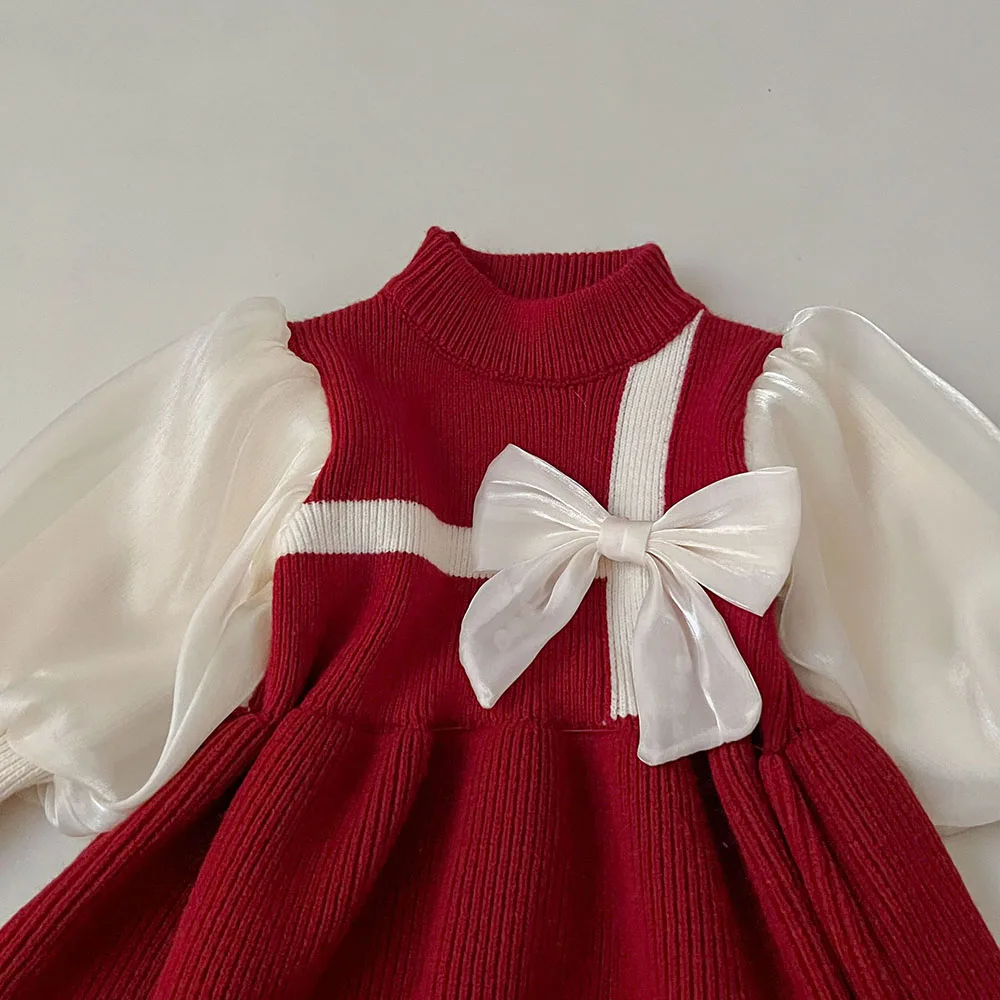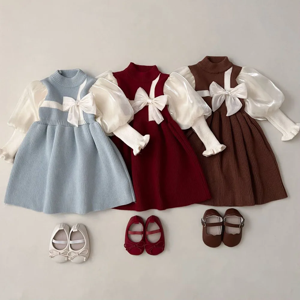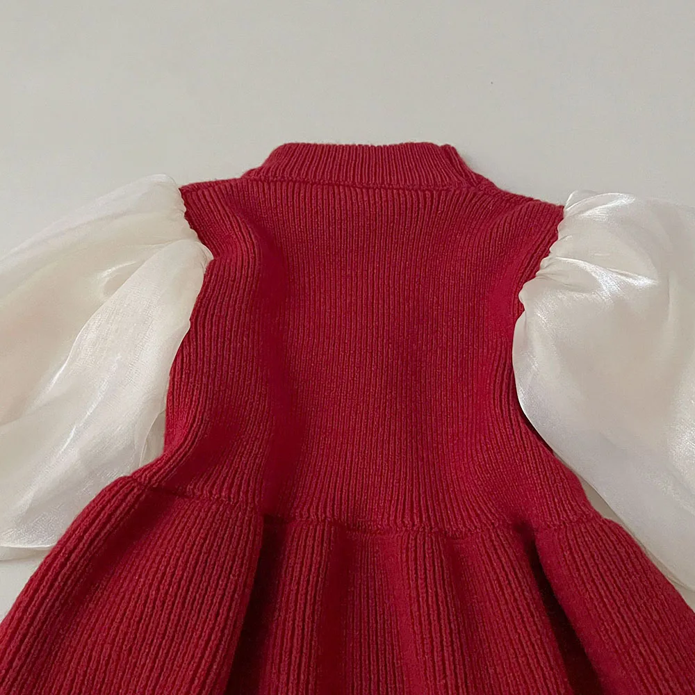 MQTIME - 0-7Y Girls' Knitted Sweater Dress Cute Lantern Sleeve Patchwork Children's Dress Spring Kid's Outfit Girls Clothes