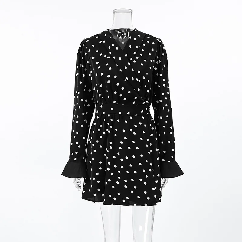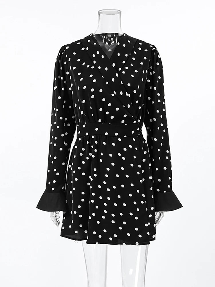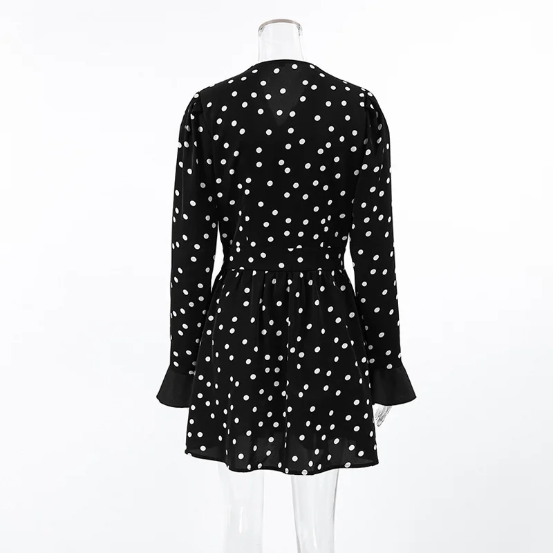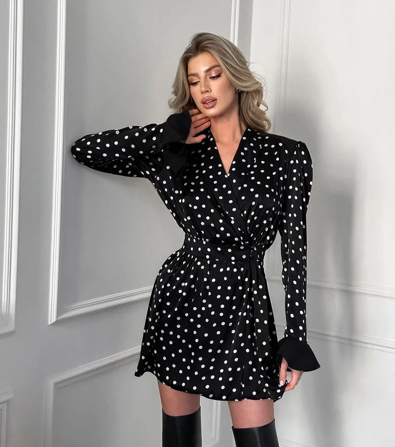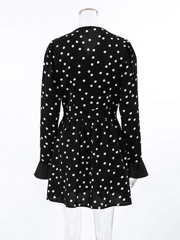 MQTIME - 2024 Autumn Winter Women Elegant Polka Dot Mini Dress V-neck Black Long Sleeve Flare Mini Dress For Women