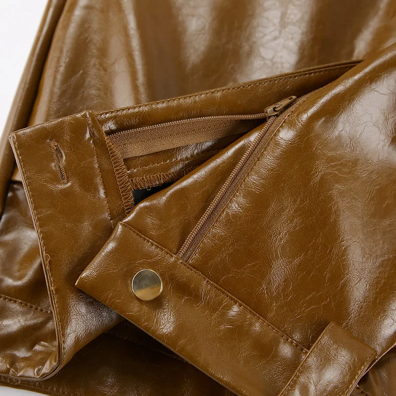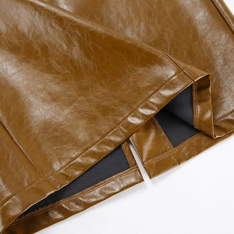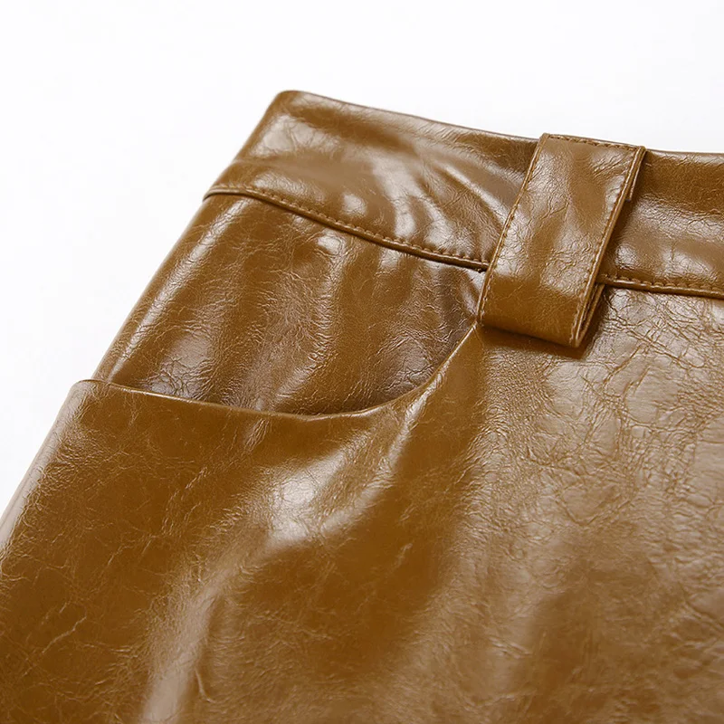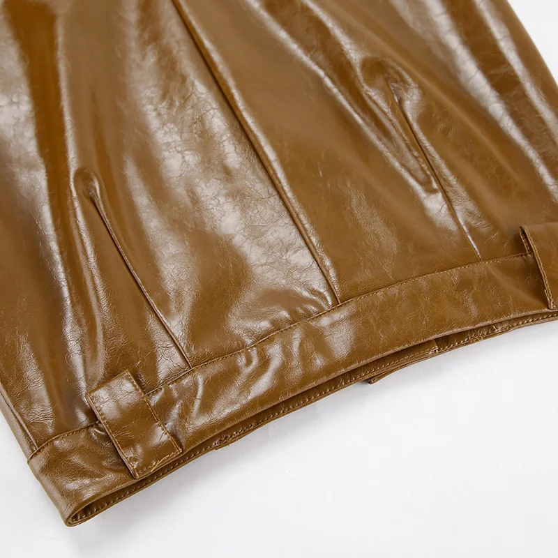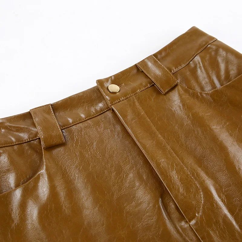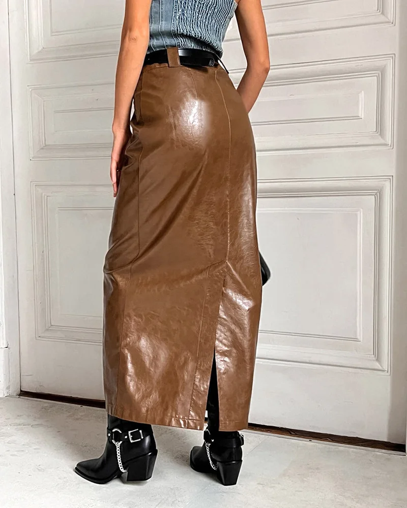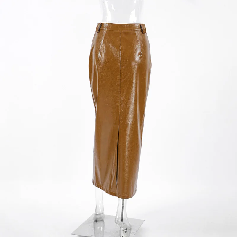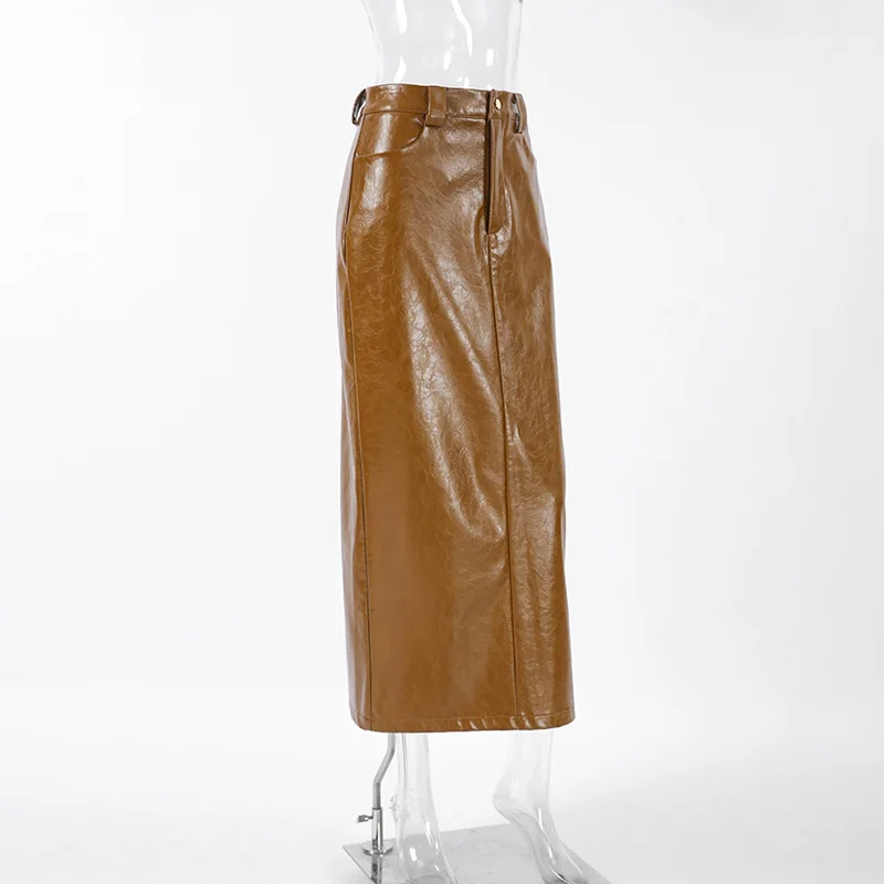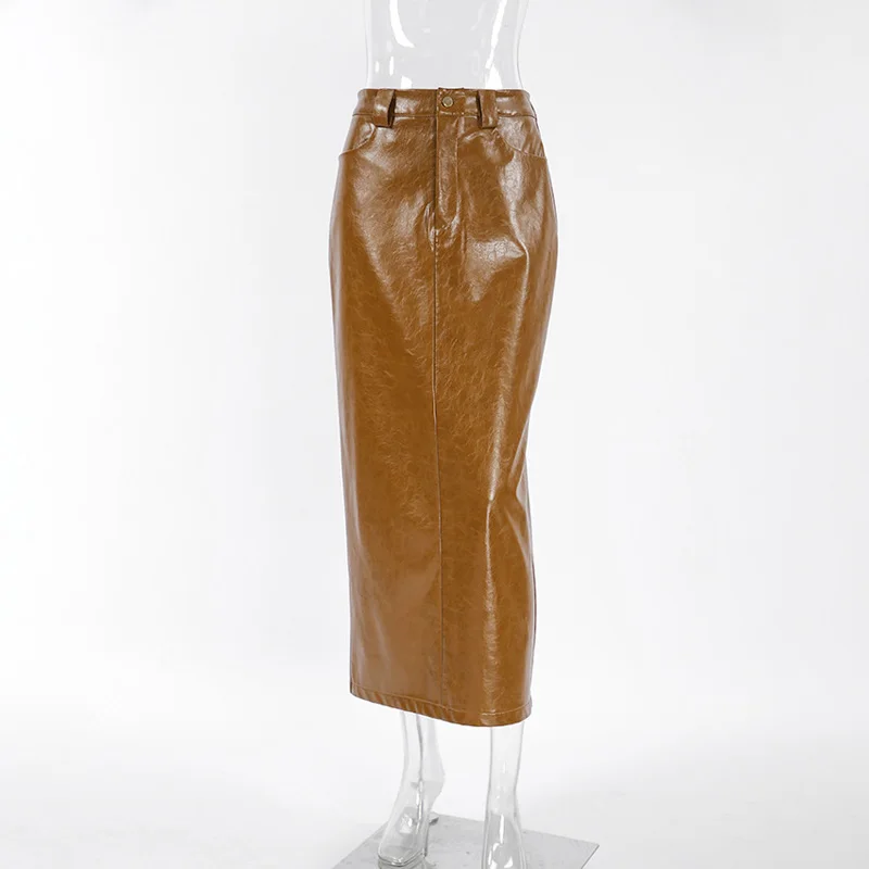 MQTIME - 2024 Autumn Winter Women Office Midi Leather PU Skirts Bodycon Solid Brown High Waist Office Pencil Skirt For Women