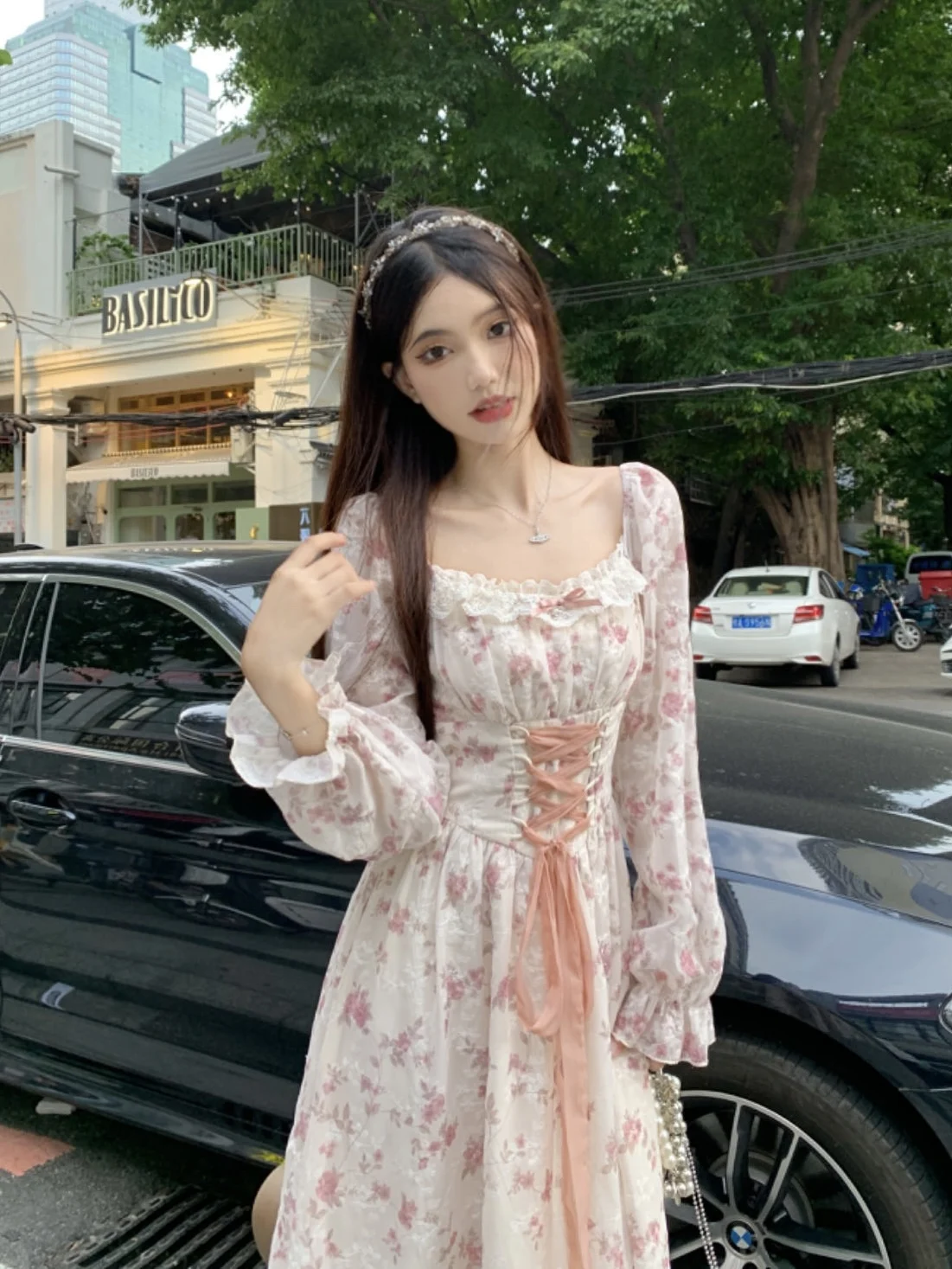 MQTIME  -  2024 Large Spring French Vintage Sweet Fragmented Flowers High Waist Slimming Chiffon Embroidered Dress Long sleeved Long Skirt