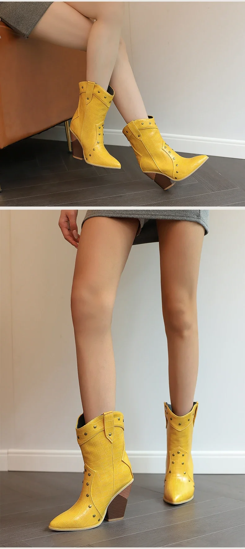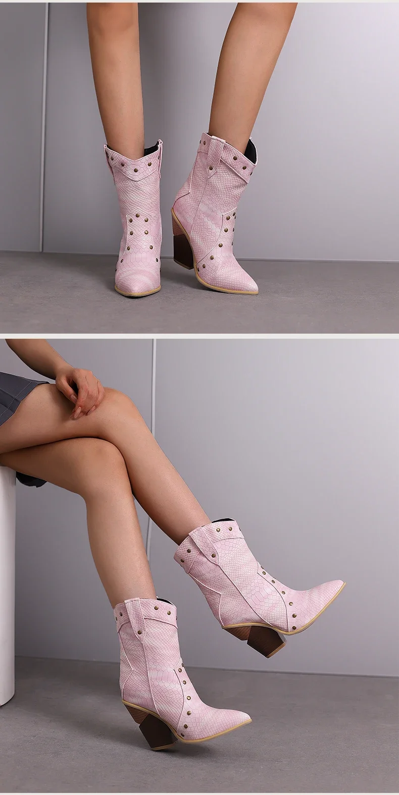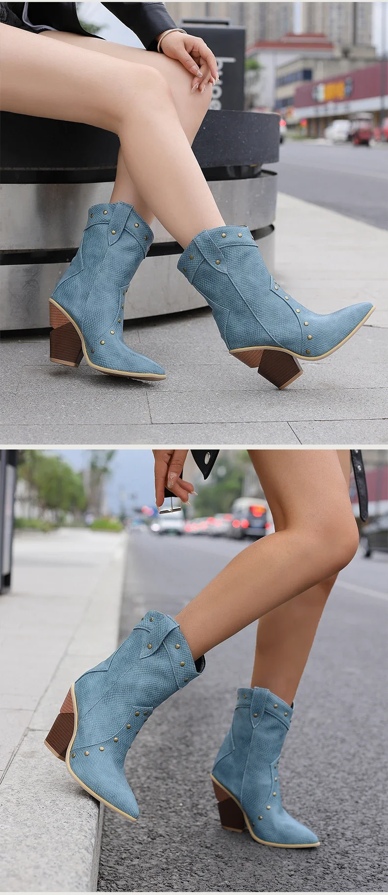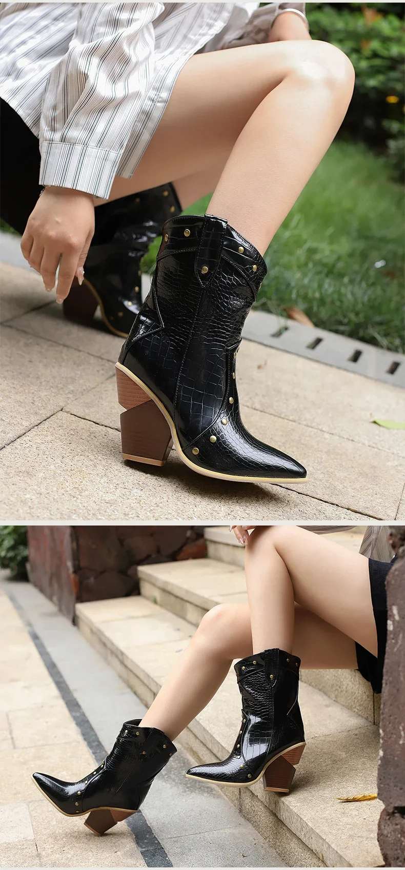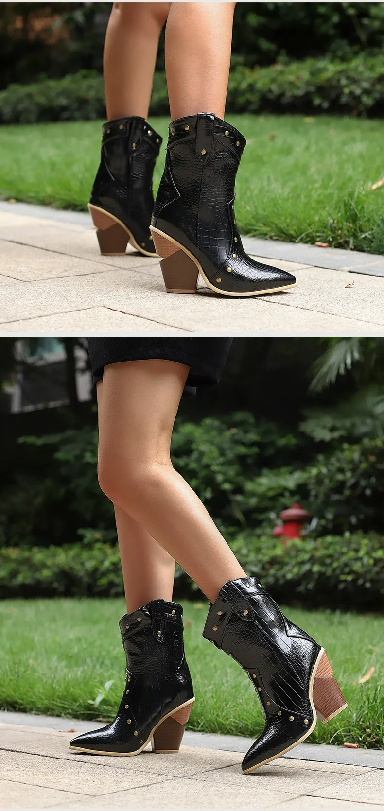 MQTIME - 2024 new autumn winter women ankle boots plus size 22-28cm pu upper pointed toe metal rivet high heel western boots