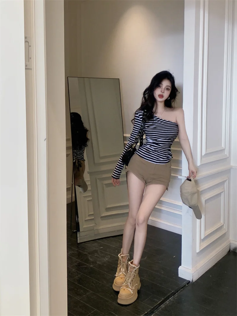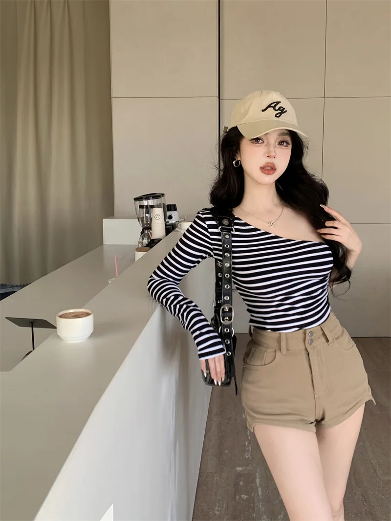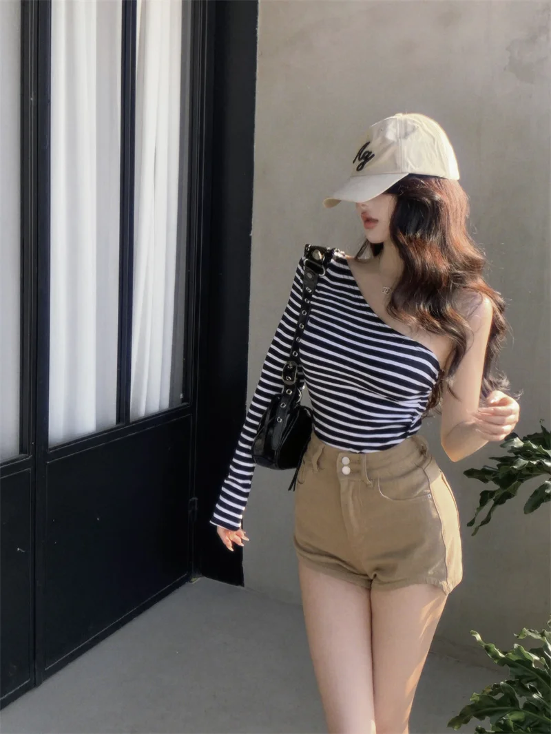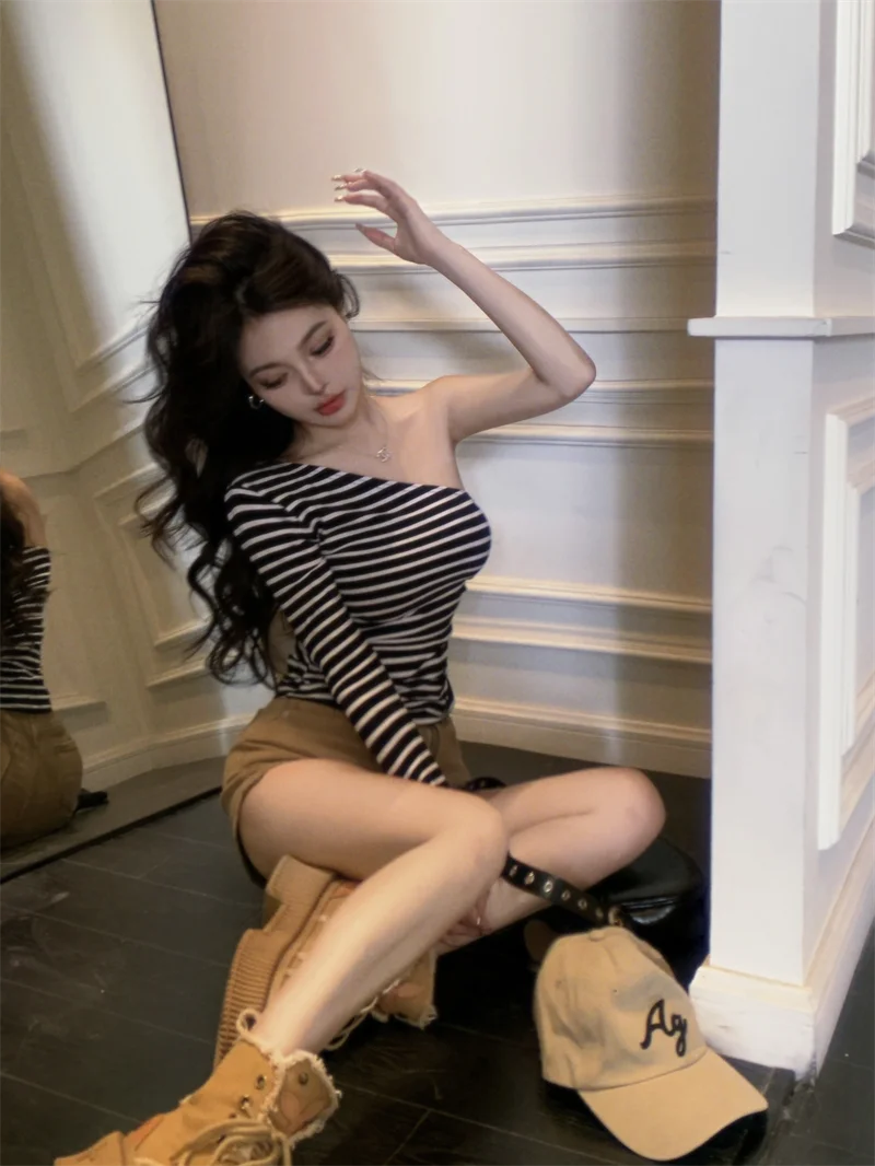 MQTIME - 2024 new black and white striped chest, large waist, pure desire for slim fit, single T-shirt, asymmetrical long sleeved top