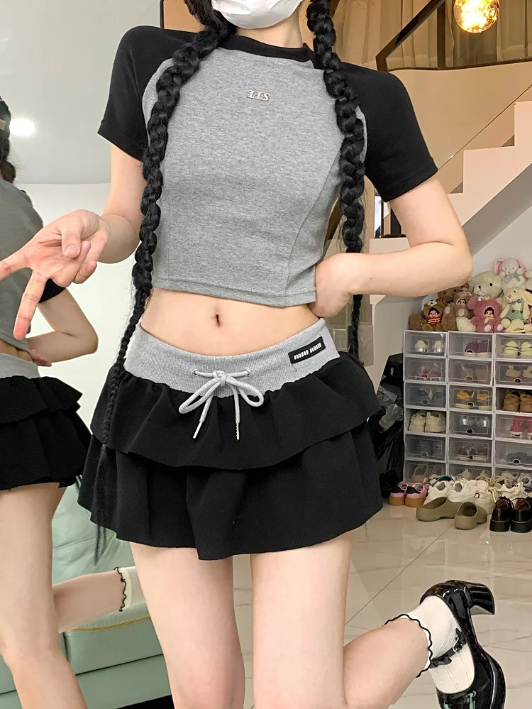 MQTIME - 2024 New drawstring elastic waist skirt for women's sports and leisure, high waist layered slimming cake mini skirt