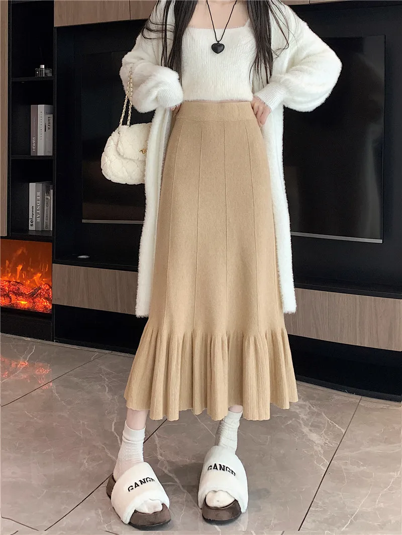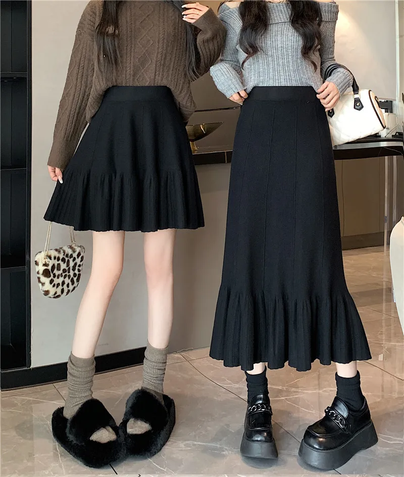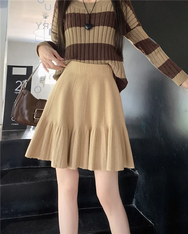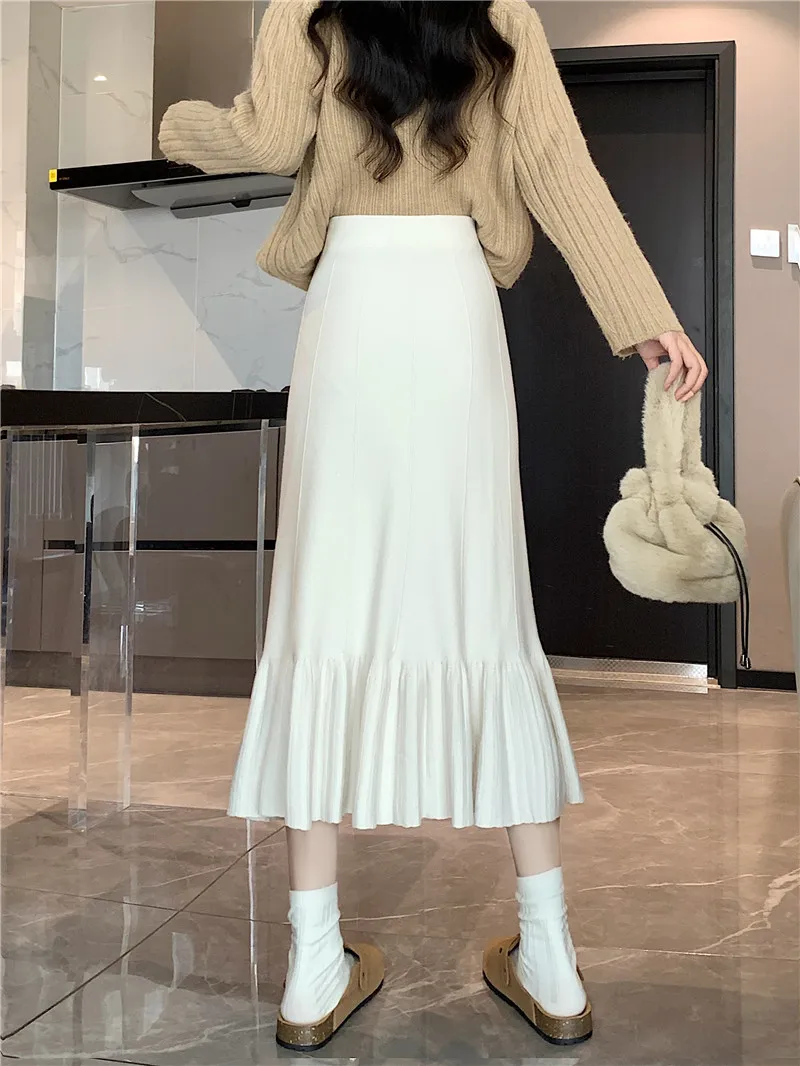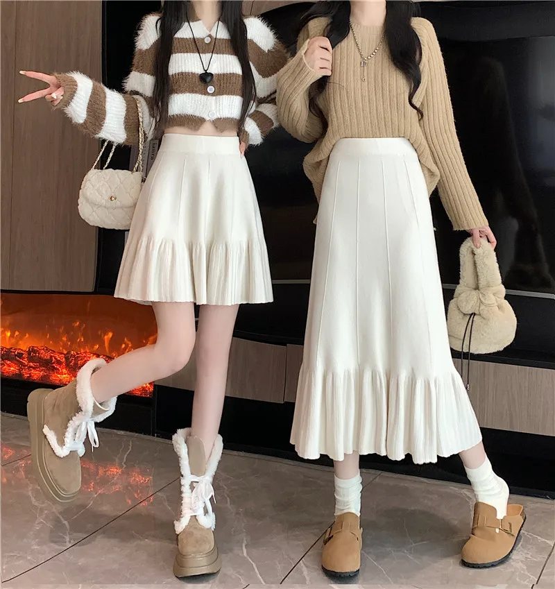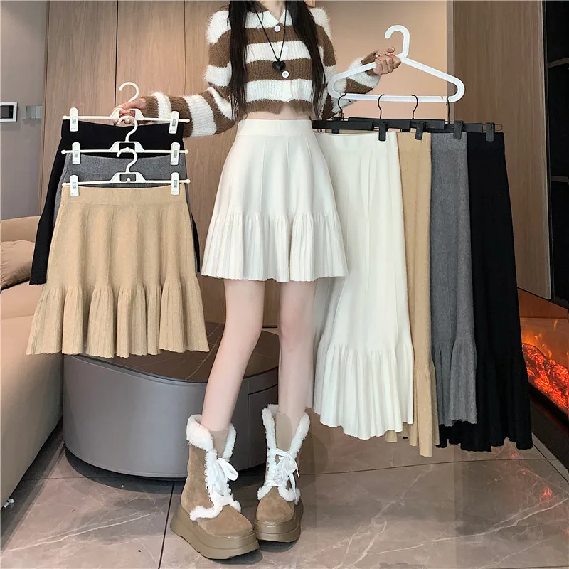 MQTIME - 2024 Spring and Autumn New Ruffle Edge Pleated Skirt Knitted Half Skirt Versatile Fashion Women's Mid length Knitted A-line Skir