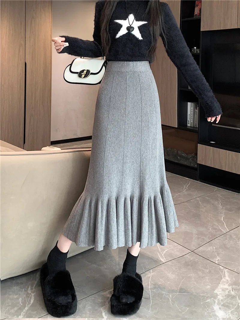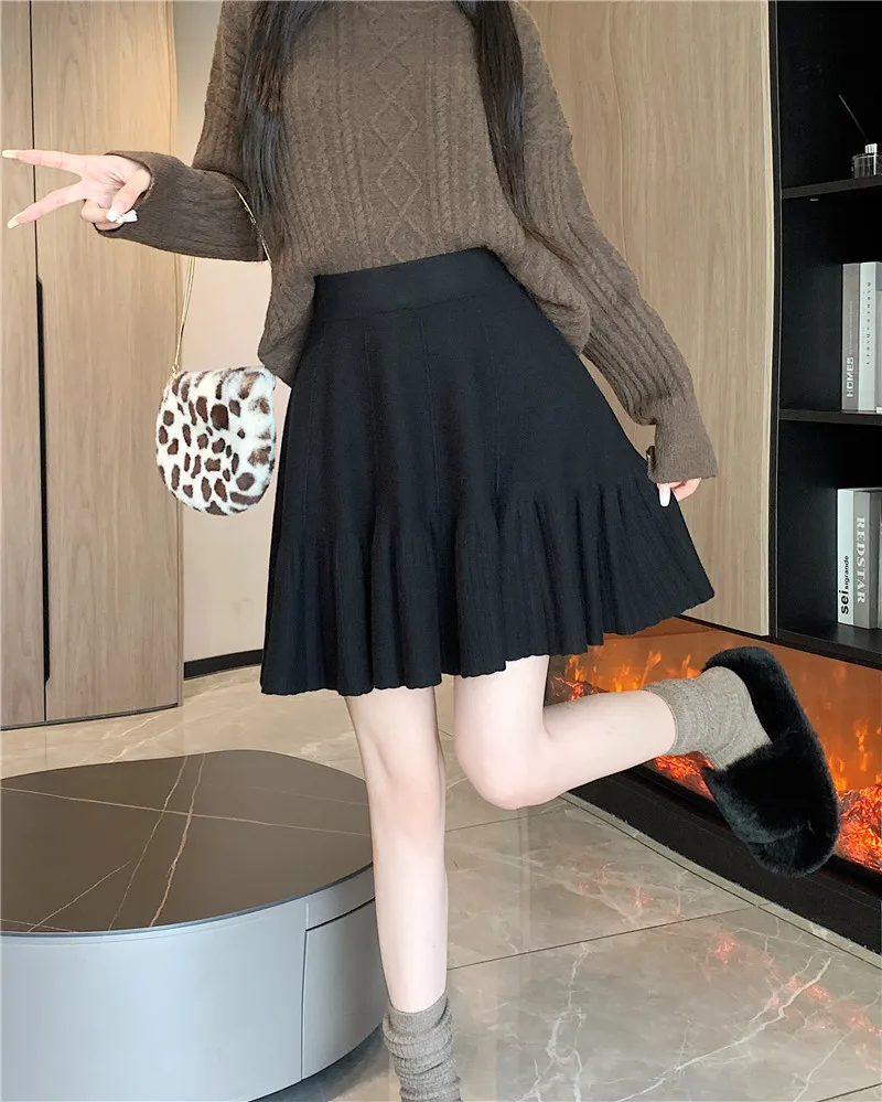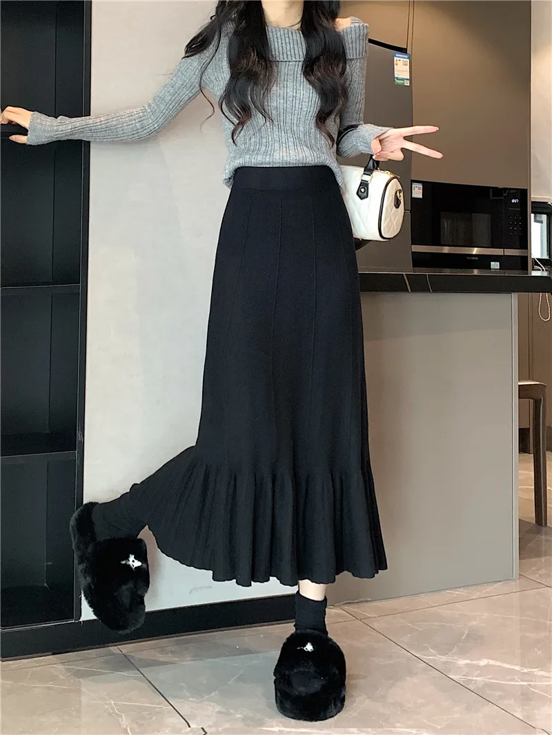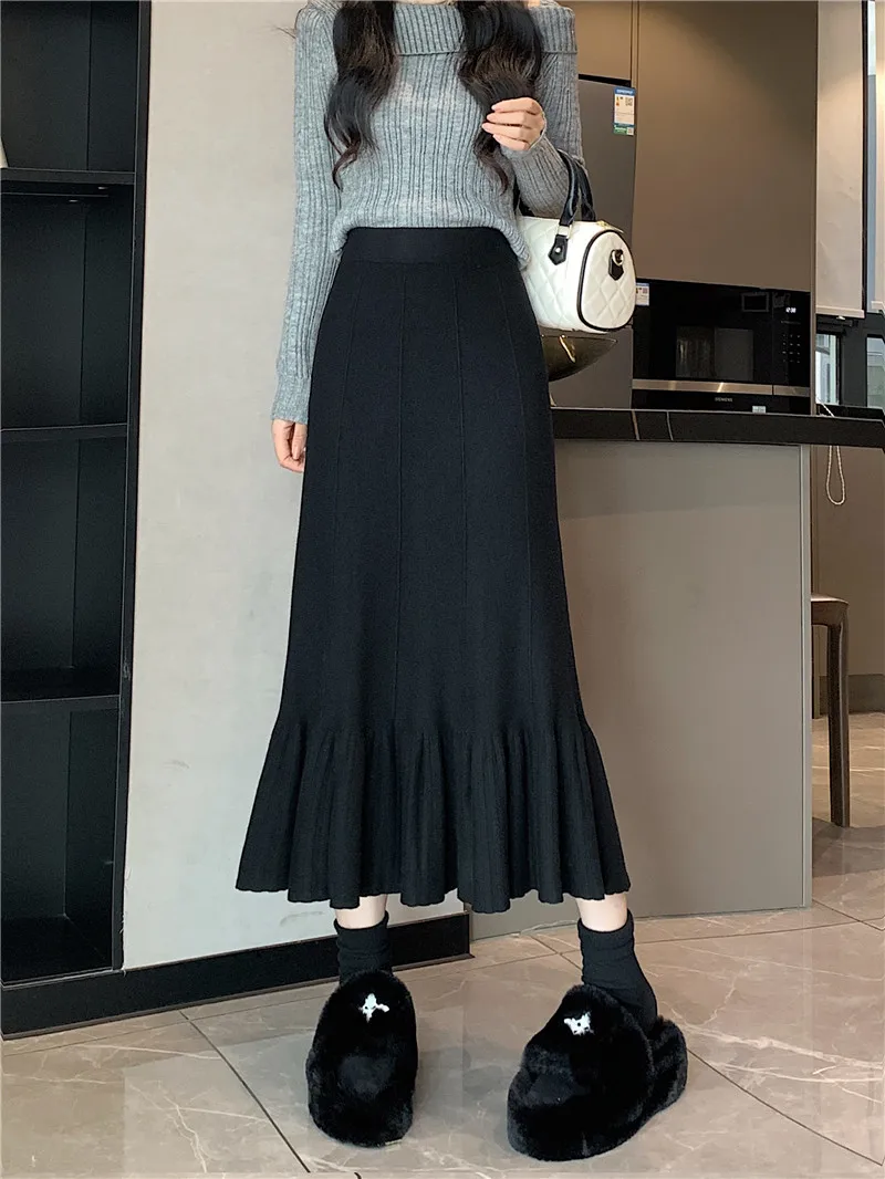 MQTIME - 2024 Spring and Autumn New Ruffle Edge Pleated Skirt Knitted Half Skirt Versatile Fashion Women's Mid length Knitted A-line Skir