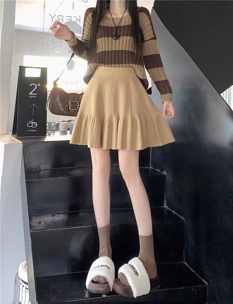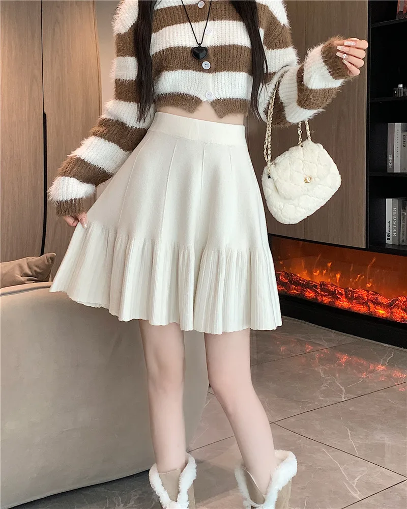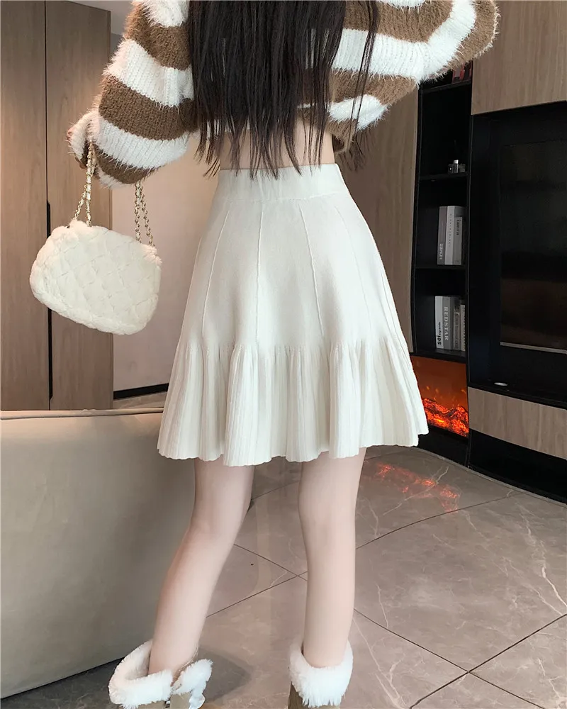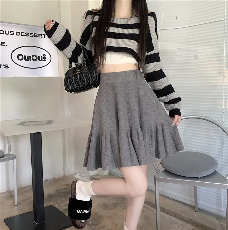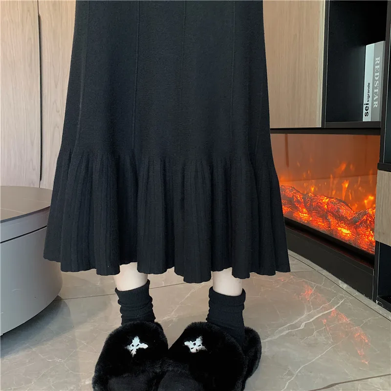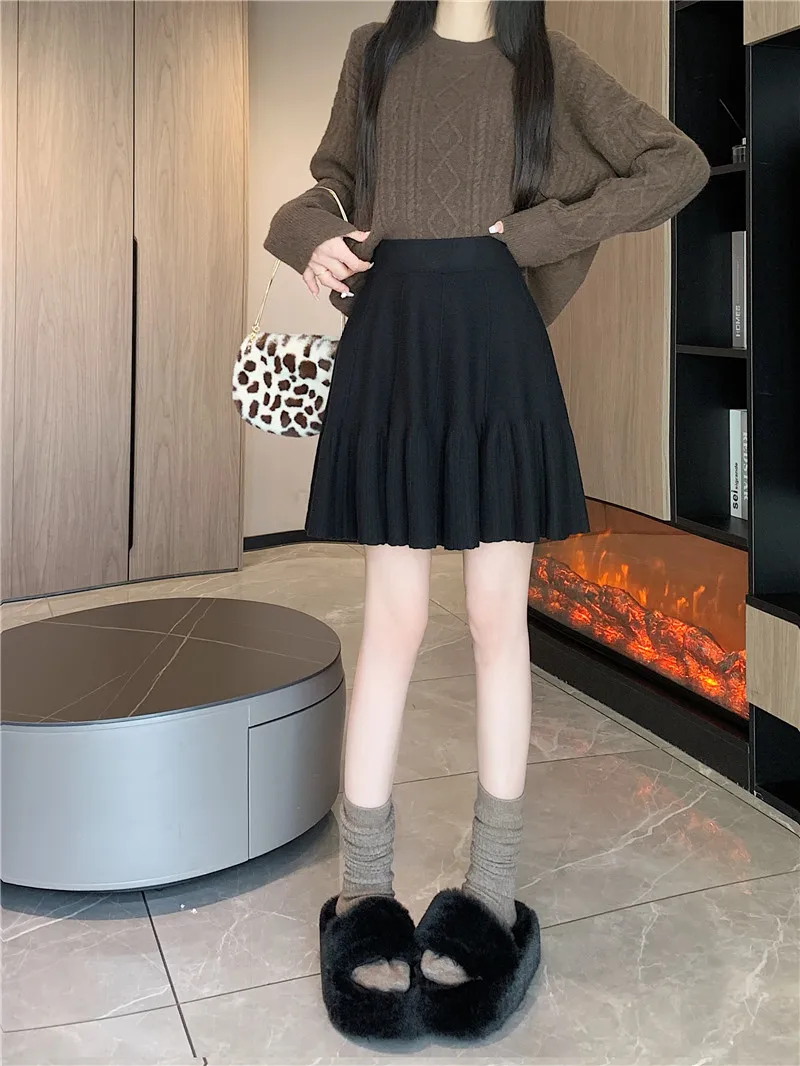 MQTIME - 2024 Spring and Autumn New Ruffle Edge Pleated Skirt Knitted Half Skirt Versatile Fashion Women's Mid length Knitted A-line Skir