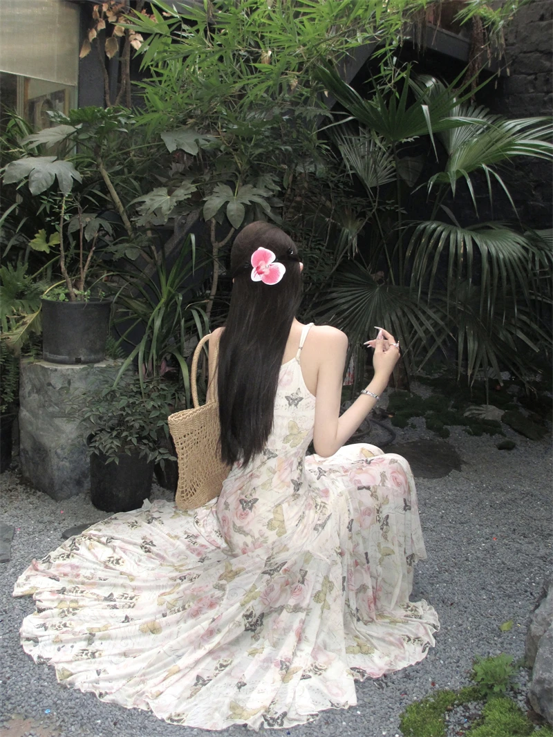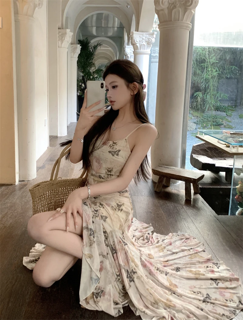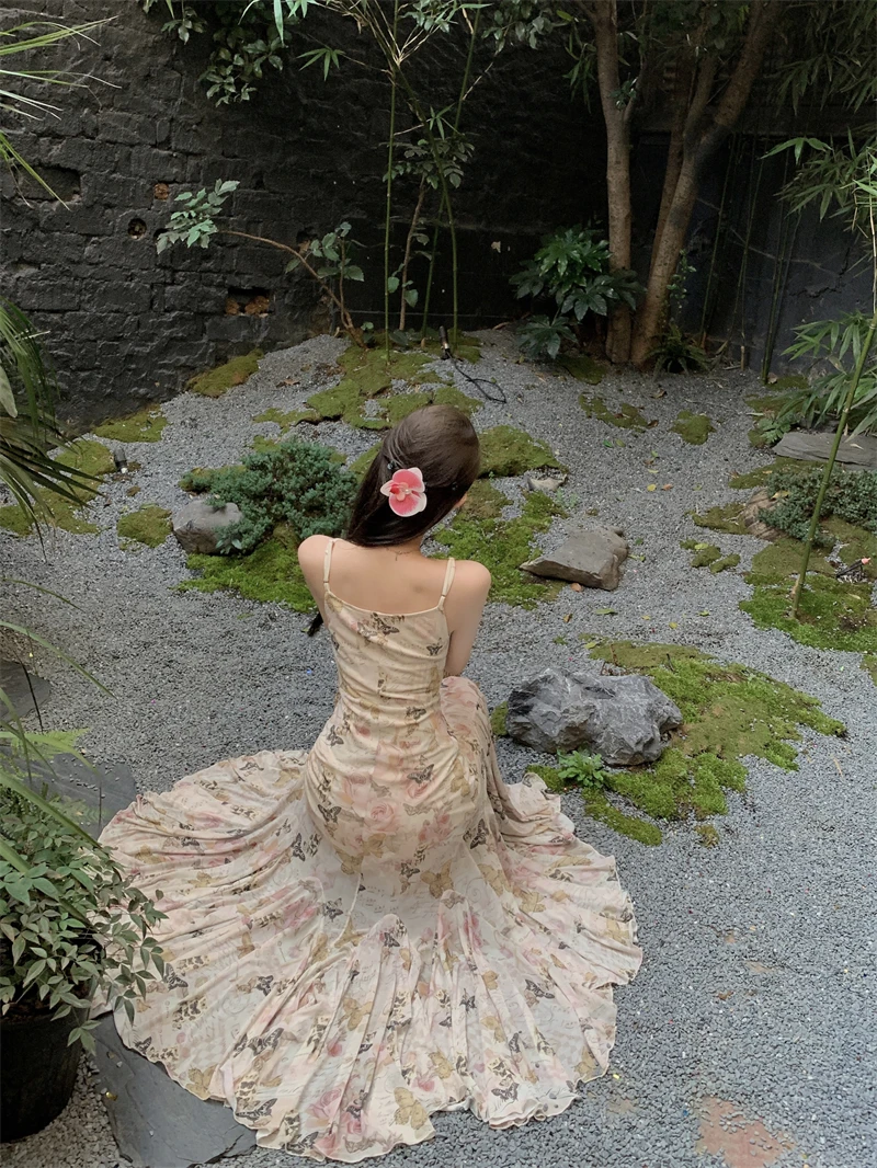 MQTIME - 2024 Spring/Summer French Gentle Style Long sleeved Butterfly Print Dress Slim and High Sexy Hanging Strap Fishtail Dress