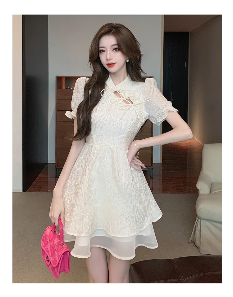 MQTIME - 2024 Summer New Design Feel Pure Desire for Open Back Improvement Qipao Style Fluffy Dress Chinese Short sleeved Short Skirt