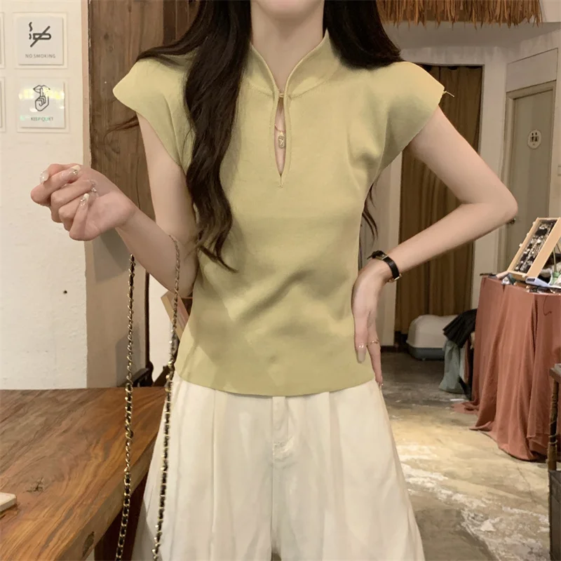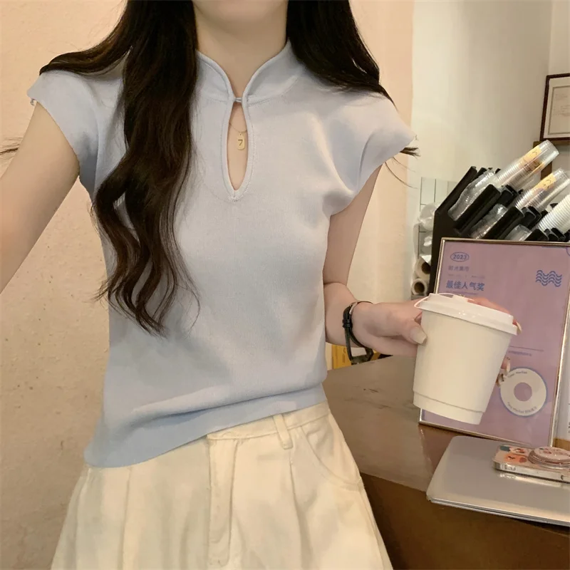 MQTIME - 2024 Summer New Ice Silk Knitwear Women's Chinese Style Slim Fit Retro Short sleeved T-shirt Top Women