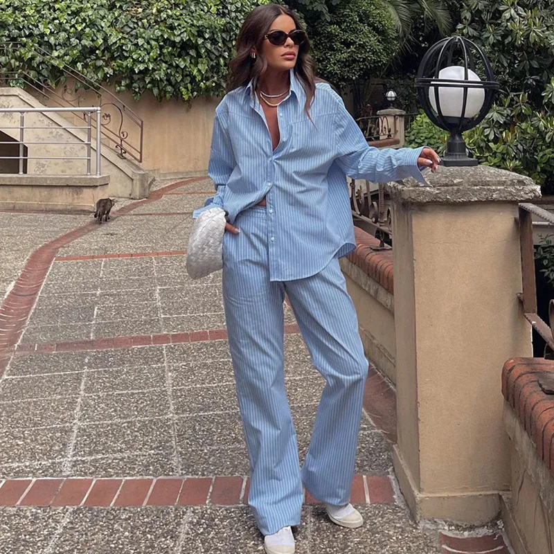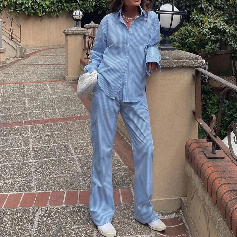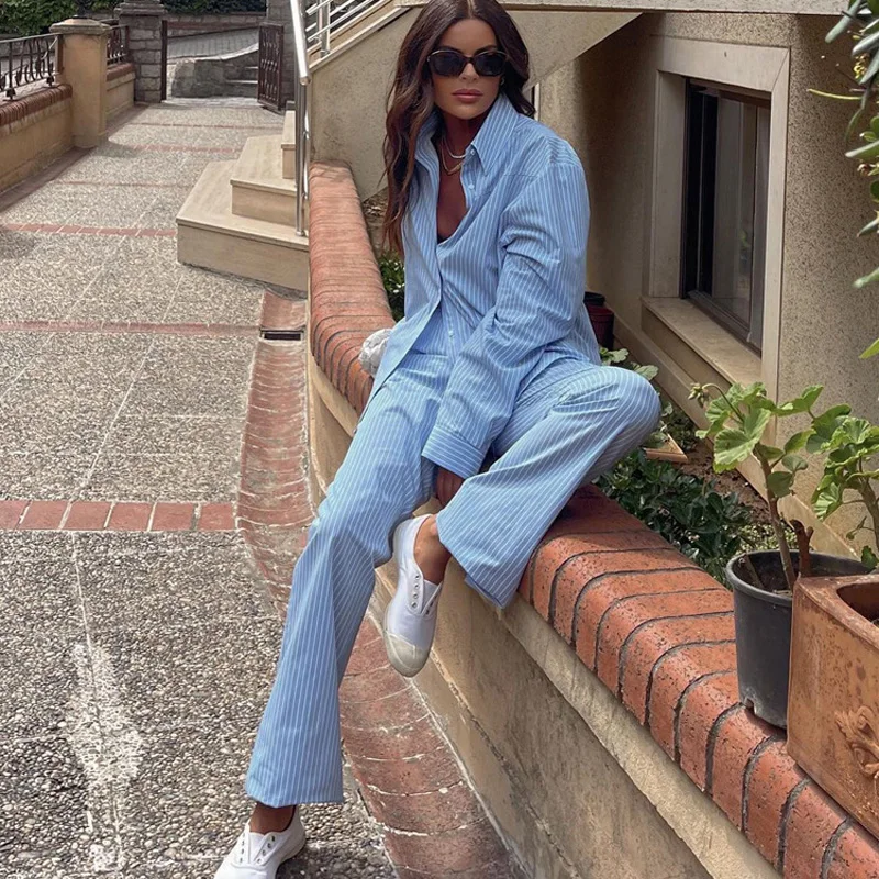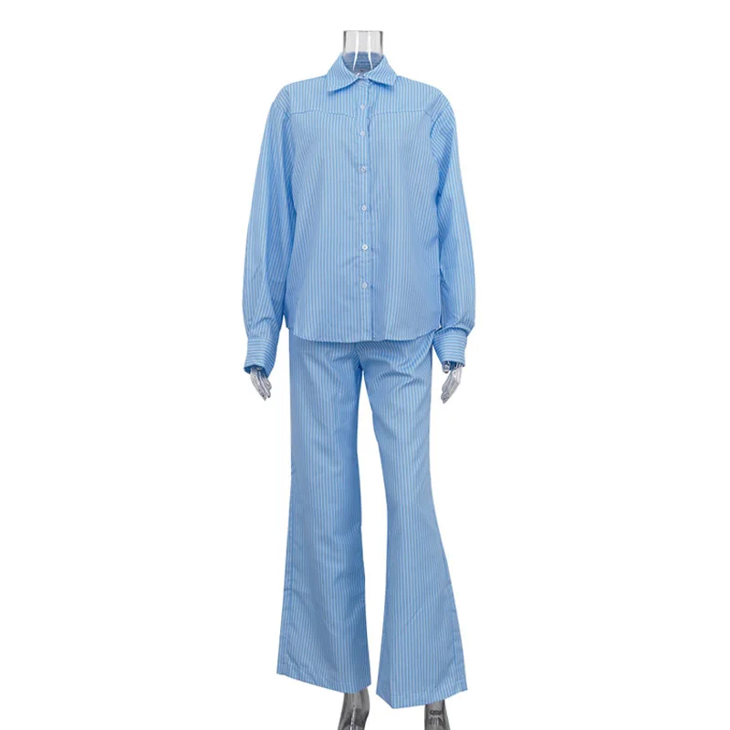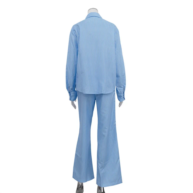 MQTIME - 2024 Women Autumn Winter Striped Pant Set 2 Two Piece Blue Outfits Matching Shirt Suit Set For Women