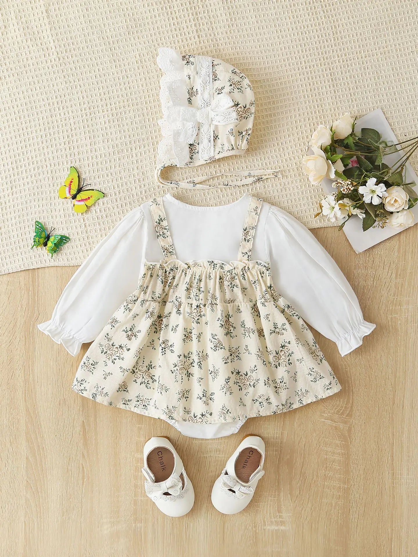 MQTIME - 2025 Spring New Baby Girls Clothes Long Sleeve Toddler Girls Floral One Piece And Hat 2 Pcs Baby Bodysuits
