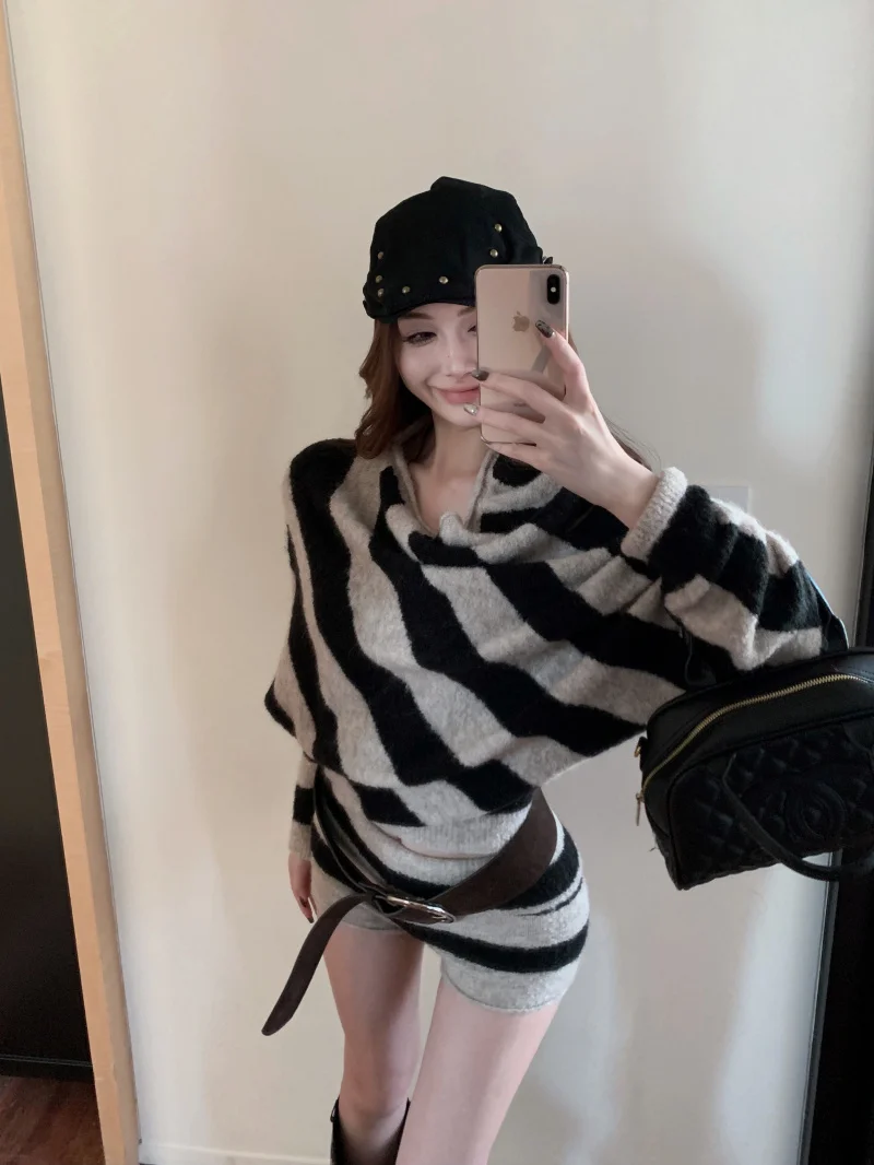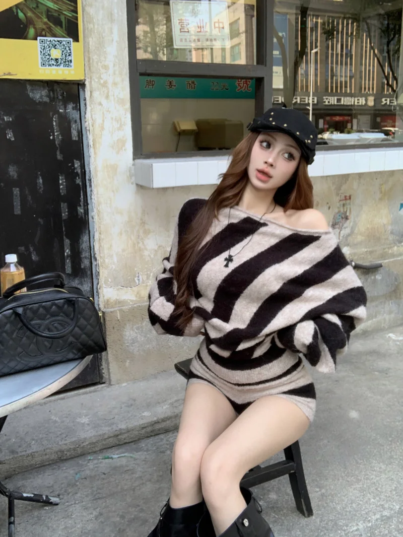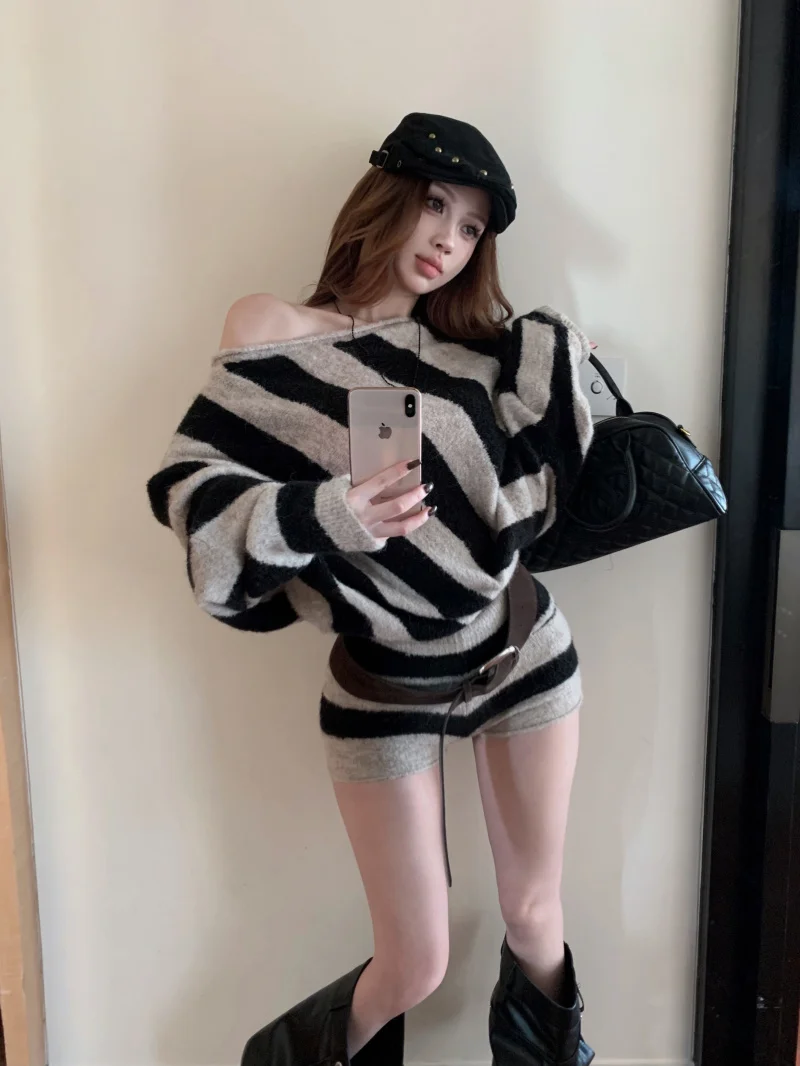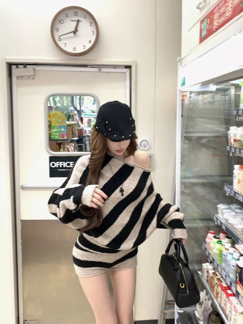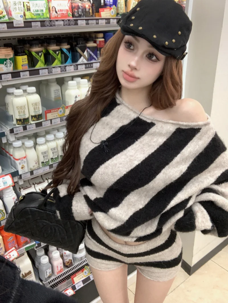 MQTIME - 2025 Spring New Streetwear Strapless Contrast Color Striped Loose Sweater Women + High Waist Casual Knit Shorts Two-piece Suit