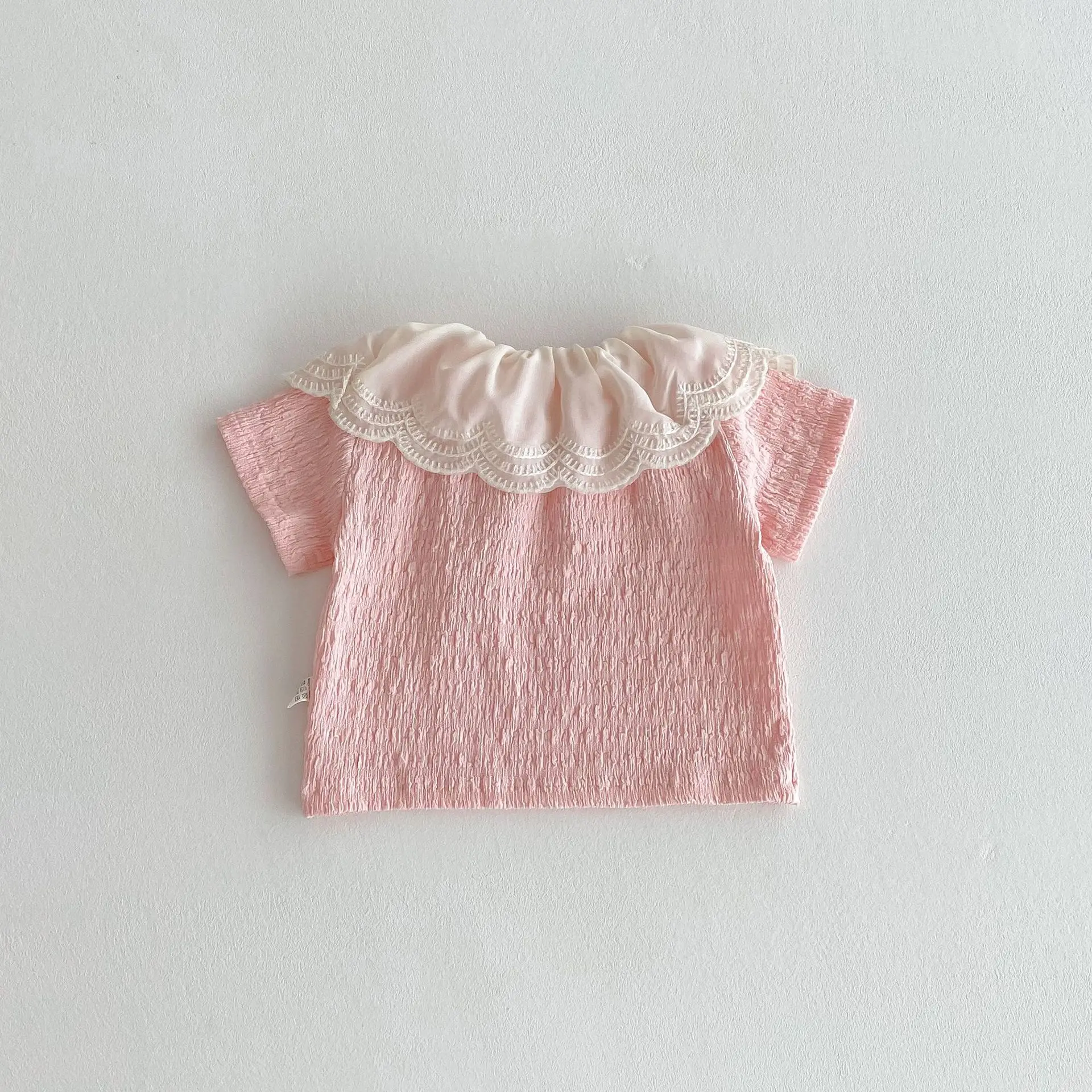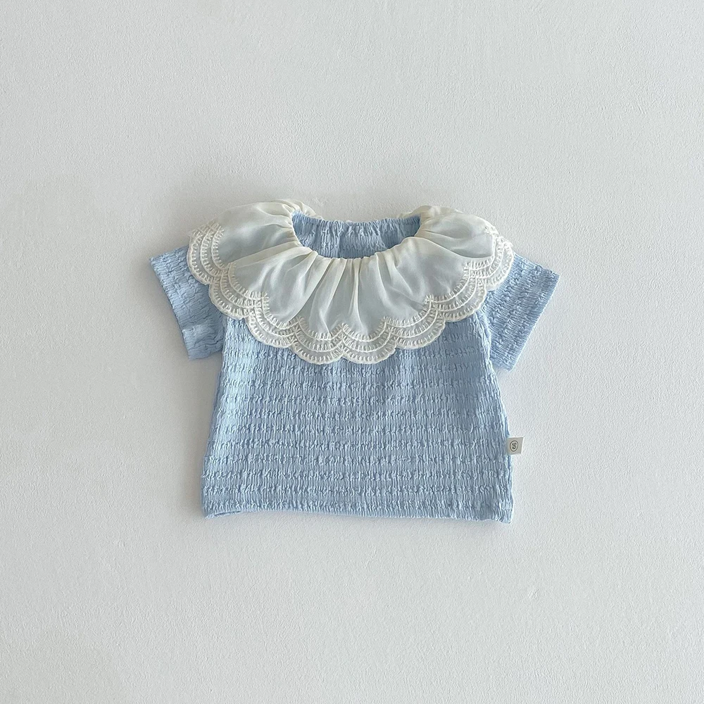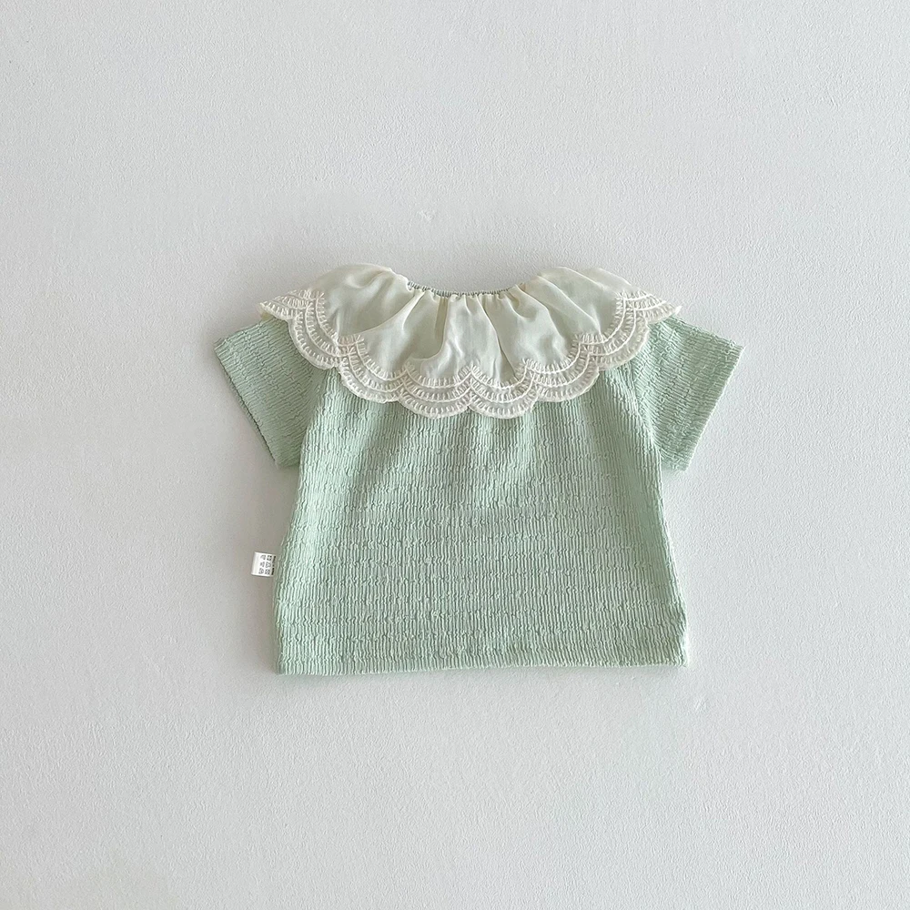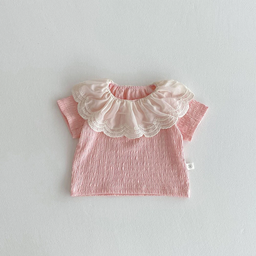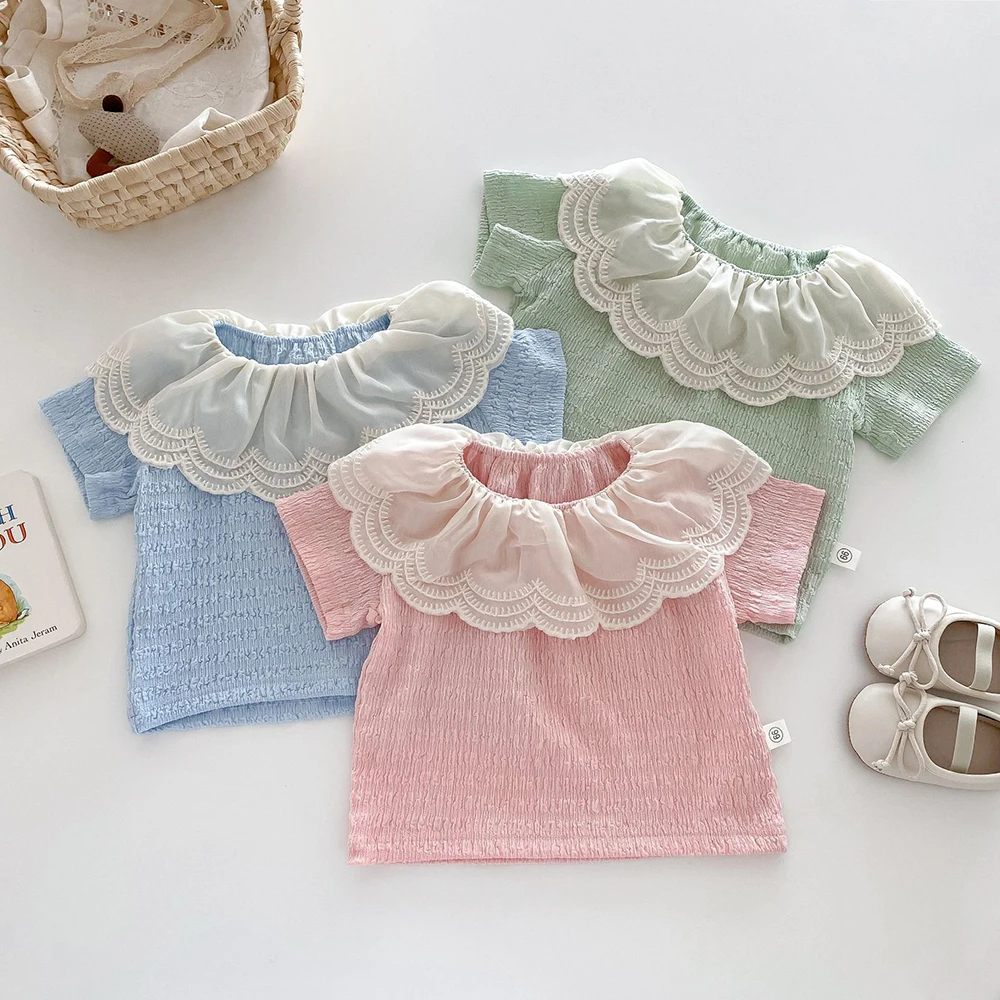 MQTIME - 2025 Summer Baby Girls Clothes Big Lace Collar Girls Tee Solid Candy Color Base Ruffle Shirt Girls T Shirt