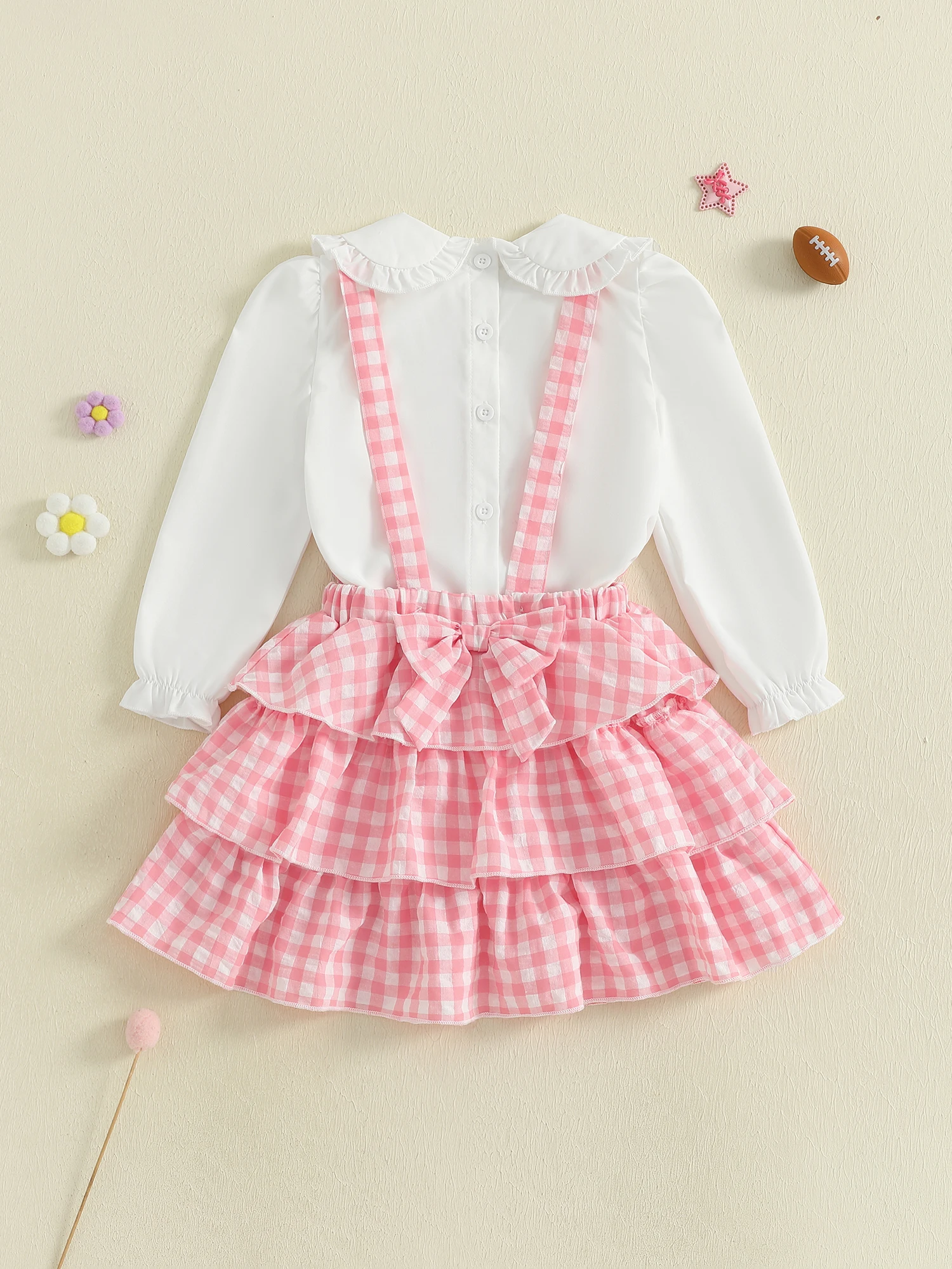 MQTIME - Adorable Baby Girl Autumn Ensemble with Peter Pan Collar Embroidered Rugby Design and Plaid Ruffle Overall Dress - 2 Piece Set