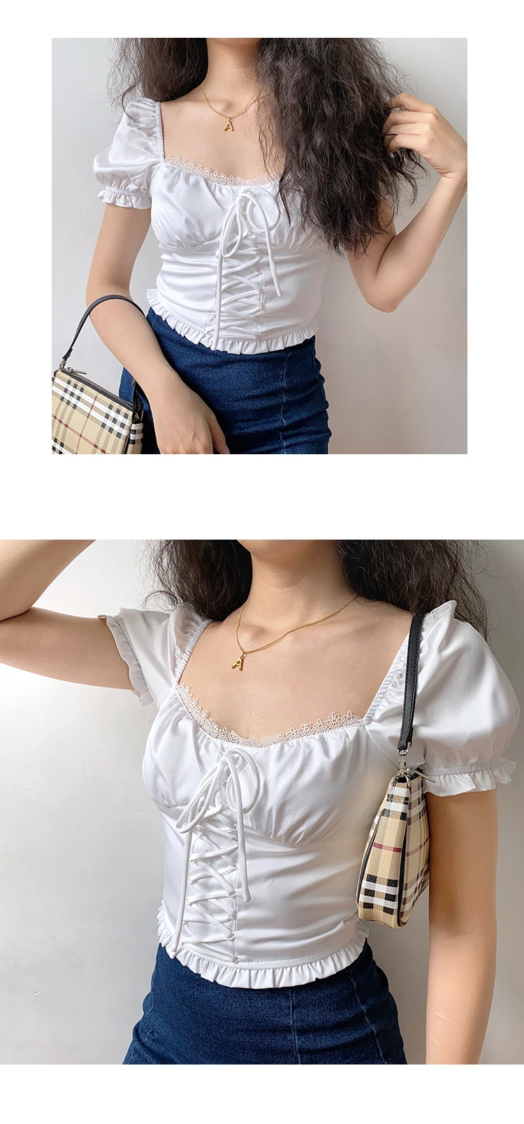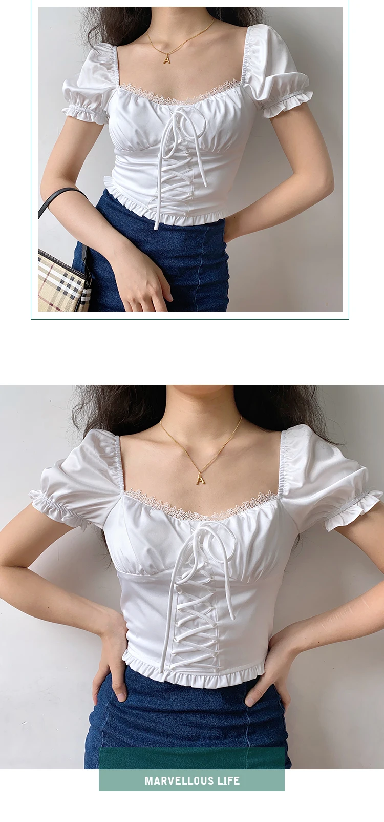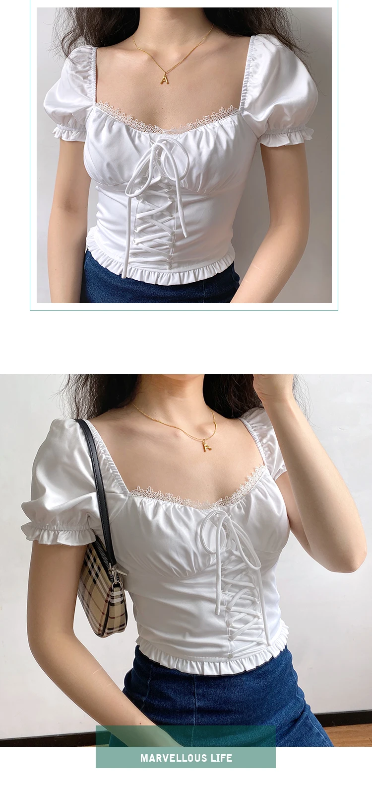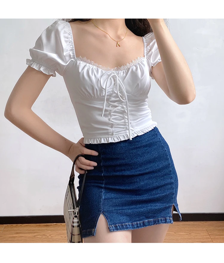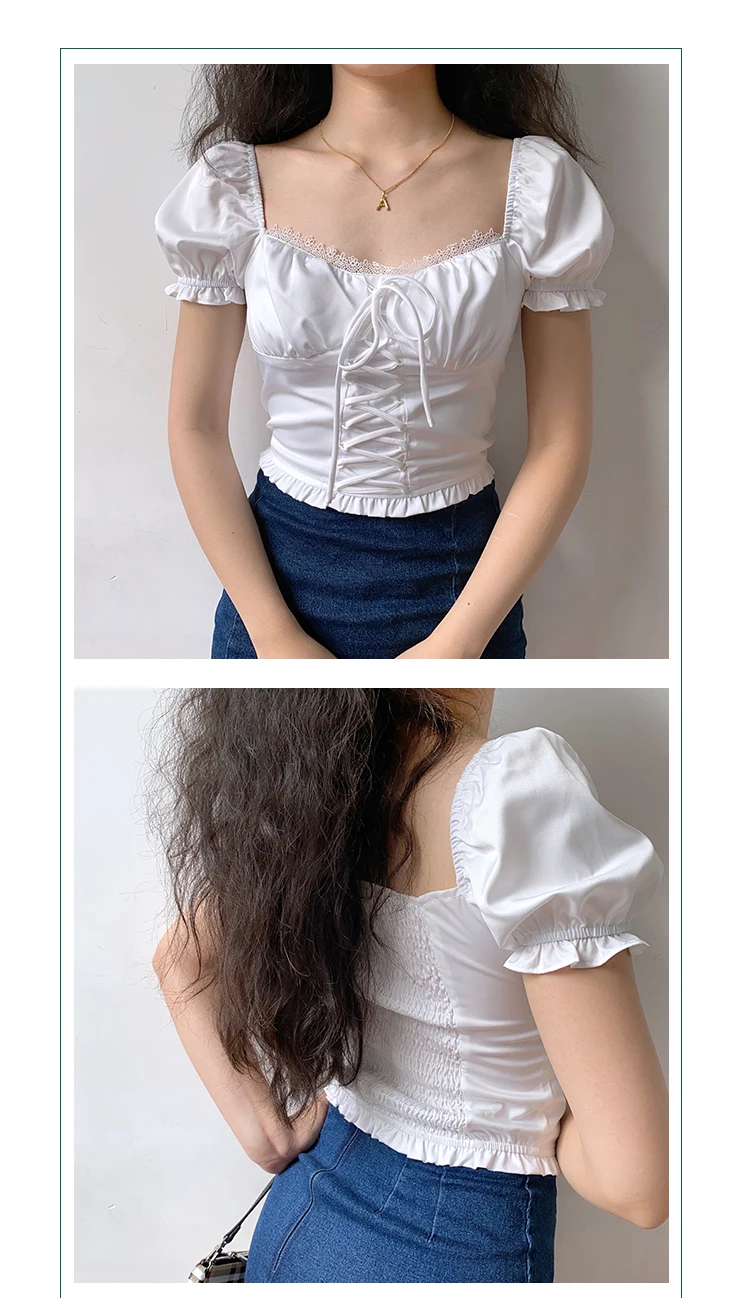 MQTIME - Alice Style Lace Bandage Slim Fold Bubble Sleeve Short Sleeve Shirt Top