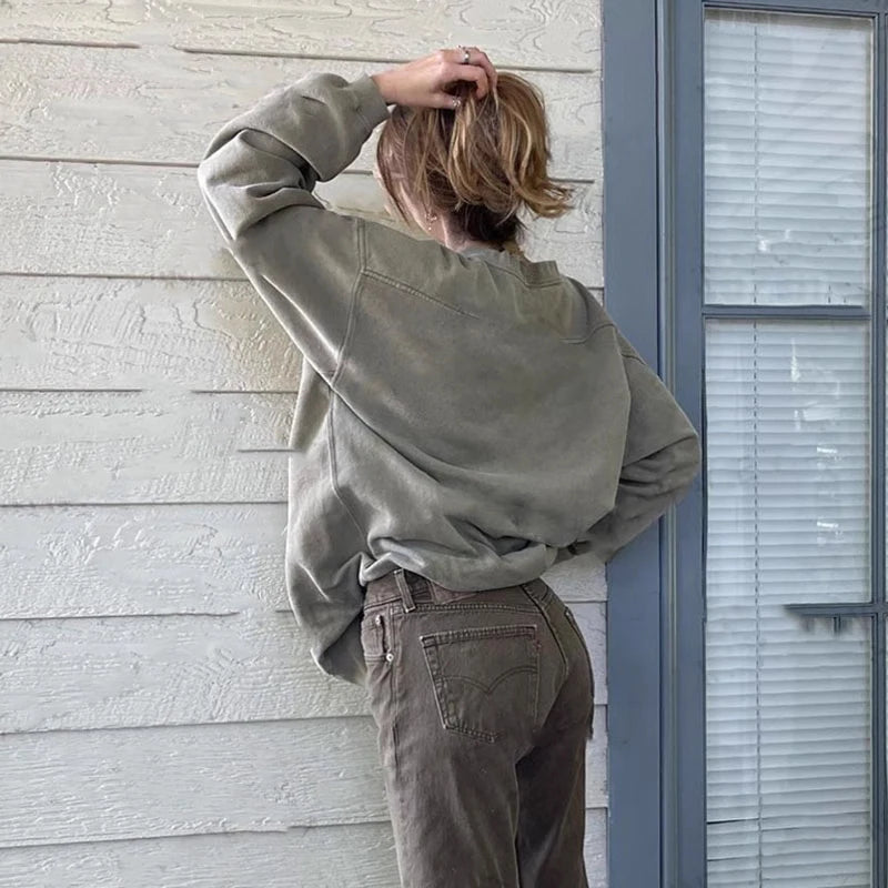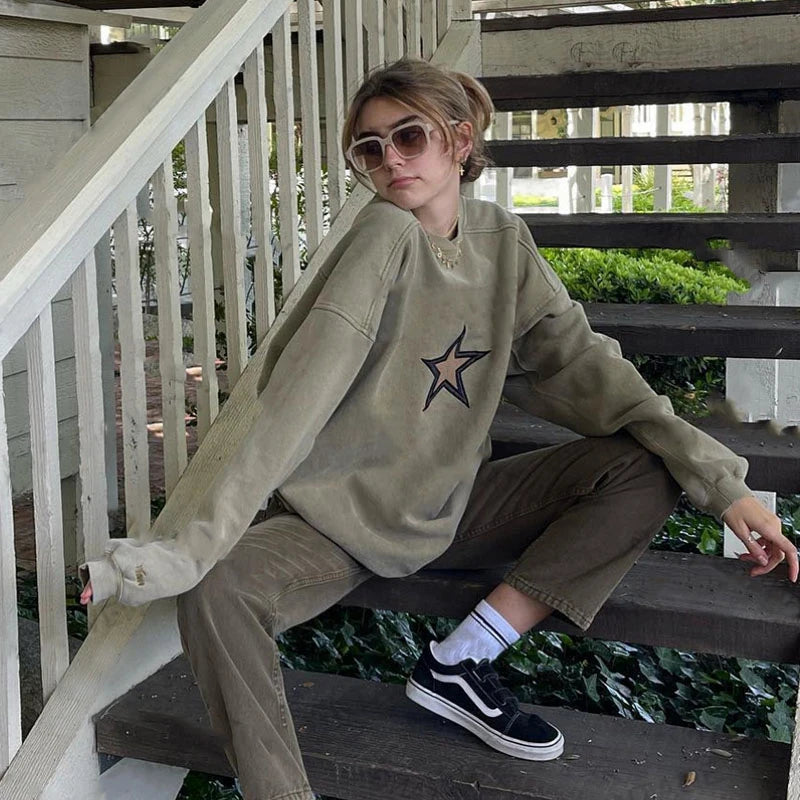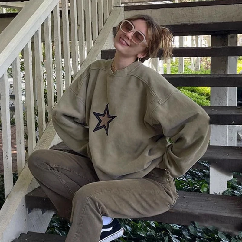 MQTIME - American retro style gray green star loose individuality versatile street round neck sweatshirt new autumn and winter
