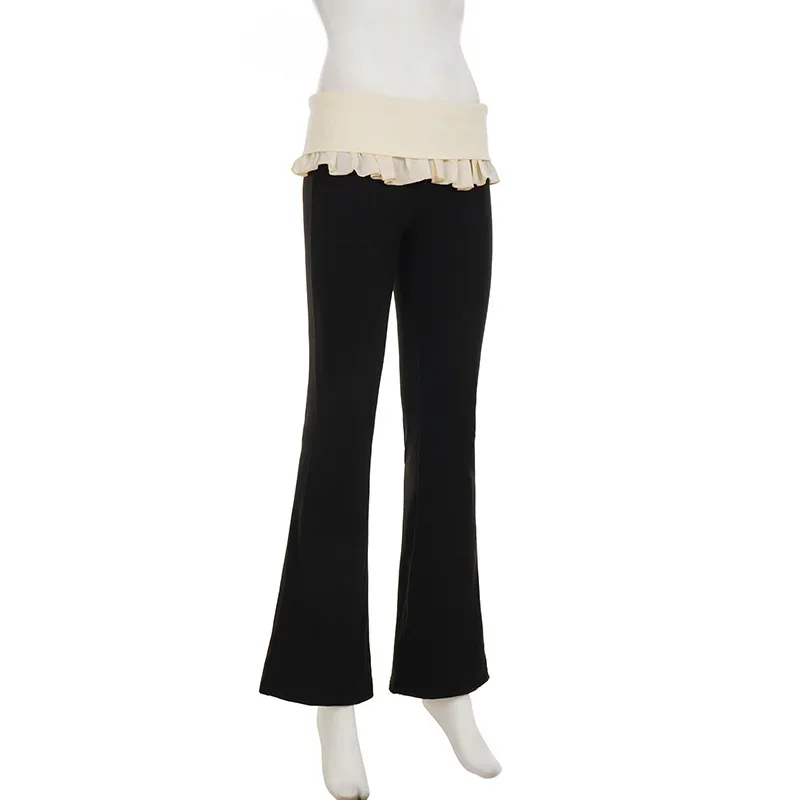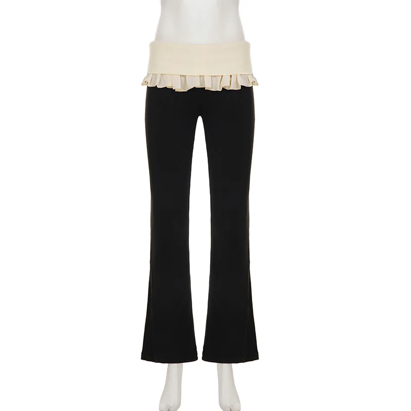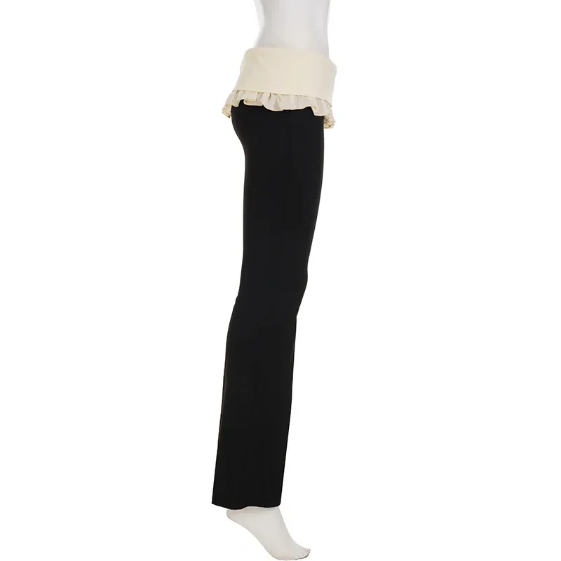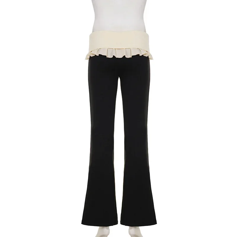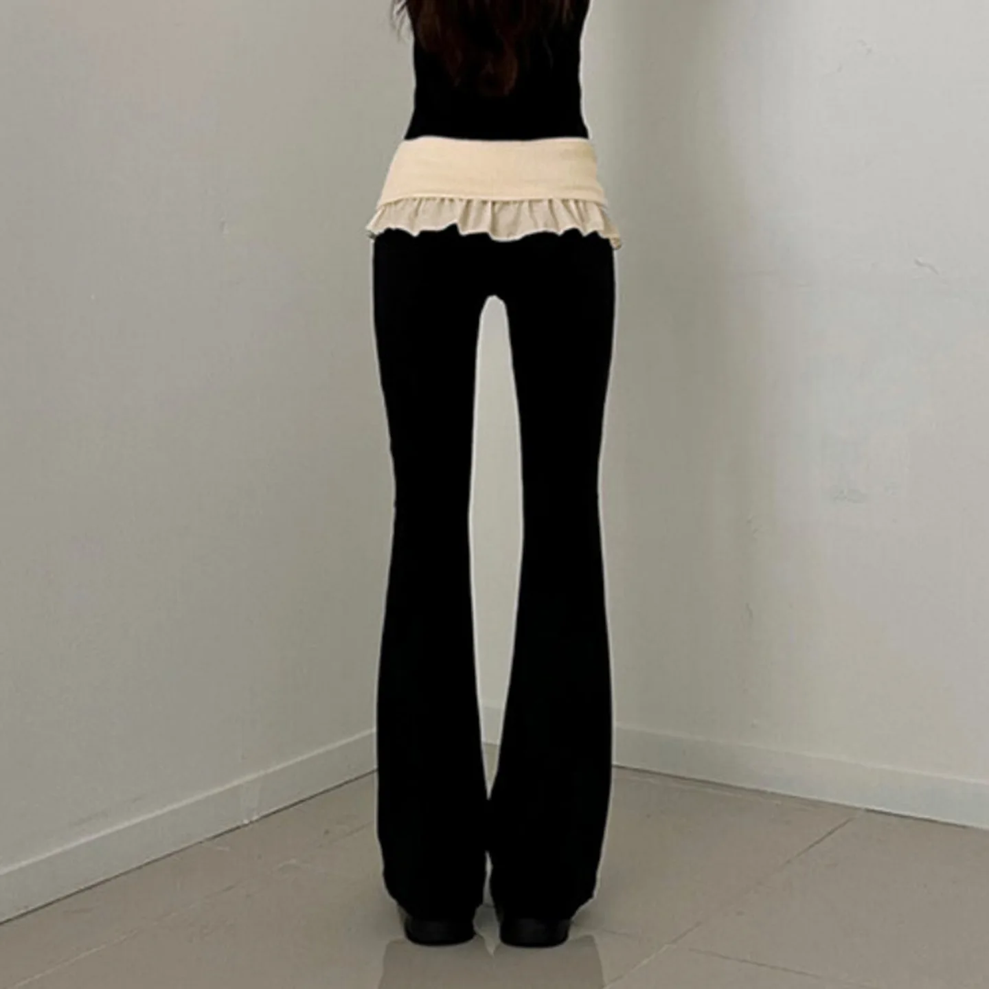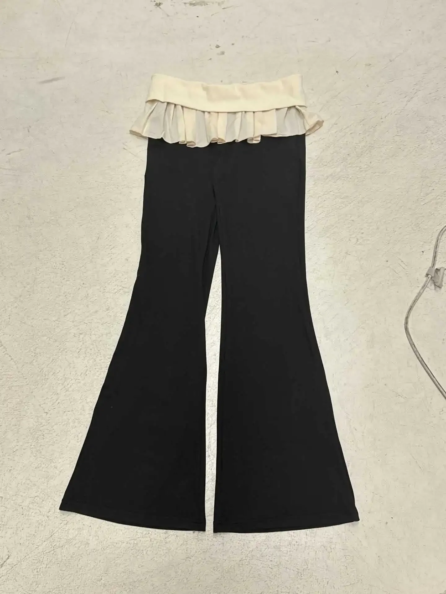 MQTIME - Autumn Color Patchwork Lapel Waist Ruffles Slim Flare Pants Women Fashion Casual Streetwear Boot Cut Trousers All Matching