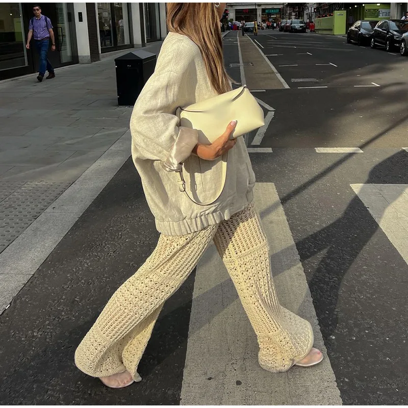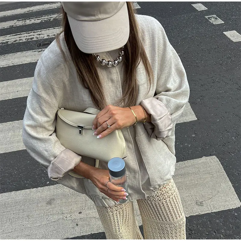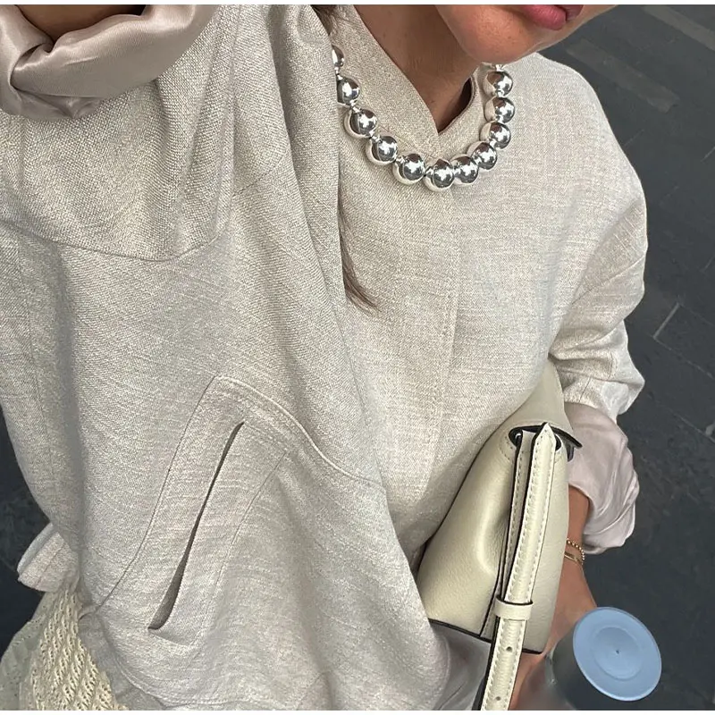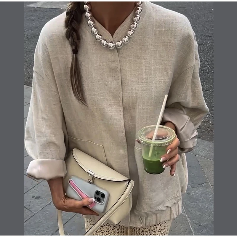 MQTIME  - Autumn Elegant Linen Solid Loose Stand Collar Buckle Jacket 2024 Women's Long Sleeves Coat Office Lady Streetwear Jacket