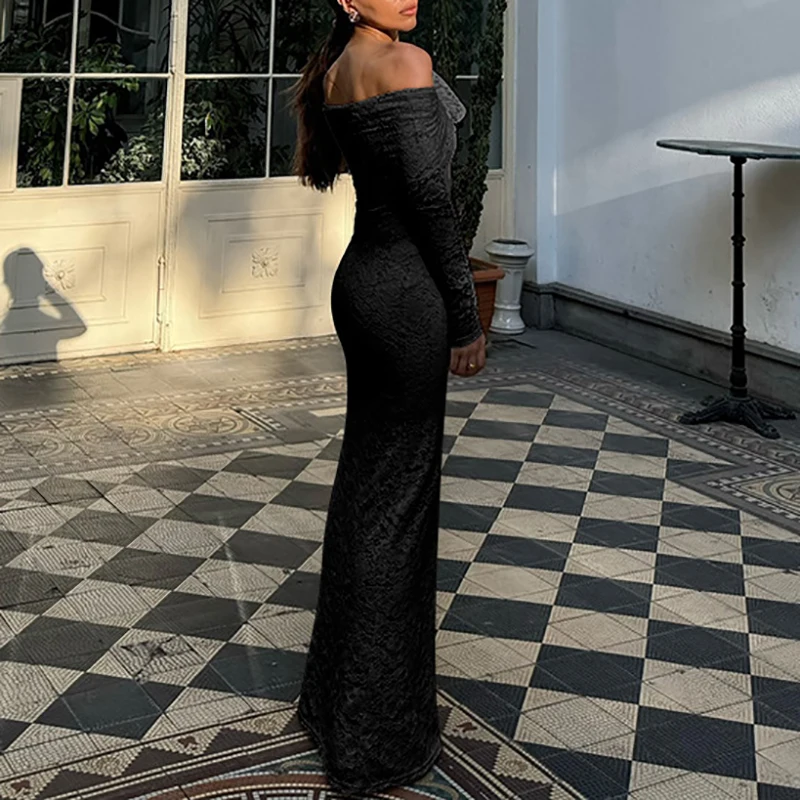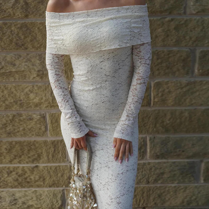 MQTIME - Autumn Elegant Solid Color Maxi Dress Sexy Off Shoulder High Waist Slim A-line Dress Fashion Lace Long Sleeved Women Party Dress