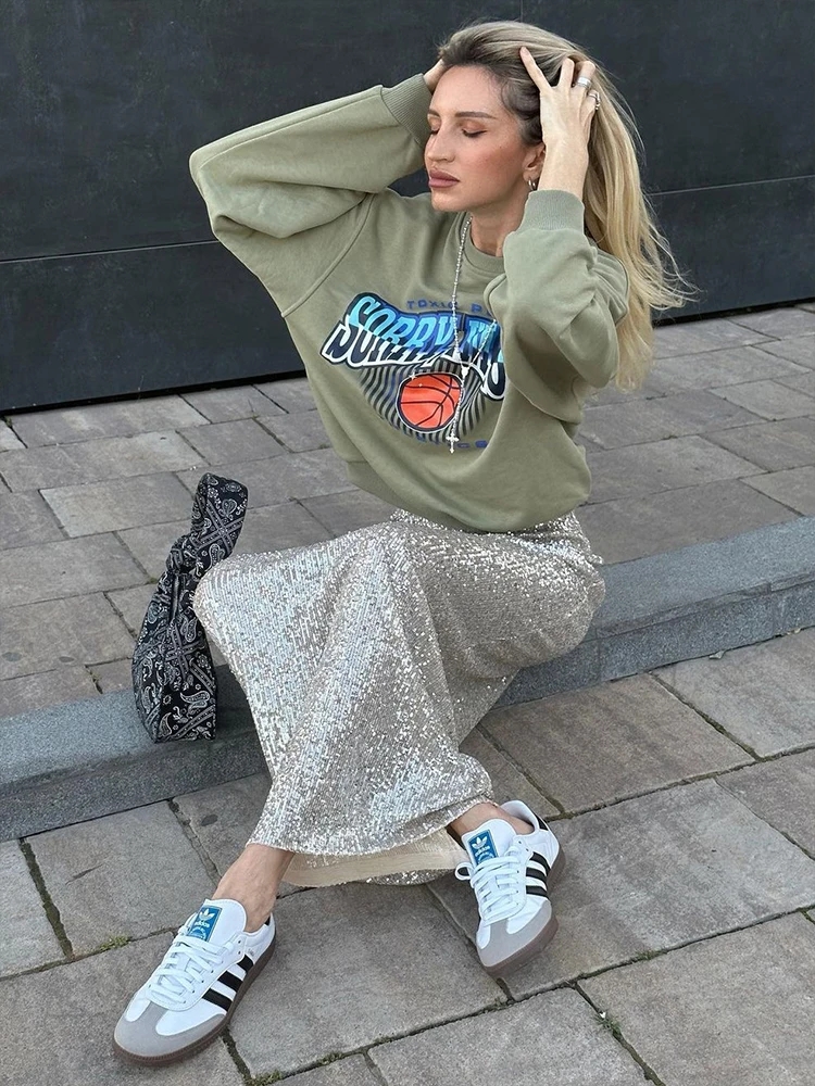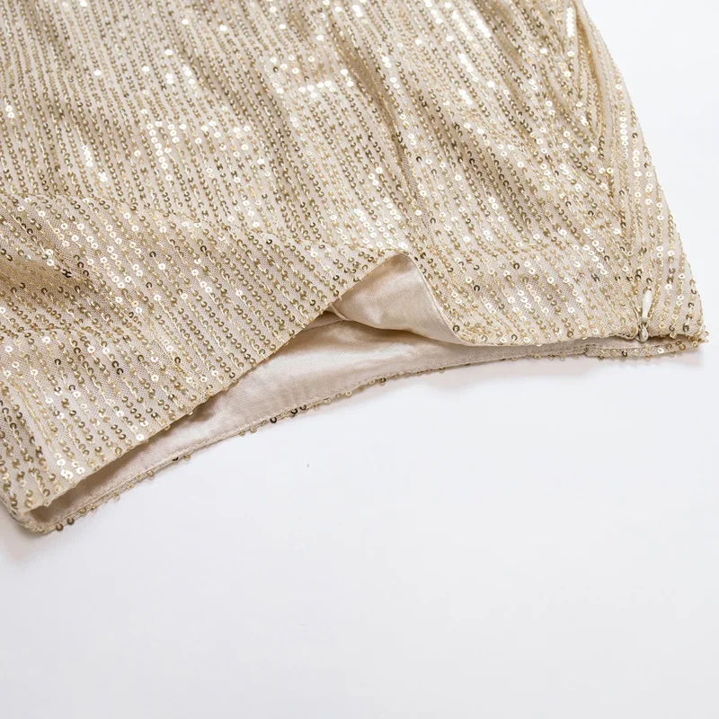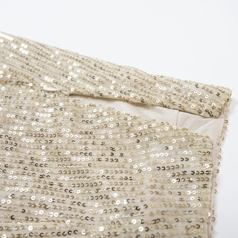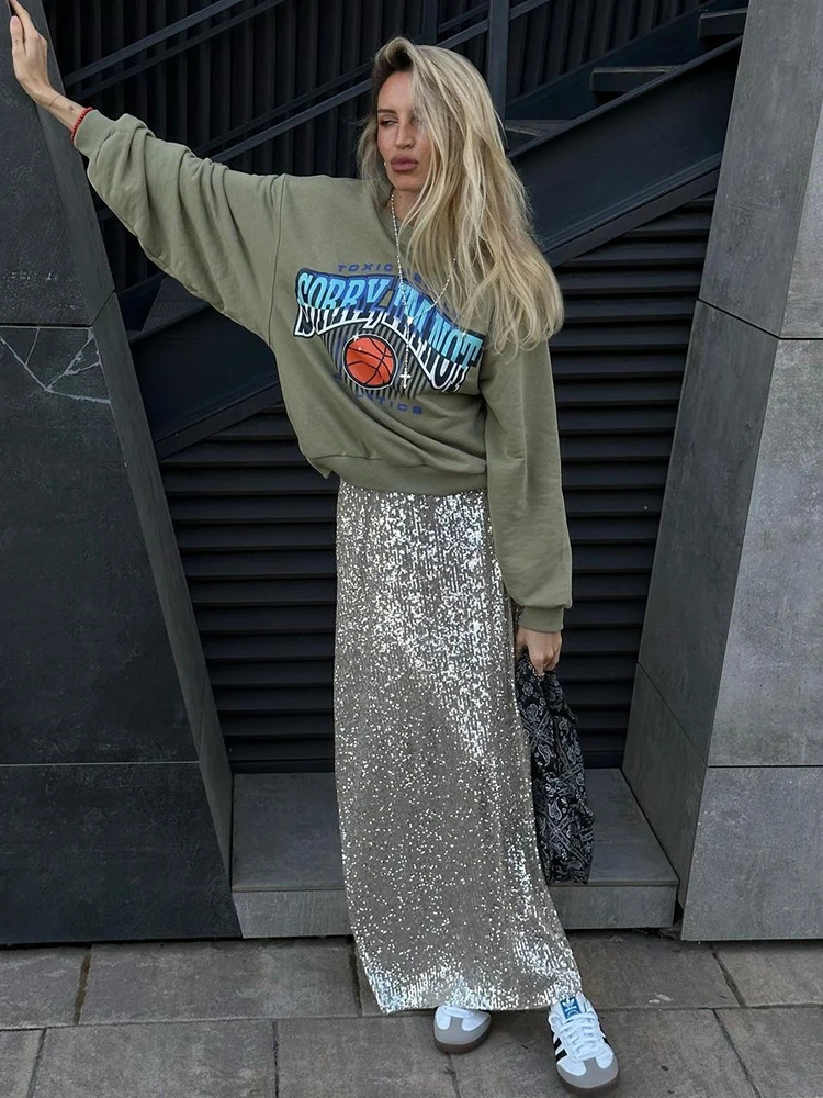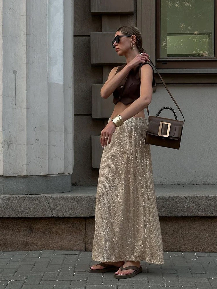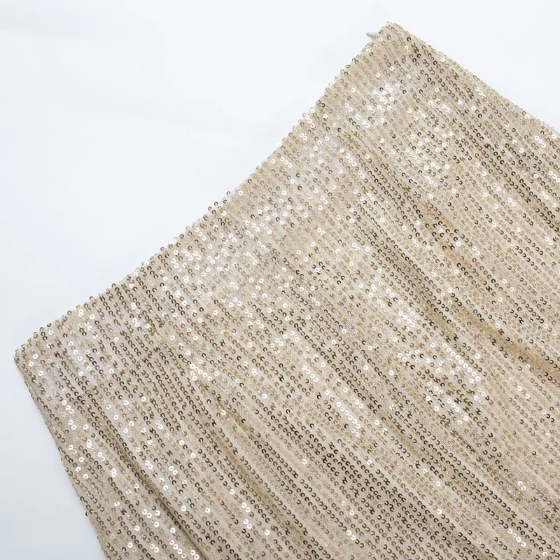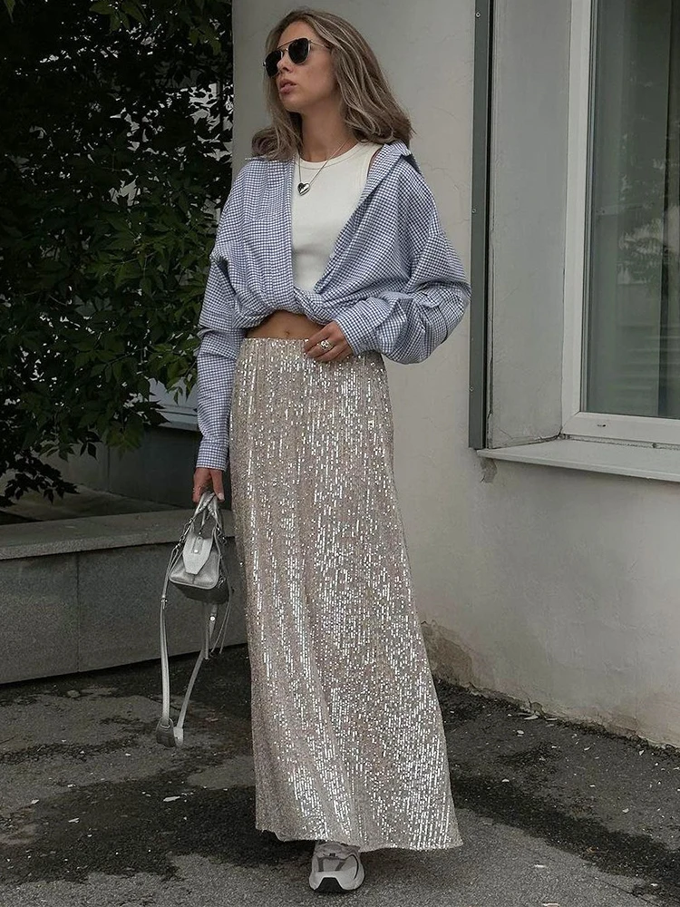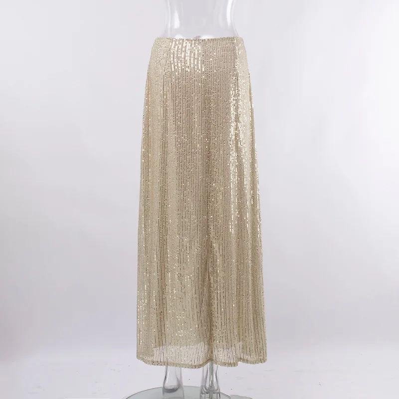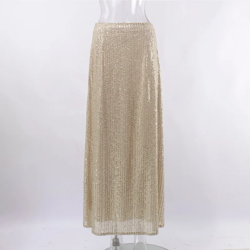 MQTIME - Autumn Winter Women Elegant Maxi Skirts Solid Gold Sequnied High Waist Ladies A-line Flare Long Skirt For Women