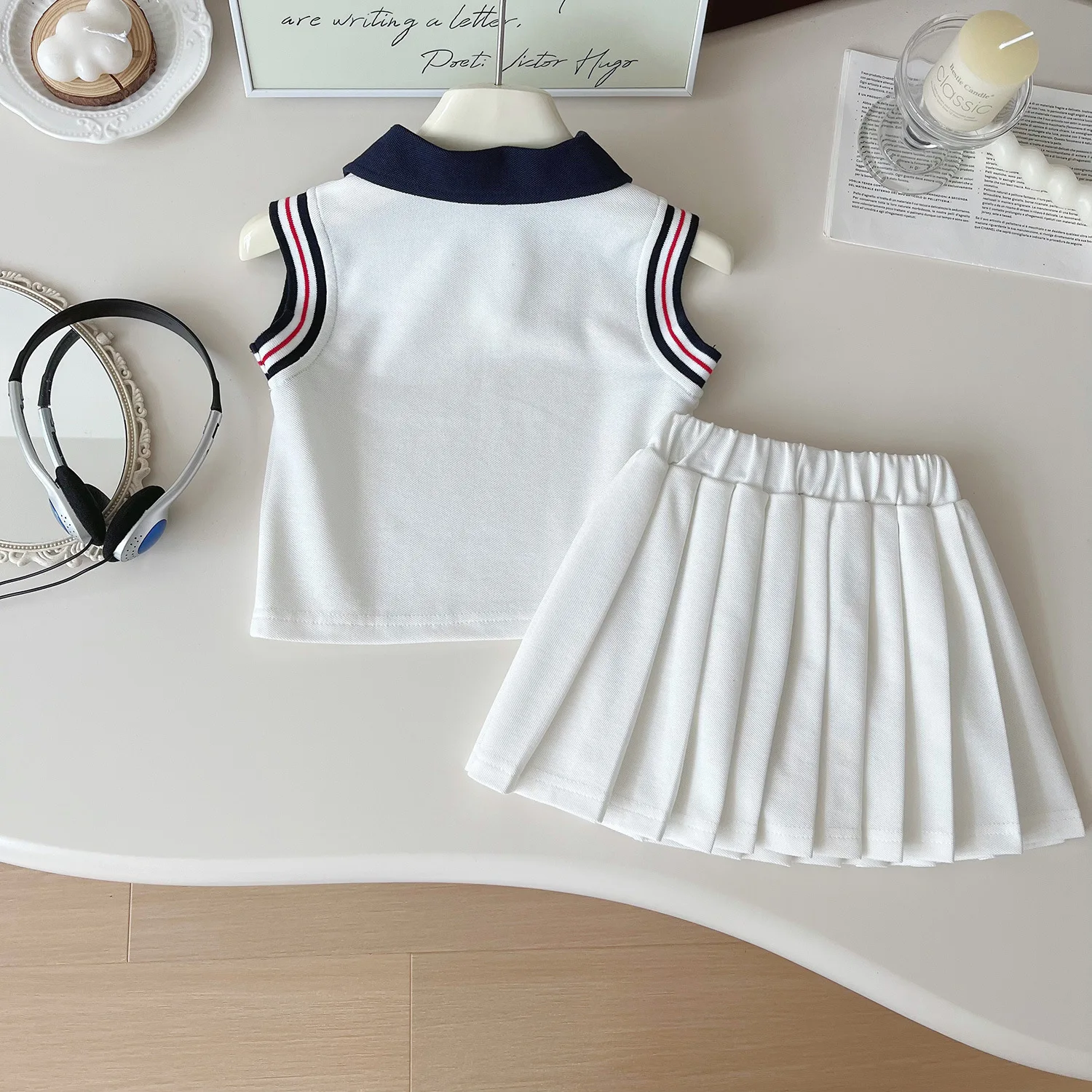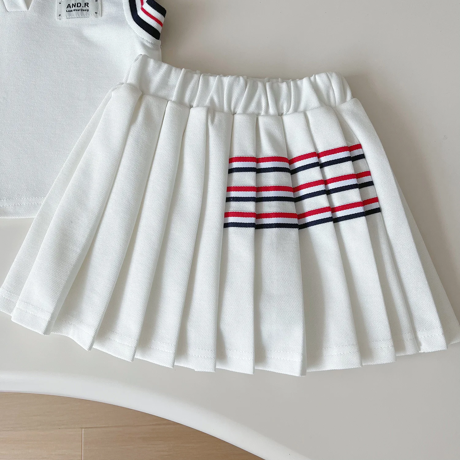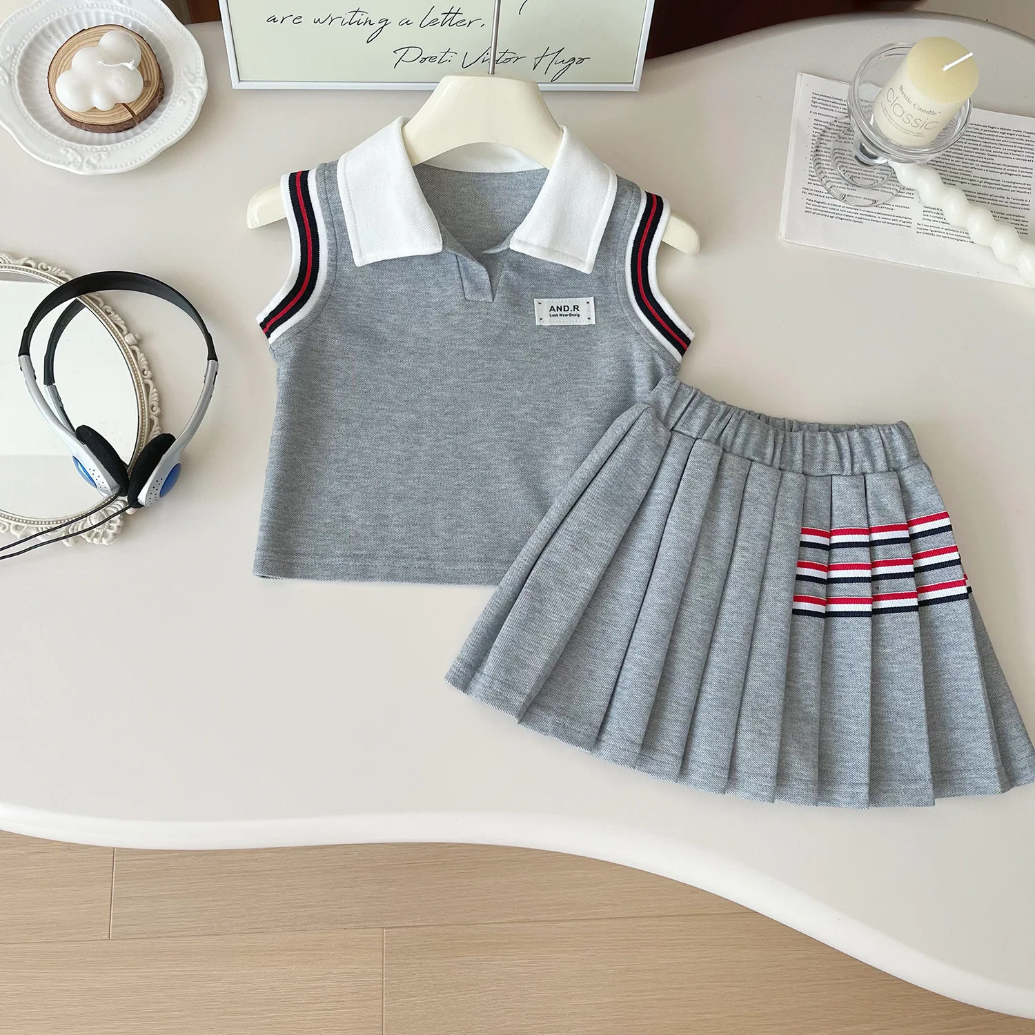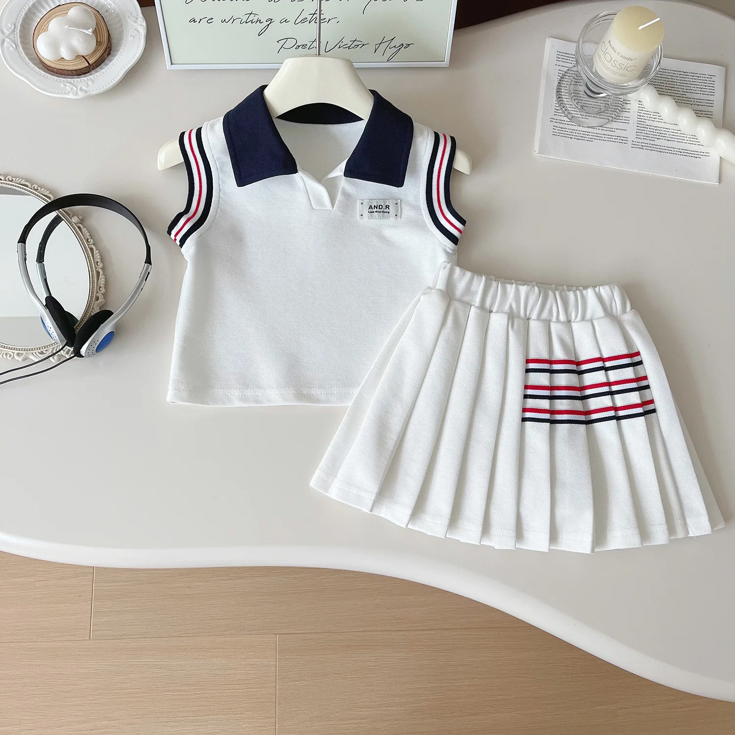 MQTIME - Baby Girl College Style Summer 2PCS Clothes Set Polo Collar Kid Girl Vest Top Set Thin Stylish Stripe Pleated Skirt Belle Outfit