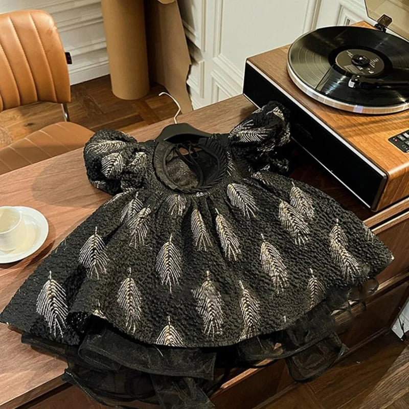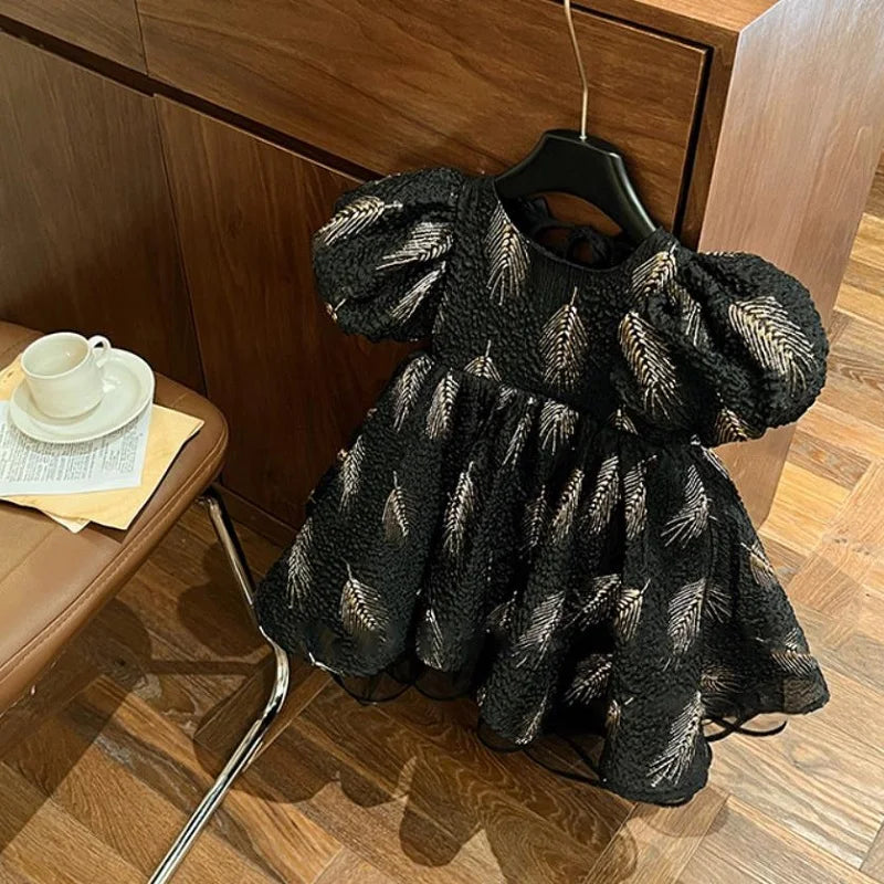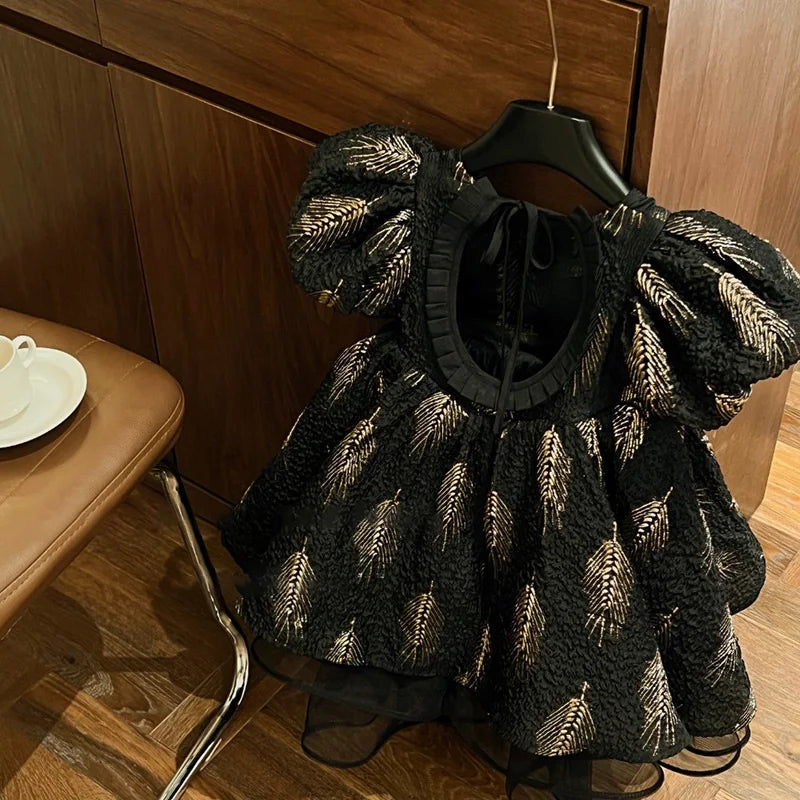 MQTIME - Baby Girl Princess Puff Sleeve Tutu Dress Gold Feather Infant Toddler Vintage Vestido Party Pageant Birthday Baby Clothes 1-12Y
