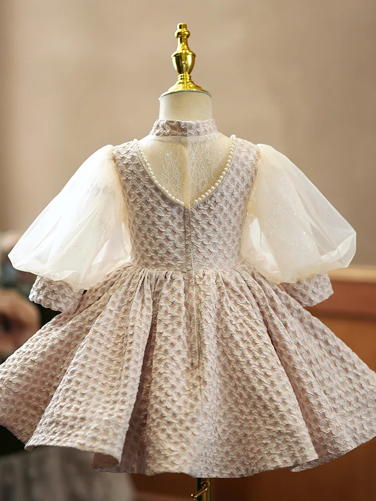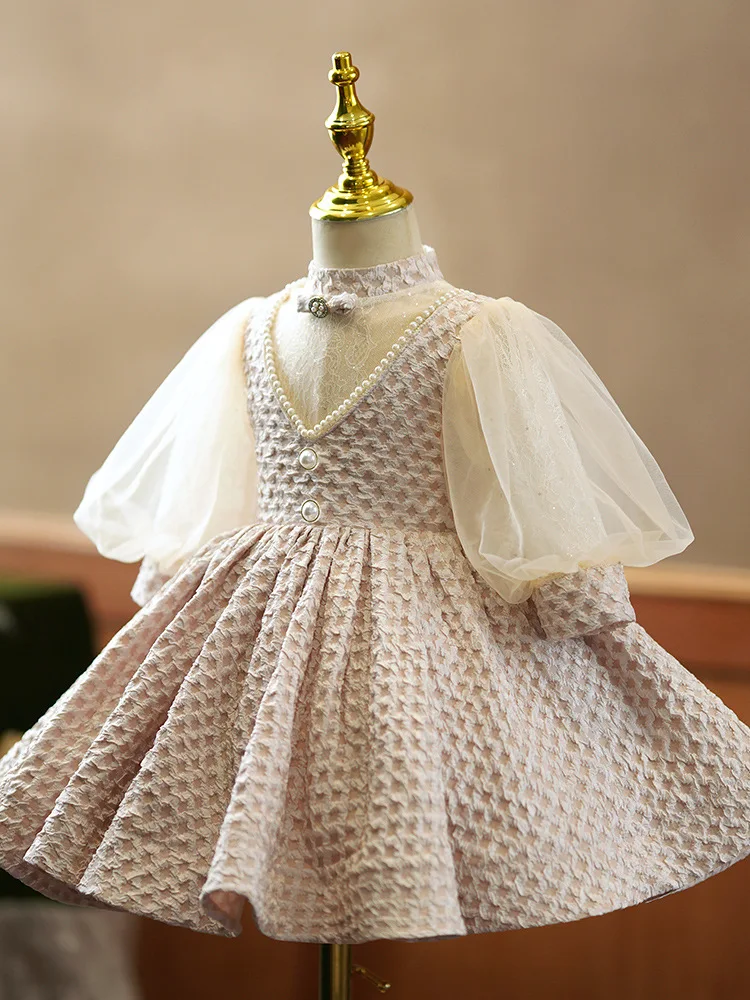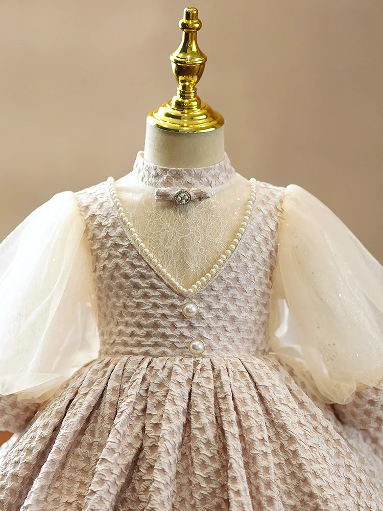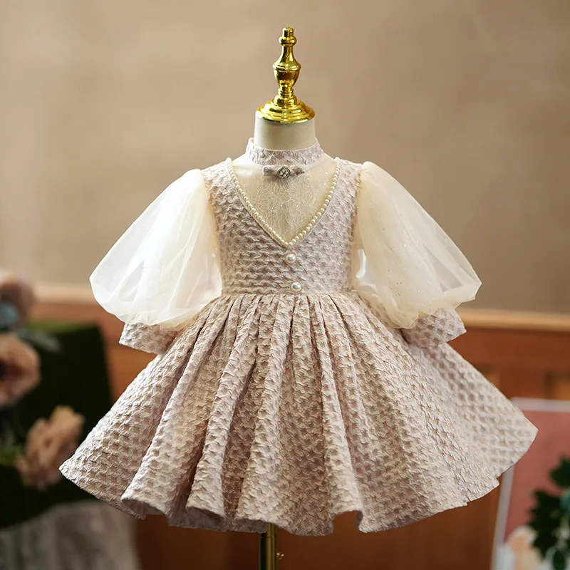 Mqtime Baby Girls Princess Ball Gowns Infant Girl Patchwork Lace Puff Sleeves Beading Midi Dress Children Elegant Cute Party Wear