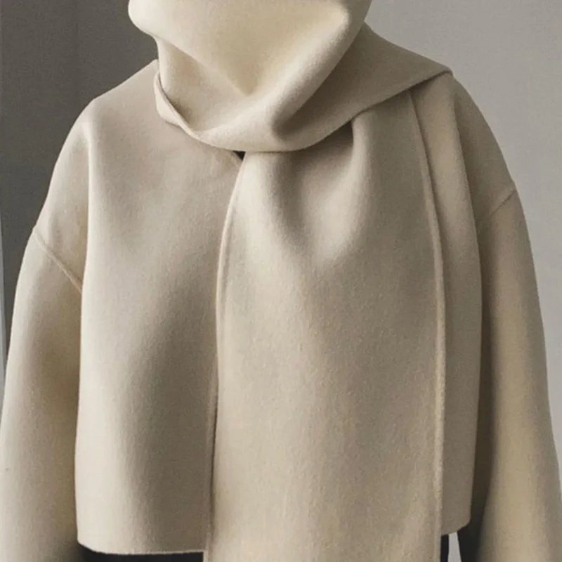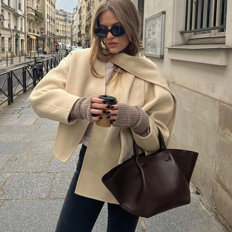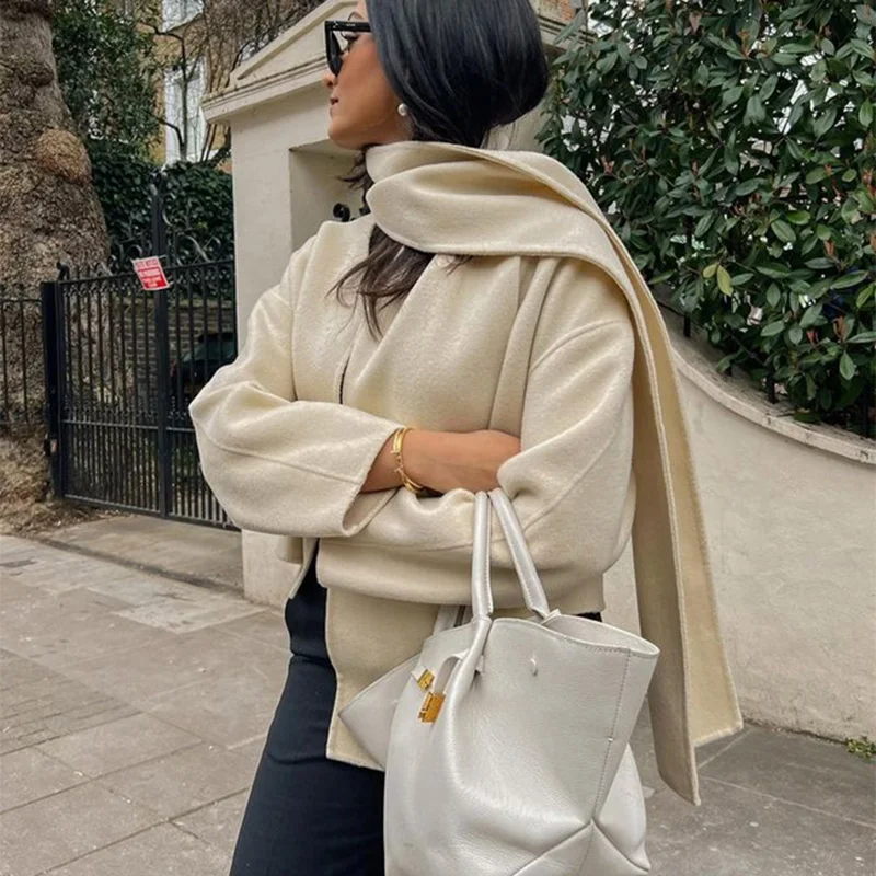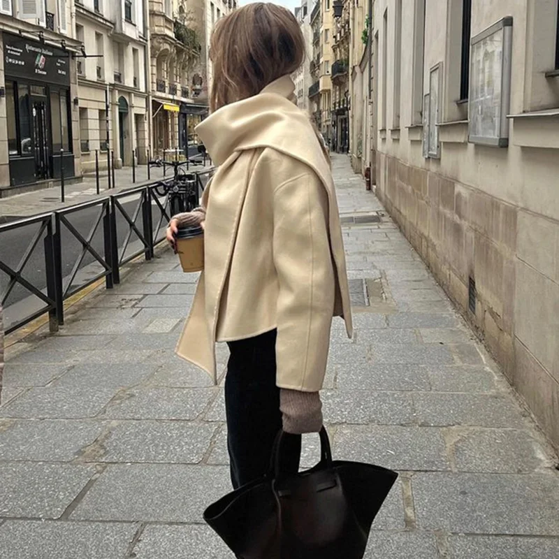Mqtime Beige Woolen Scarf Collar Cropped OverCoat Women Loose Long Sleeve Cardigan Coat Autumn New Elegant Female Streetwears