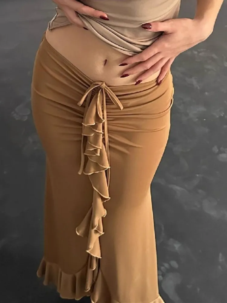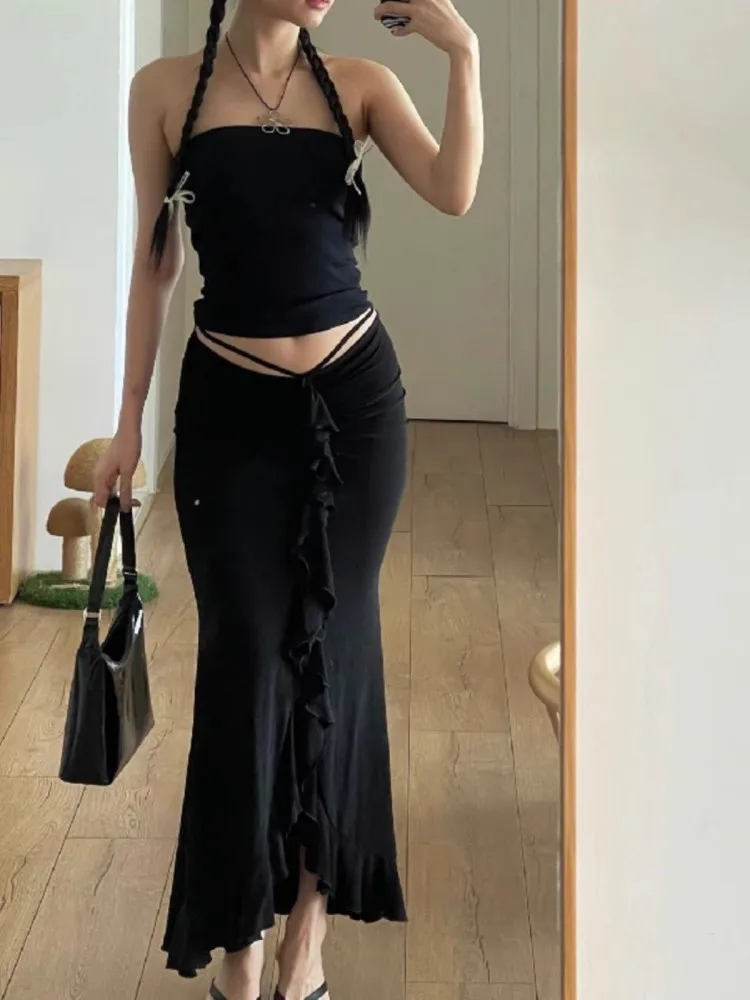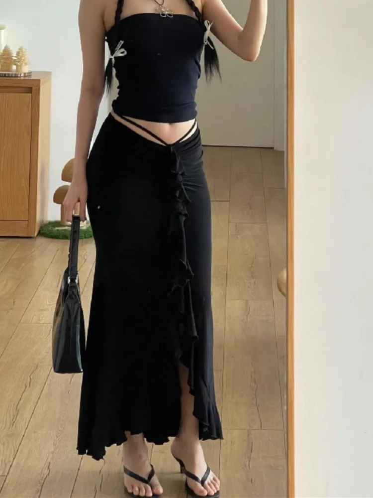 MQTIME - Black High Waisted Split Skirt For Women With A Unique Ruffled Edge, Slim Fit, Fishtail And Buttocks Long Skirt