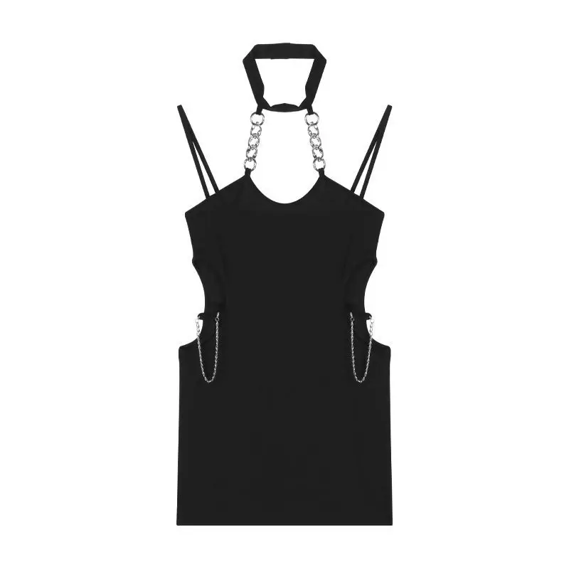 MQTIME - Black hollowed out camisole dress for women, summer chain hanging neck, spicy girl, pure desire style, sexy sleeveless buttocks