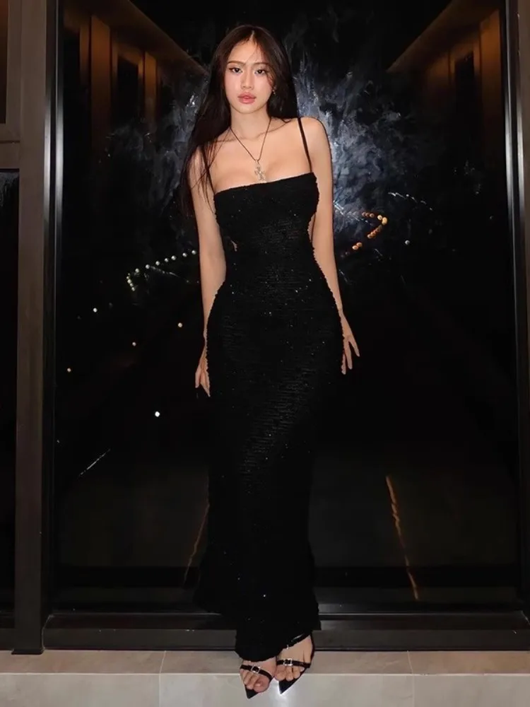 MQTIME  -  Black Sequin Backless Suspender Dress For Women'S French Haute Couture Buttocks Wrapped Dress Long Skirt