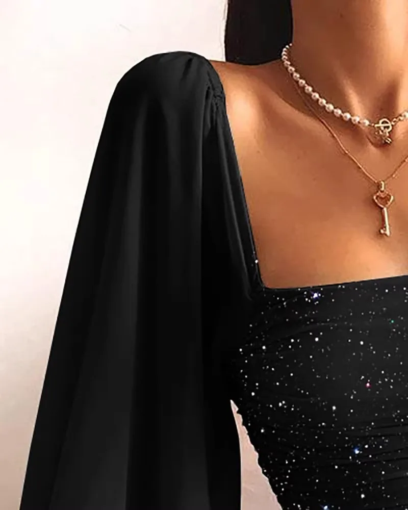 MQTIME - Black Square Neckline Long Sleeved Dress For Women With A Design Sense Of Sparkling Lantern Sleeves Pleated Tight Fitting Dress