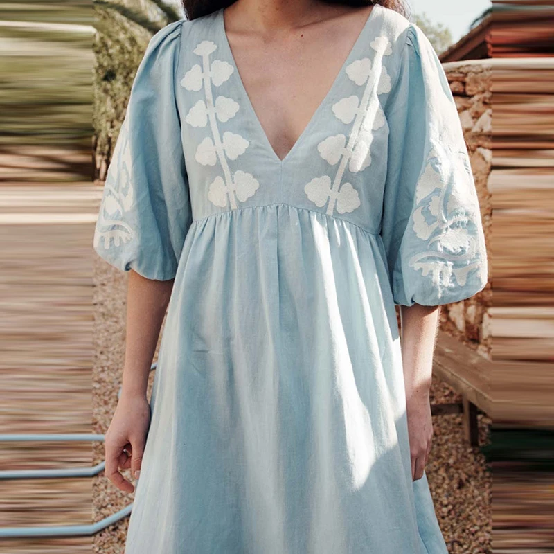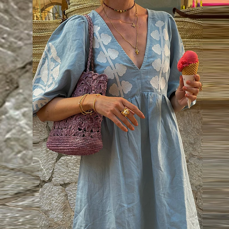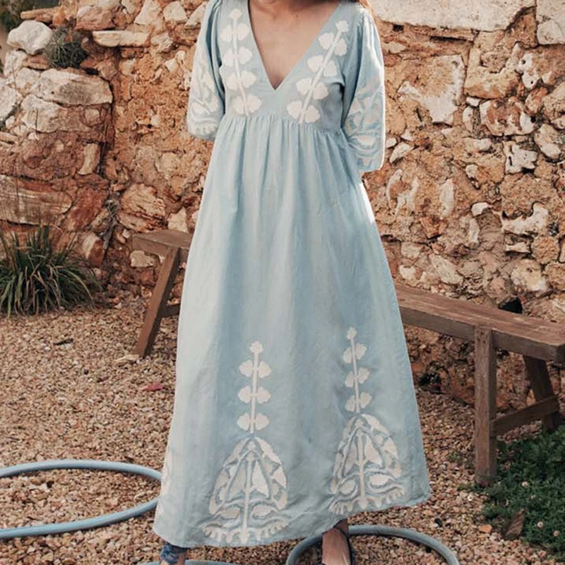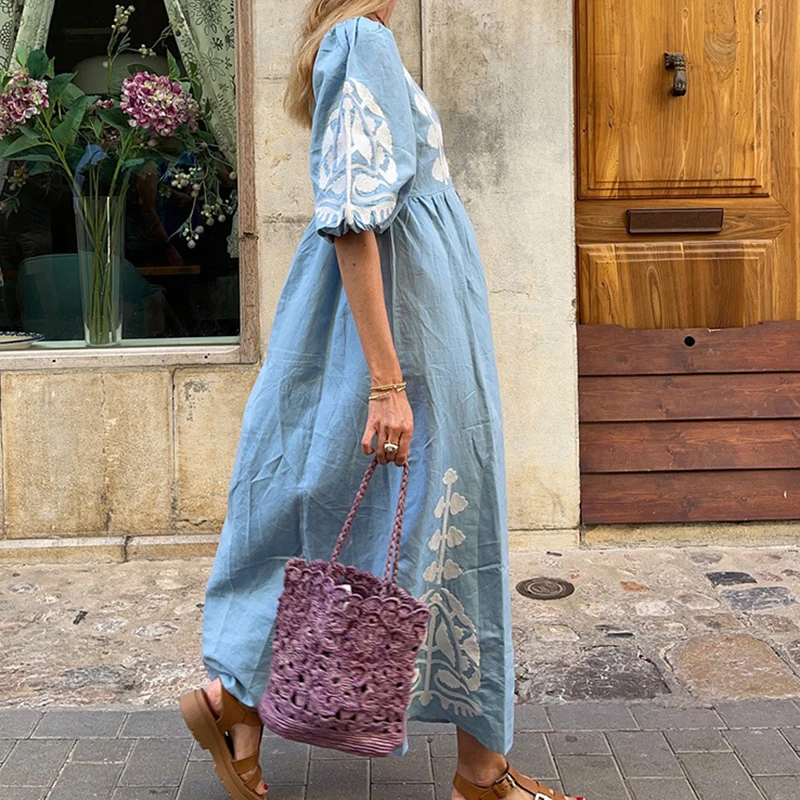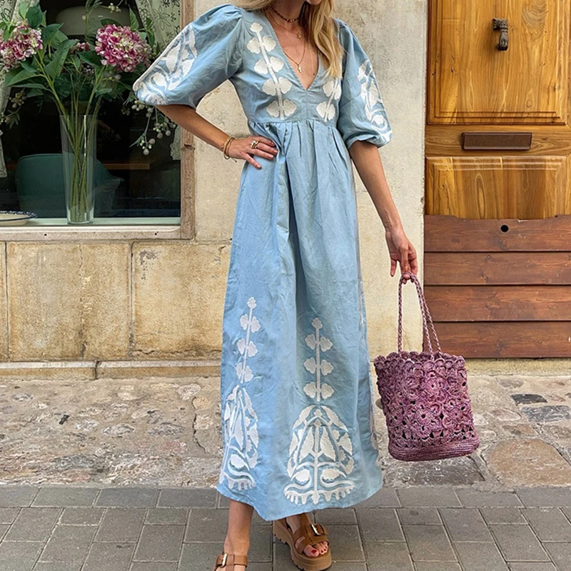 MQTIME  -  Blue Printed Pleats Women's Bohemian Dress Casual Loose Short Sleeved Summer Long Dress Sexy Hollow Backless Lace Up Beach Dress