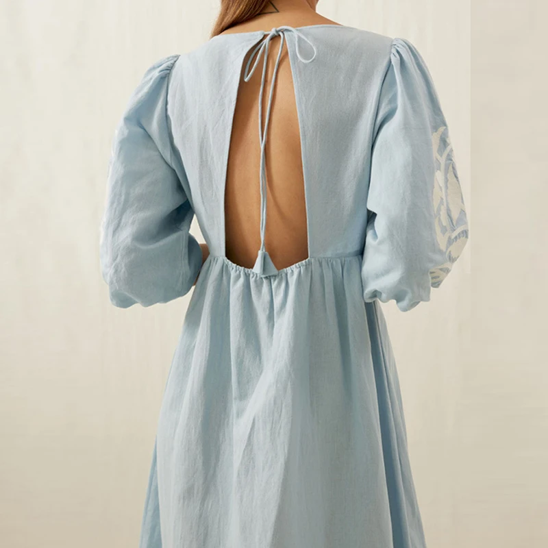 MQTIME - Blue Printed Pleats Women's Bohemian Dress Casual Loose Short Sleeved Summer Long Dress Sexy Hollow Backless Lace Up Beach Dress