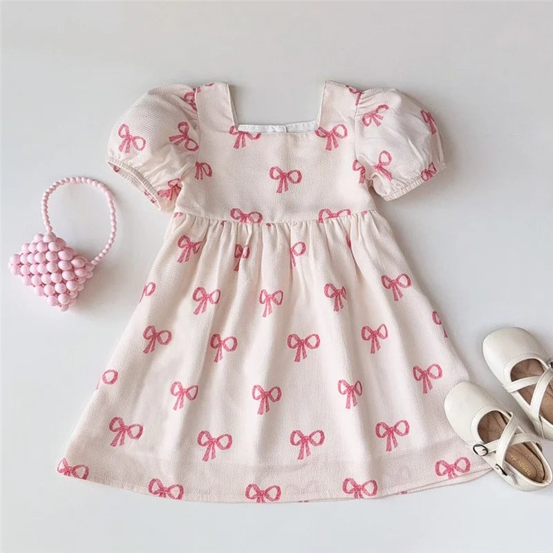 MQTIME - Bow Print Princess Dress Girls Puff Sleeved Dresses Summer New Casual Sweet Kids Clothes Bowknot Print Dress 2-8 Years Wear