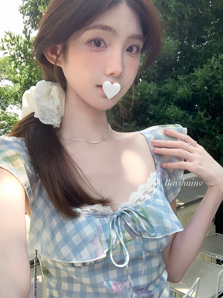 MQTIME - Casual Beach Party Mini Dress Women Sweet Flower Print Sleeveless Pleated Floral Dress Lace Patchwork Fashion Elegant Clothing