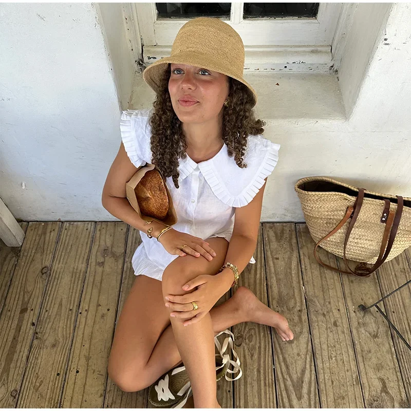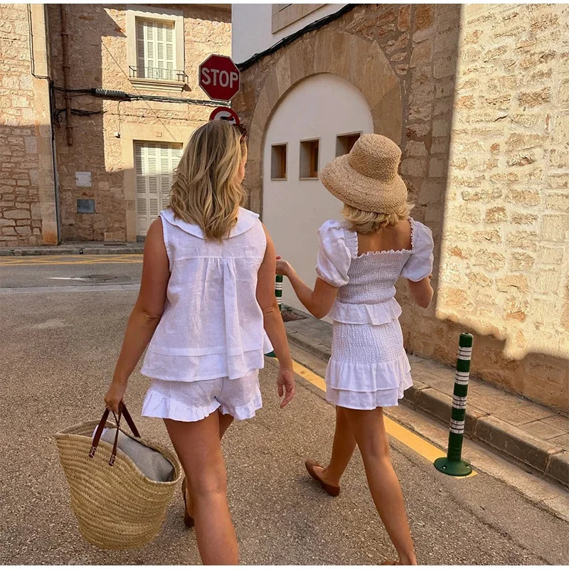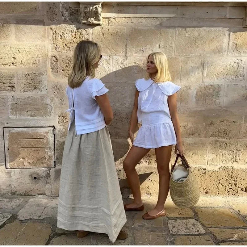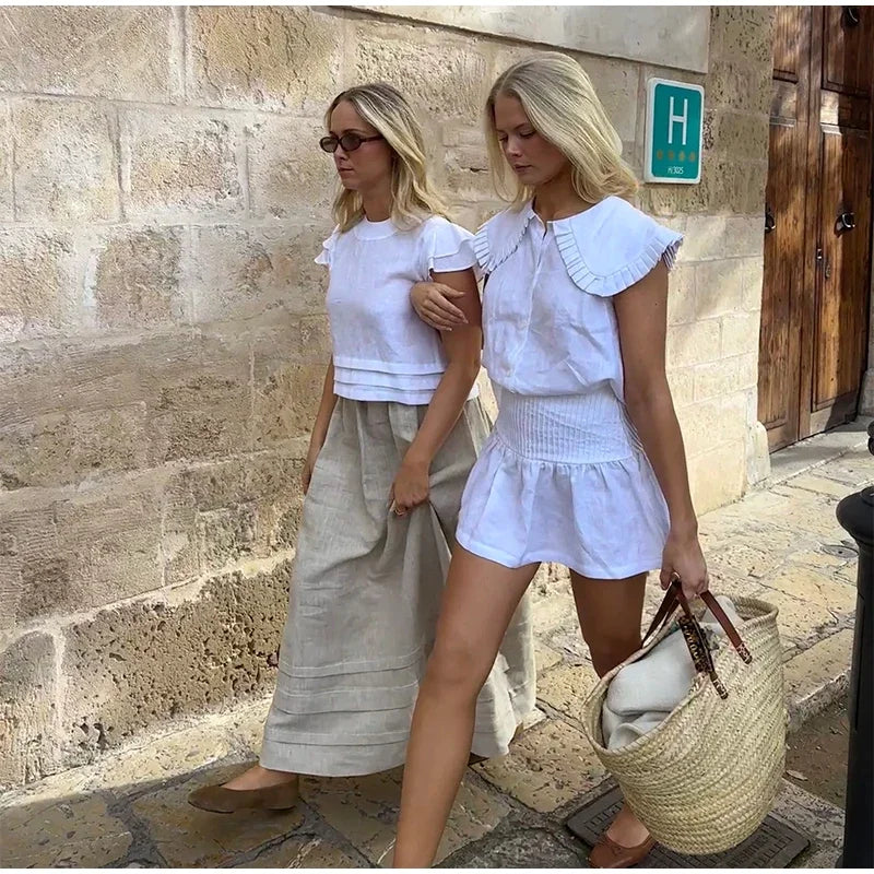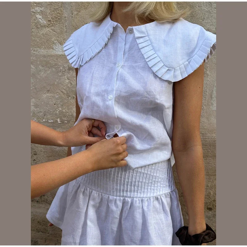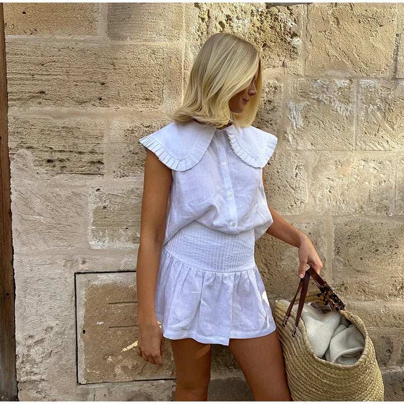 MQTIME - Casual Doll Collar Shirt Skirt Sets Women Cotton Linen Buttons Sleeveless Top Pleated A-line Mini Skirts 2025 Summer Lady Suit