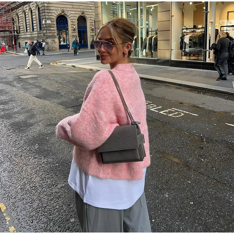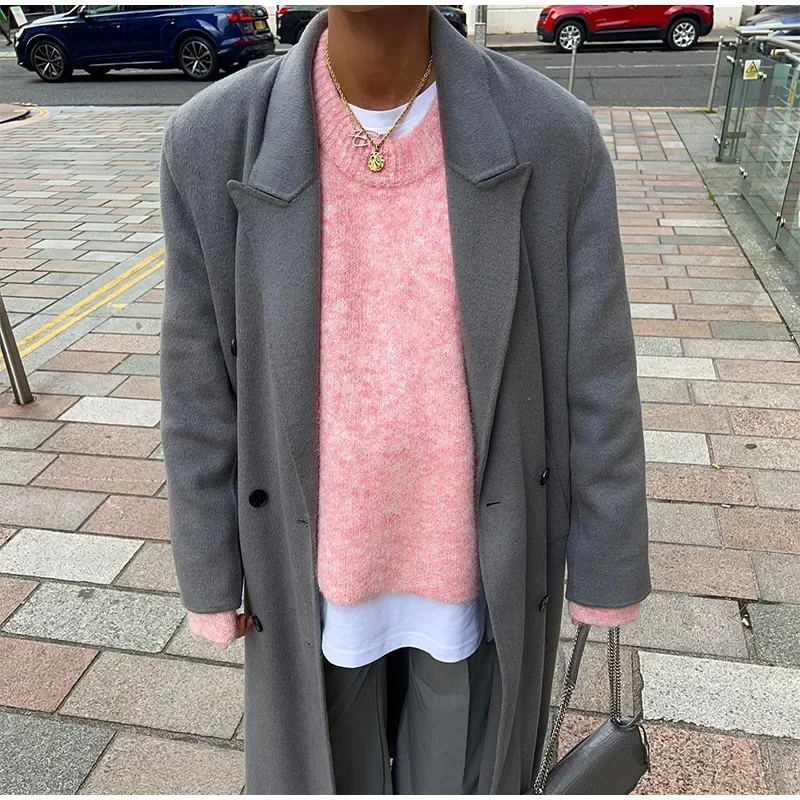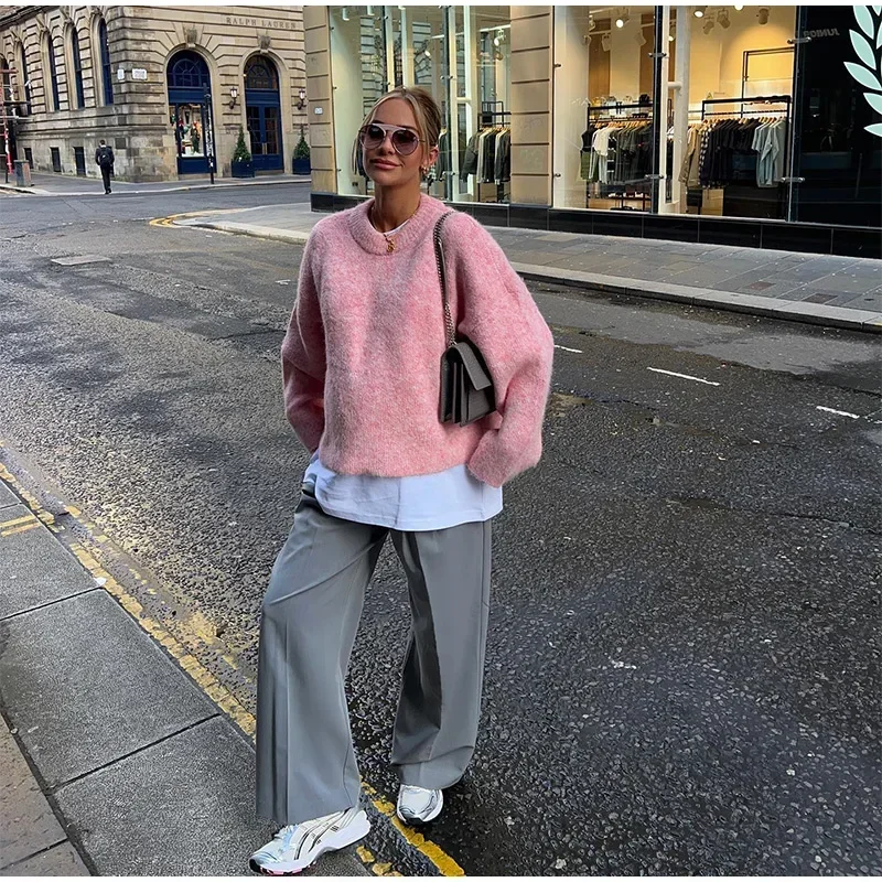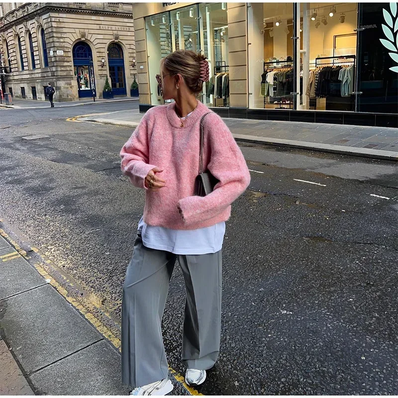 MQTIME - Casual Pink Women Cashmere Knitted Sweater Drop Shoulder Round Neck Knit Pullover New Autumn Lady Loose Fit Long Sleeve Jumper