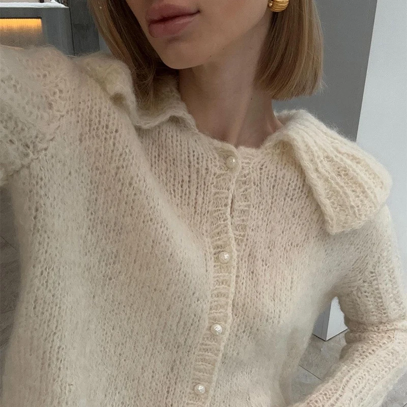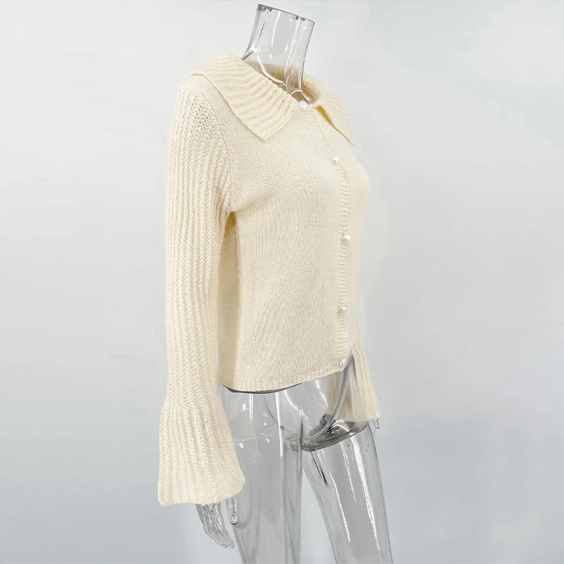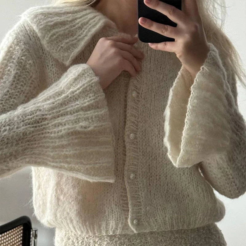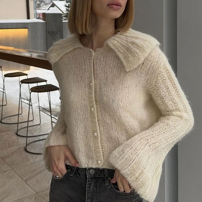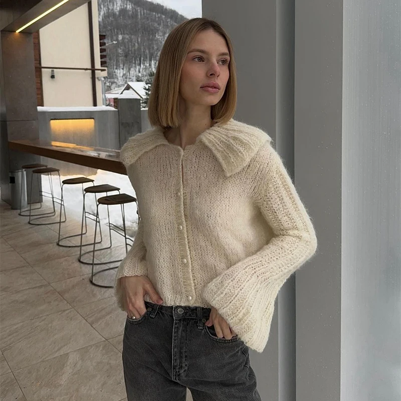 MQTIME - Chic Doll Collar Knitted Cardigan for Women Solid Single Breasted Female Sweater 2024 Autumn Long Flare Sleeves Lady Knitwear