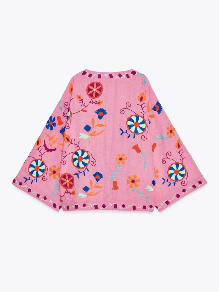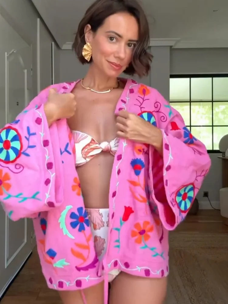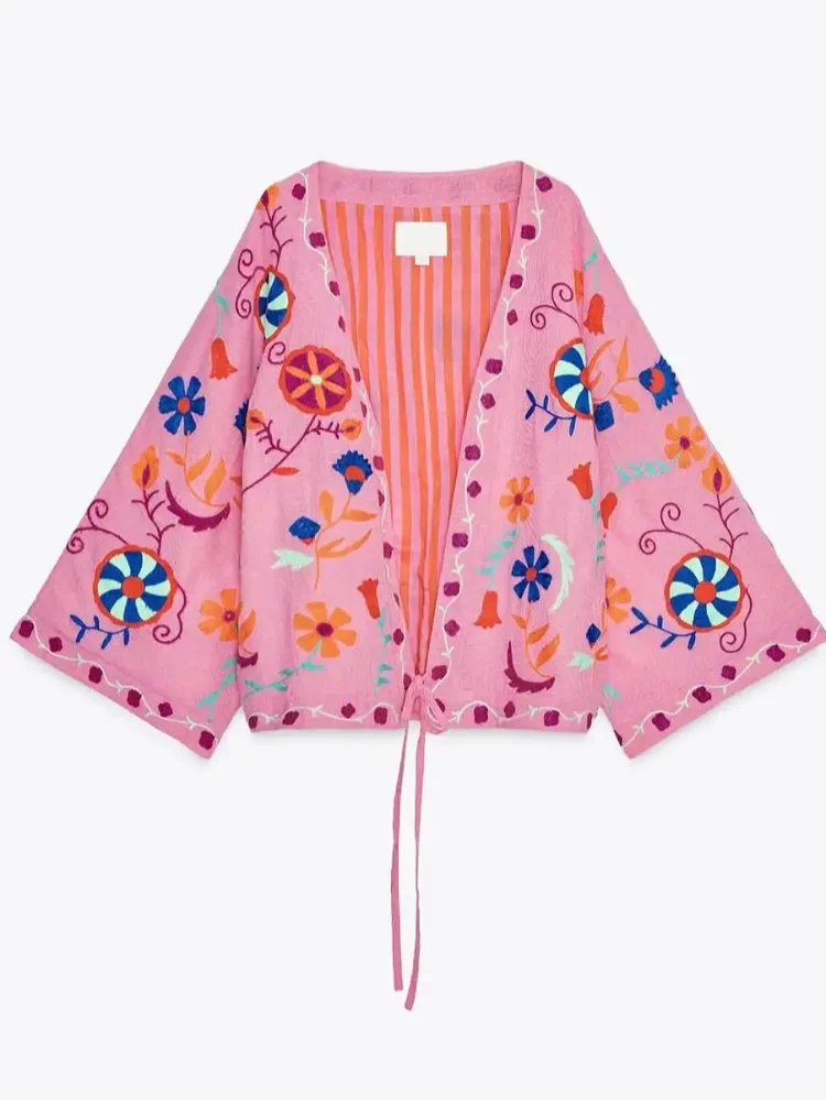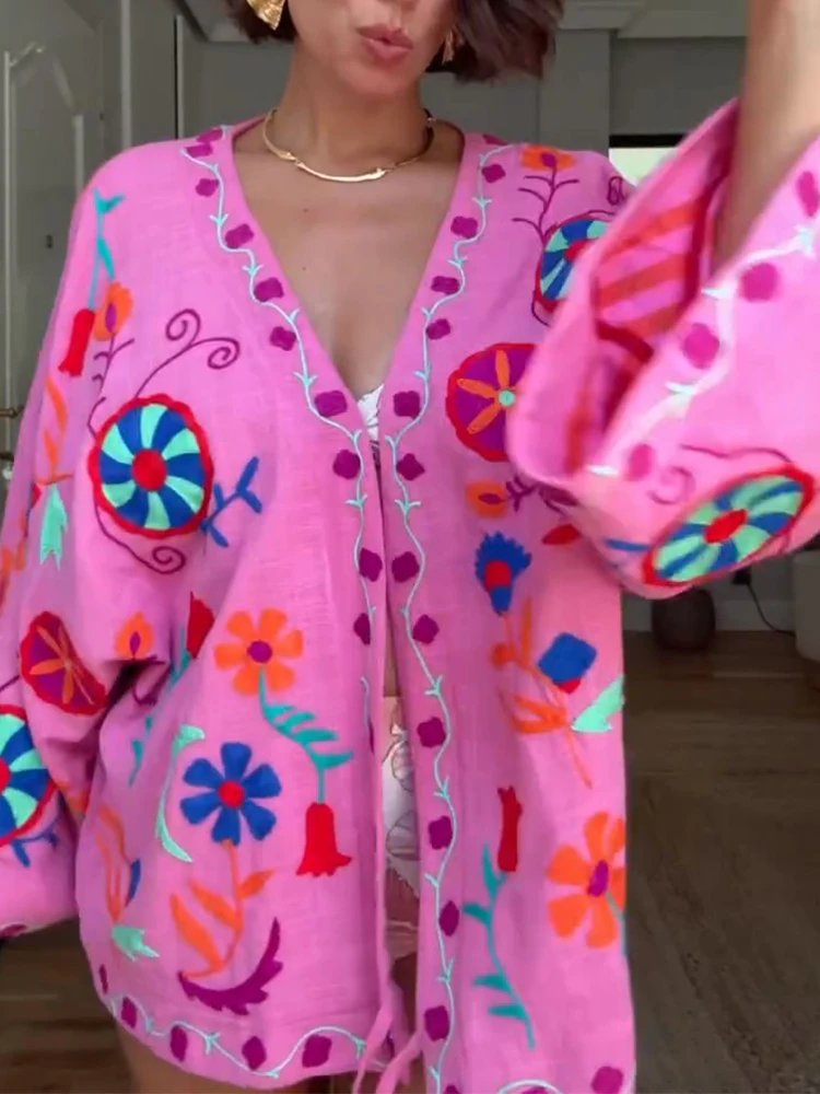 MQTIME - Chic Embroidered Print Women's Jacket Fashion V-neck Long Sleeved Lace Up Female Coats Autumn Lady Street New Outerwear