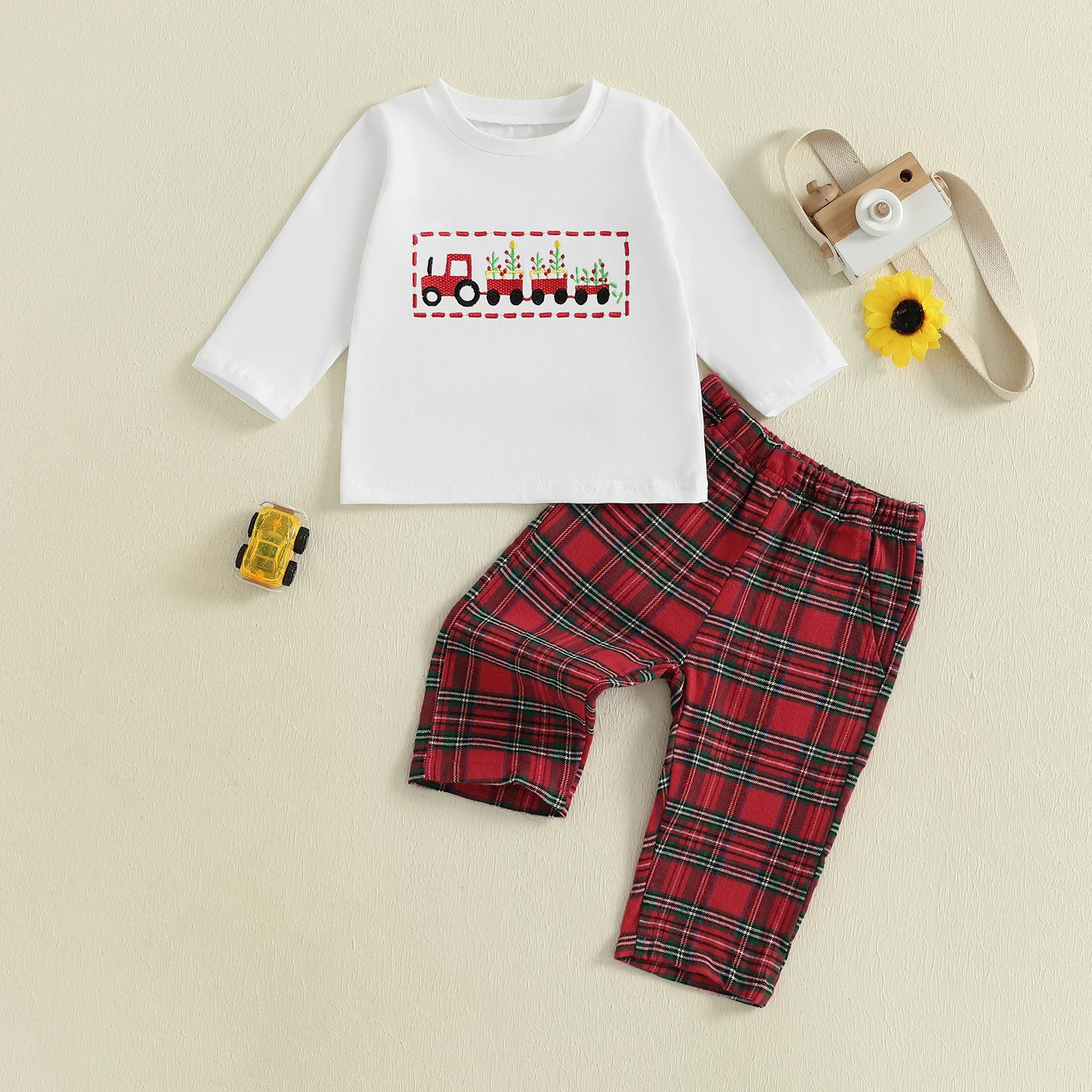 MQTIME - Children s Autumn 2-Piece Outfit with Long Sleeve Truck Embroidered Top and Plaid Pants Set O Neck Design for Boys