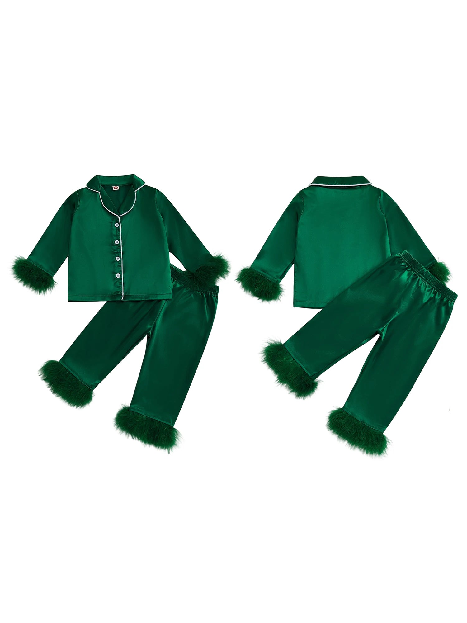 MQTIME - Children s Satin Pajama Set with Plush Trim Long Sleeve Button-up Shirt Elastic Waist Pants - 2 Piece Sleepwear Ensemble