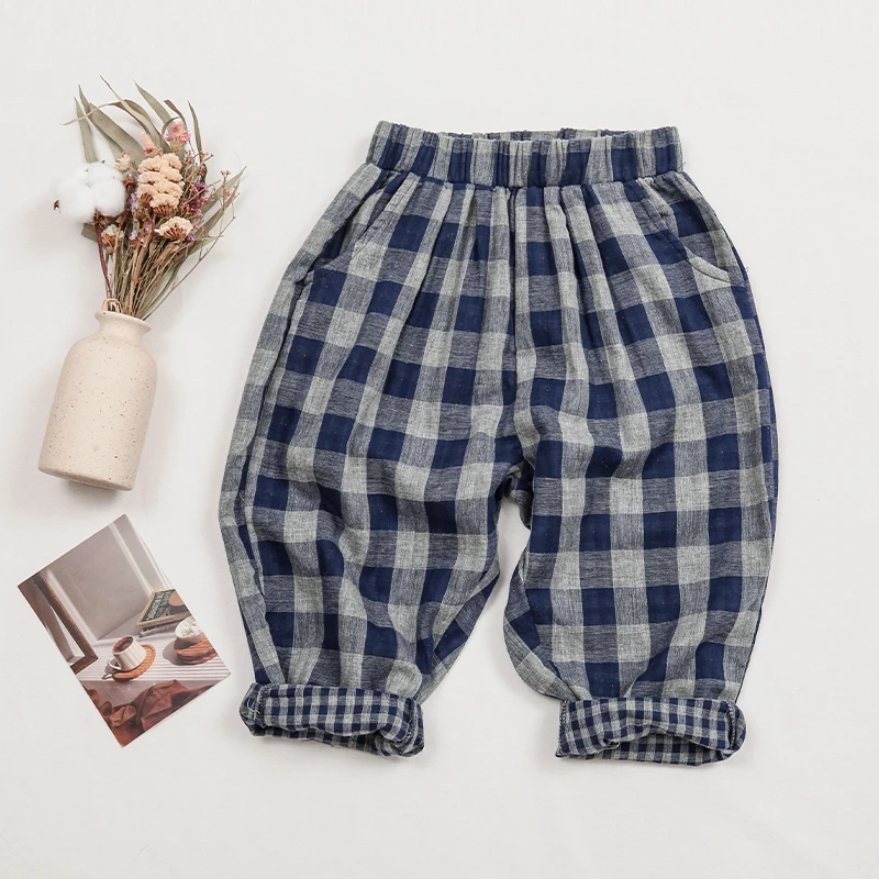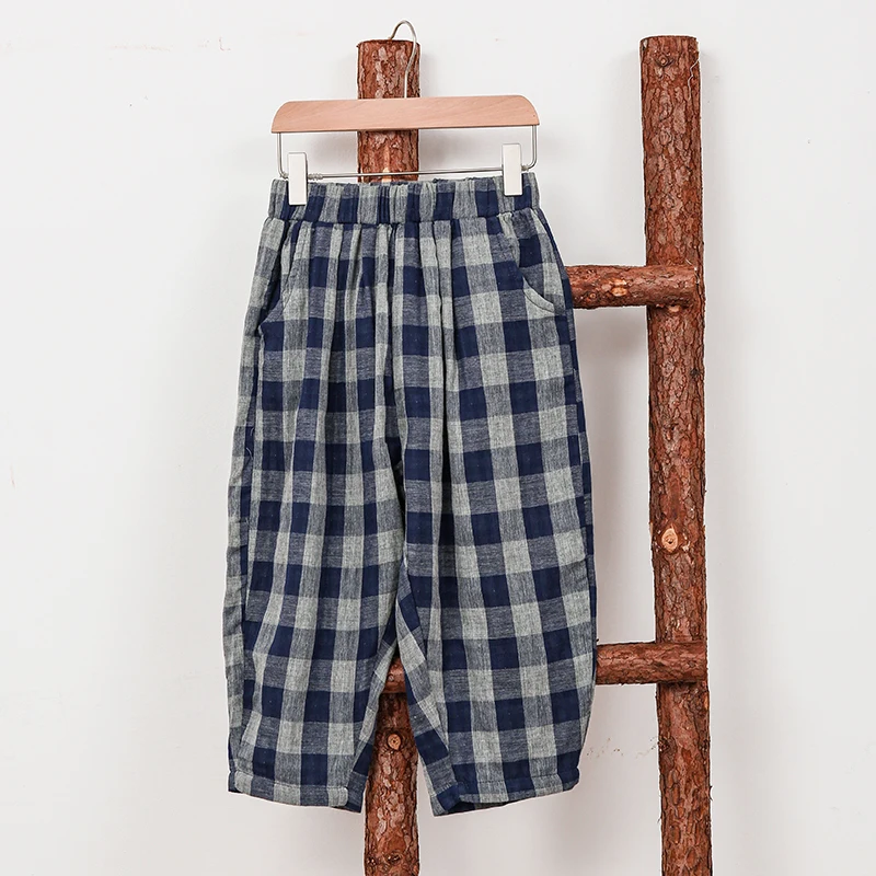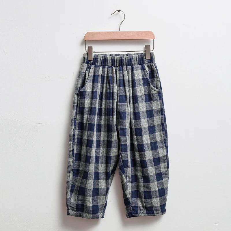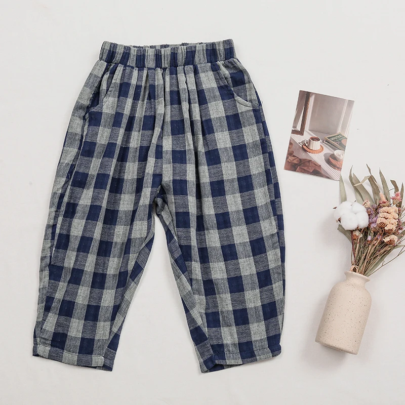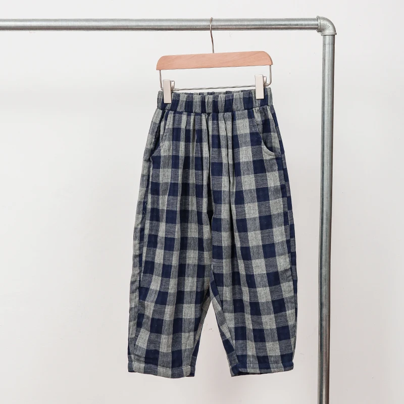 MQTIME - Children's Retro Blue Plaid Trousers Spring Autumn New Korean Boys And Girls Double-Layer Cotton Casual Harem Pants WTP121
